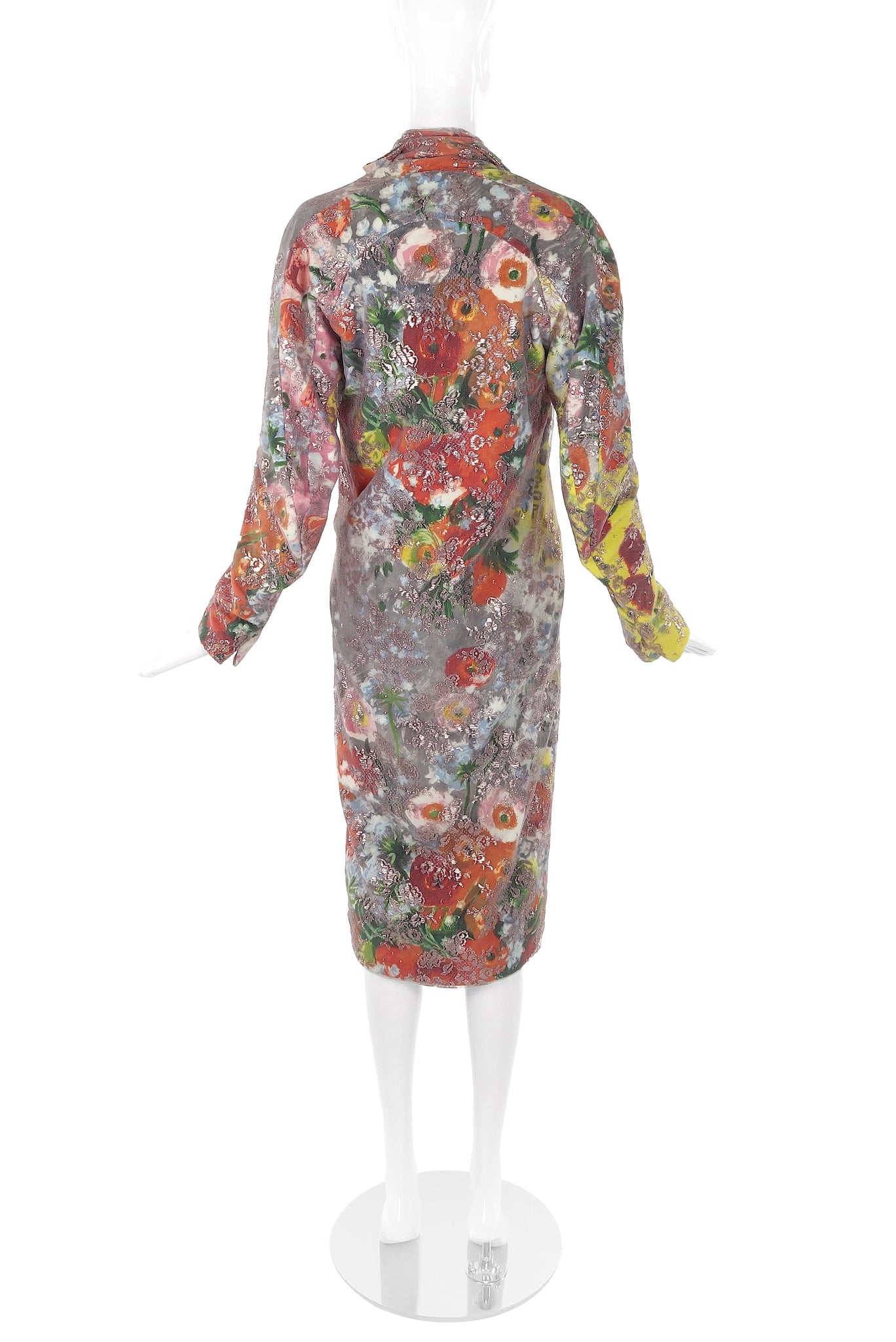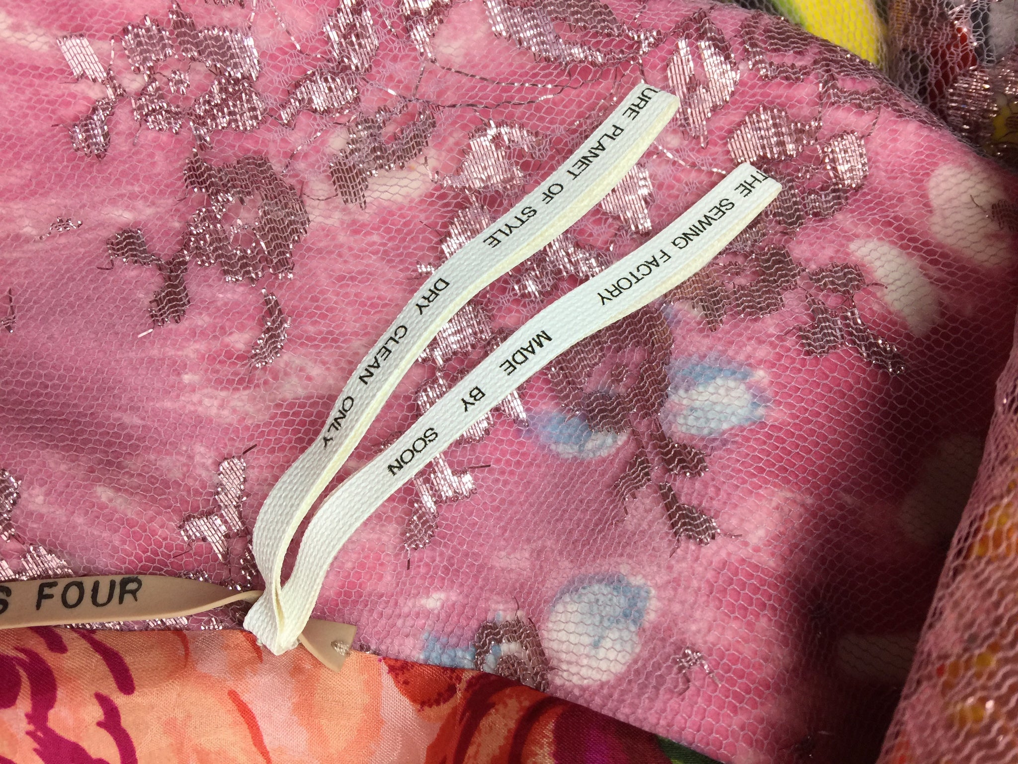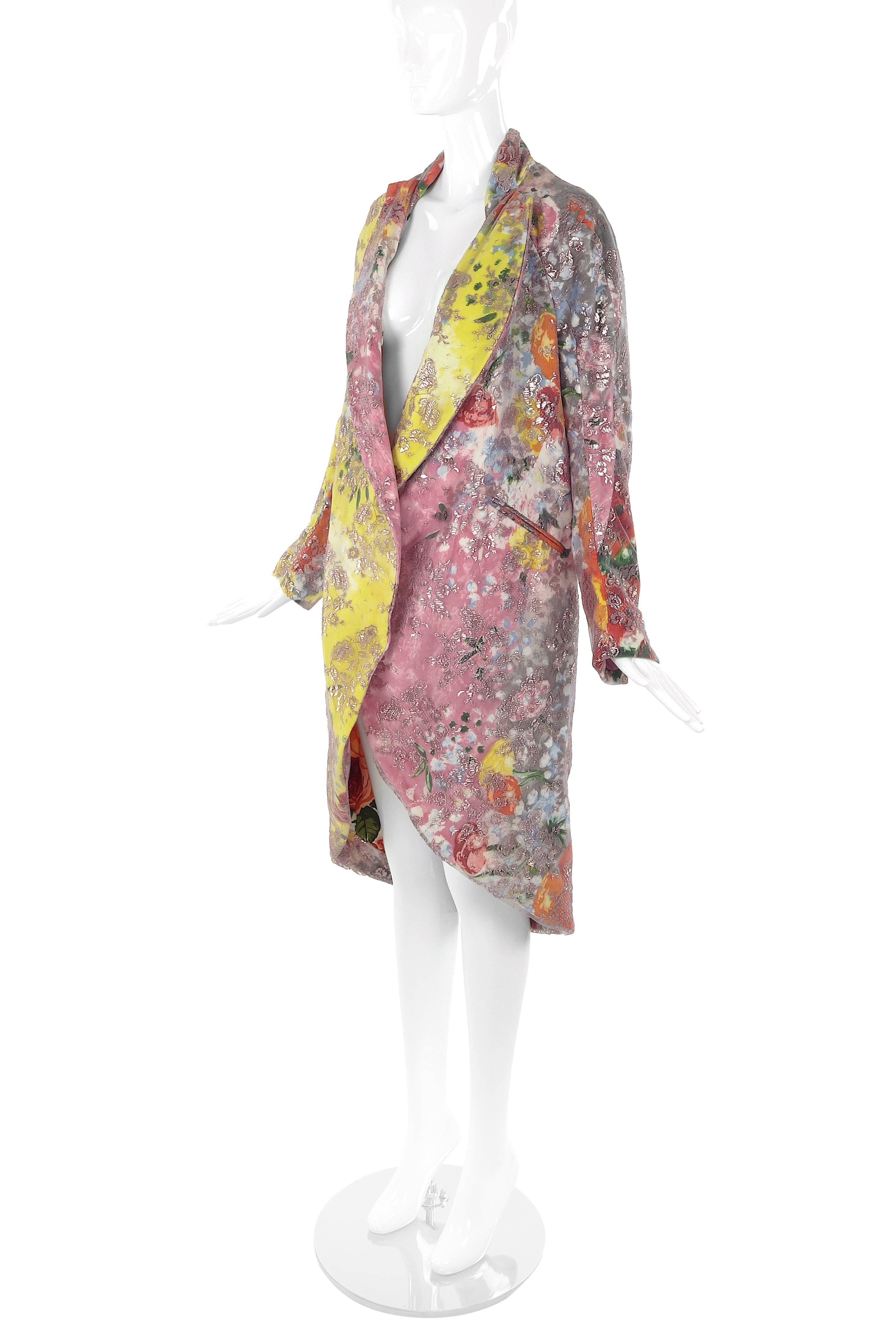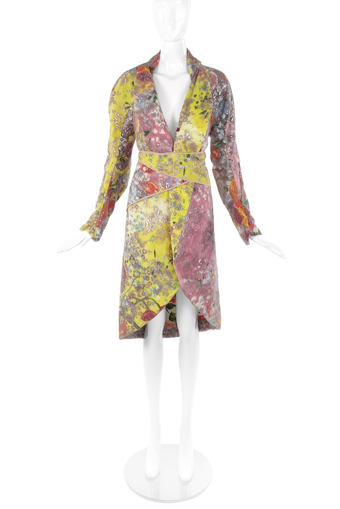 A colorful coat dress with elegant pink and yellow lace overlay from Downtown New York Cult Label "AsFour" - a favorite of celebrities such as Björk . The coat comes with a matching obi style belt. The coat is part of a full ensemble - pants, jacket, coat and belt (shown as full ensemble in the last pictures).