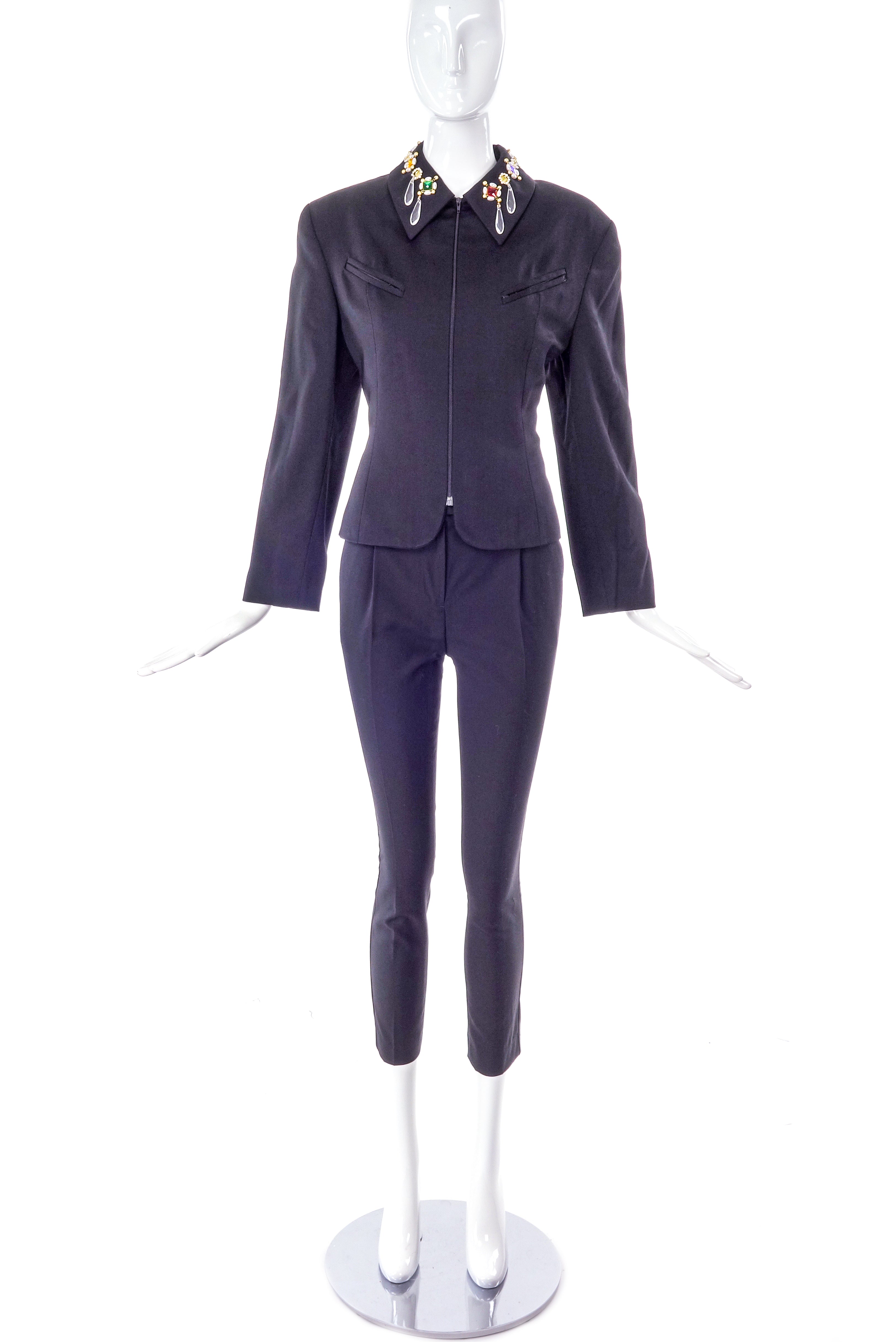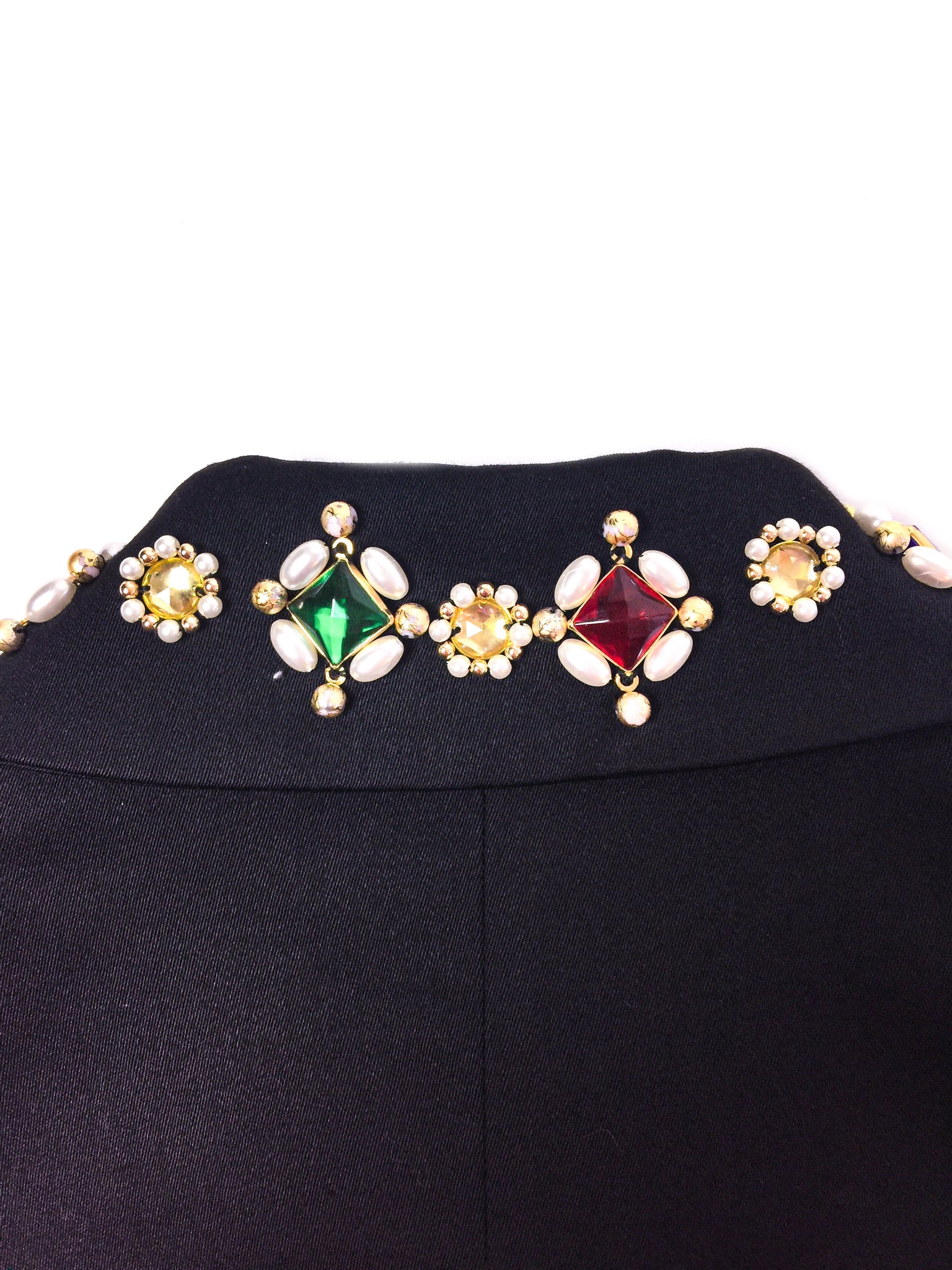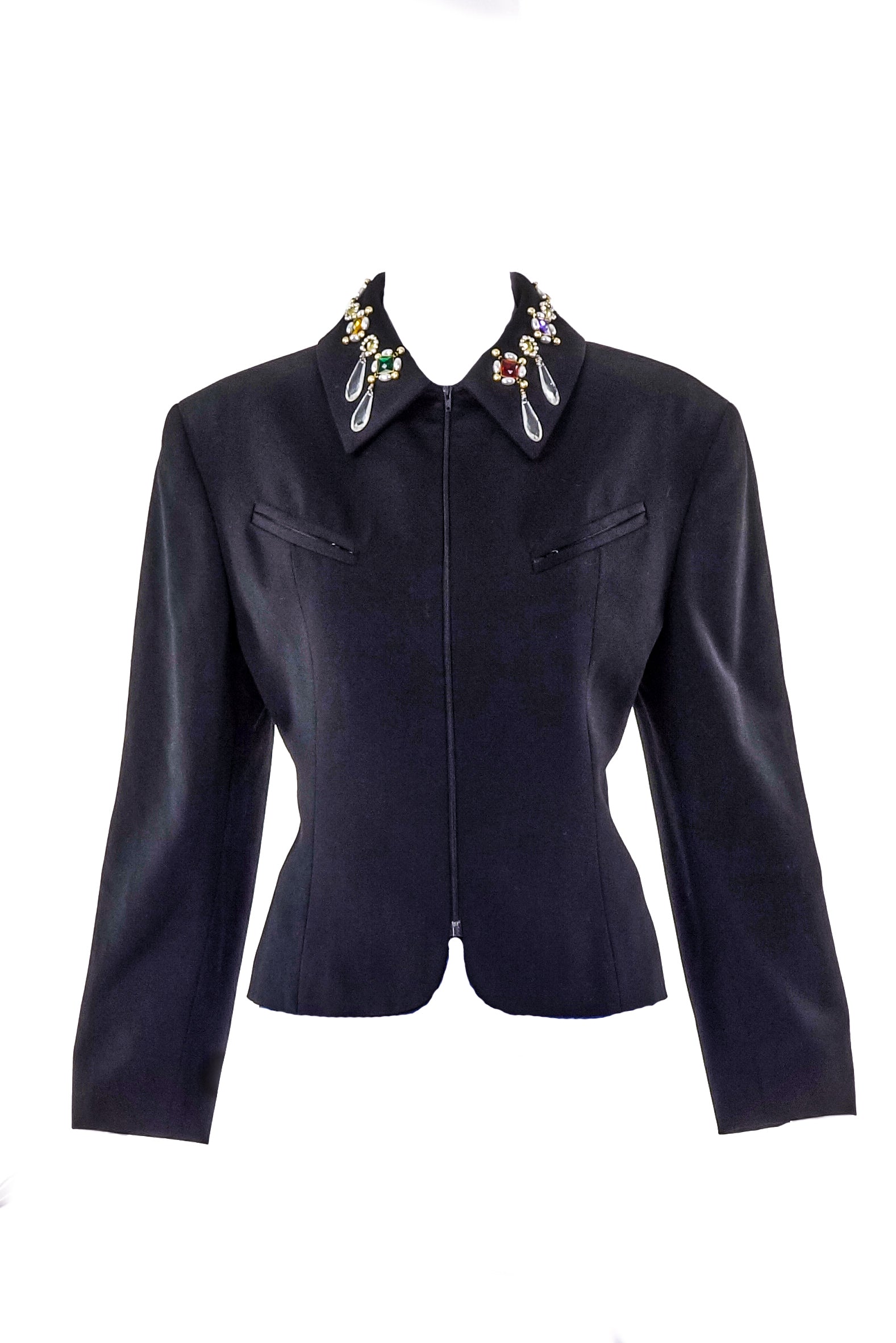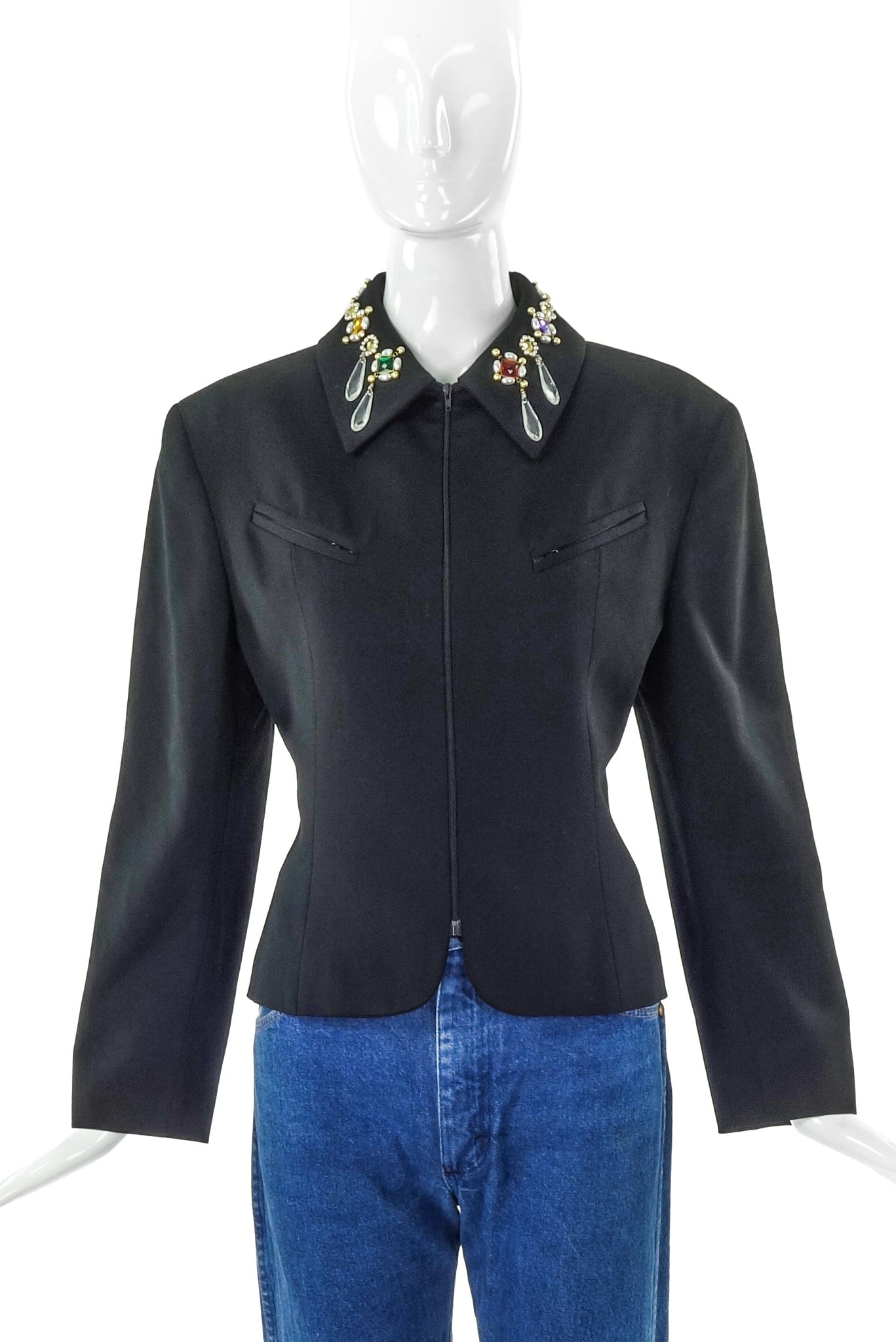 Byblos Black Wool Zip-Up Jacket with Costume Jewel Details on Collar