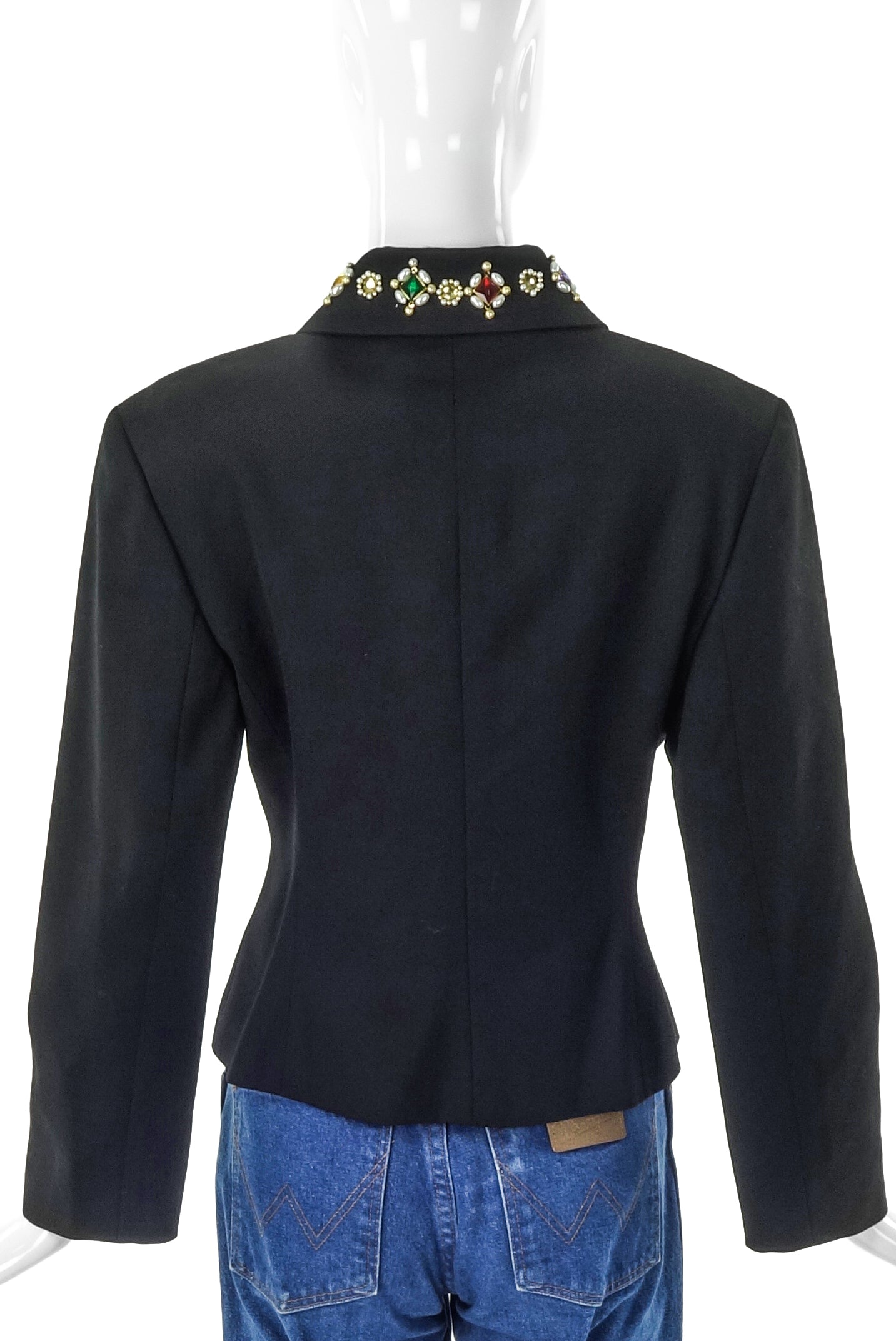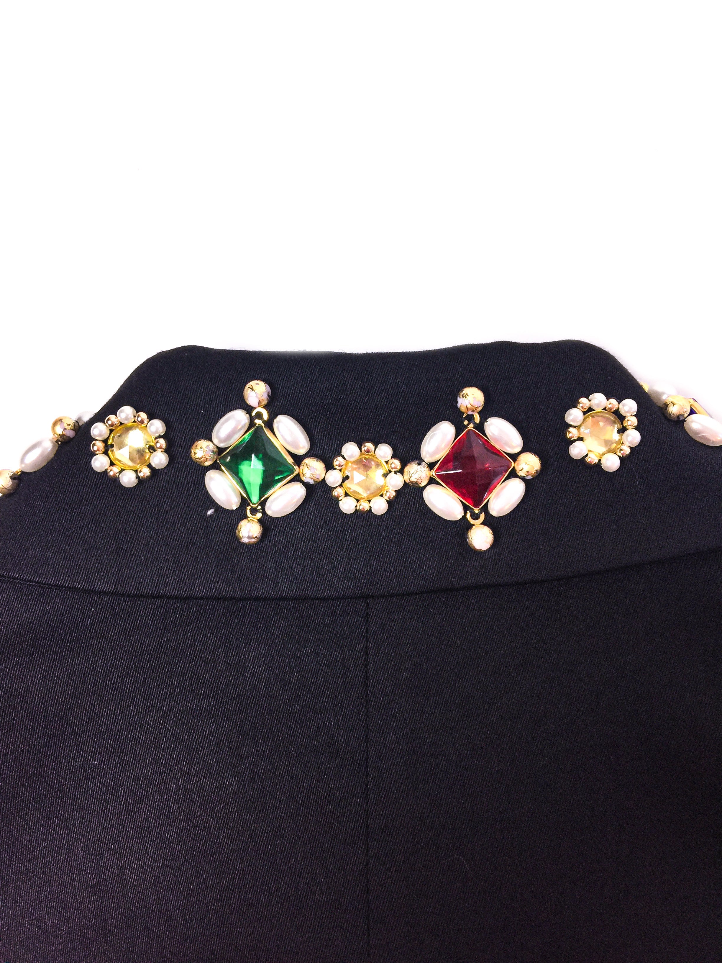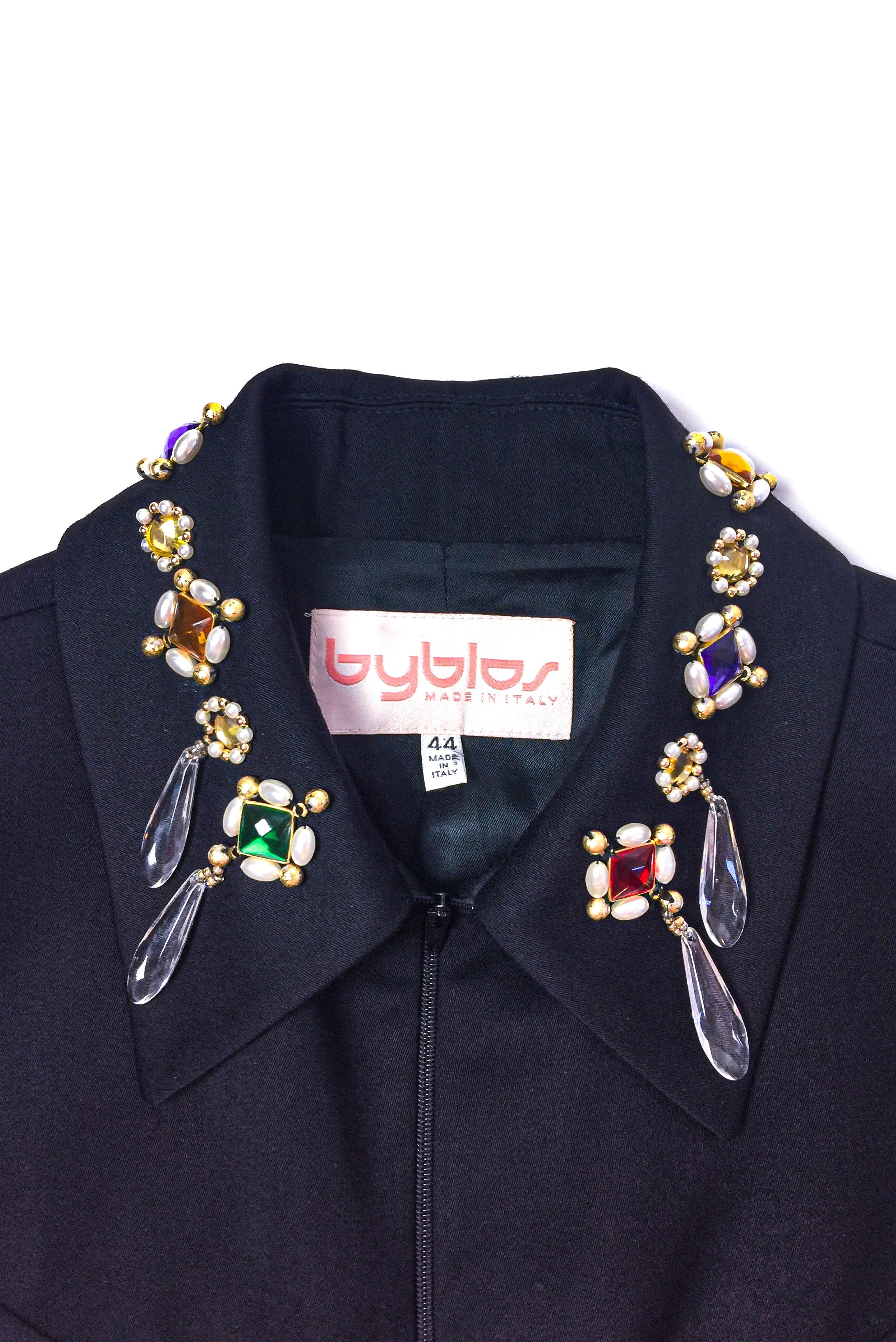 A vintage Byblos fitted wool jacket with a tuck at the waist providing an hourglass shape. A selection of costume jewels are arranged beautifully on the collar of the jacket. There are two diagonal zip pockets along the bust.
