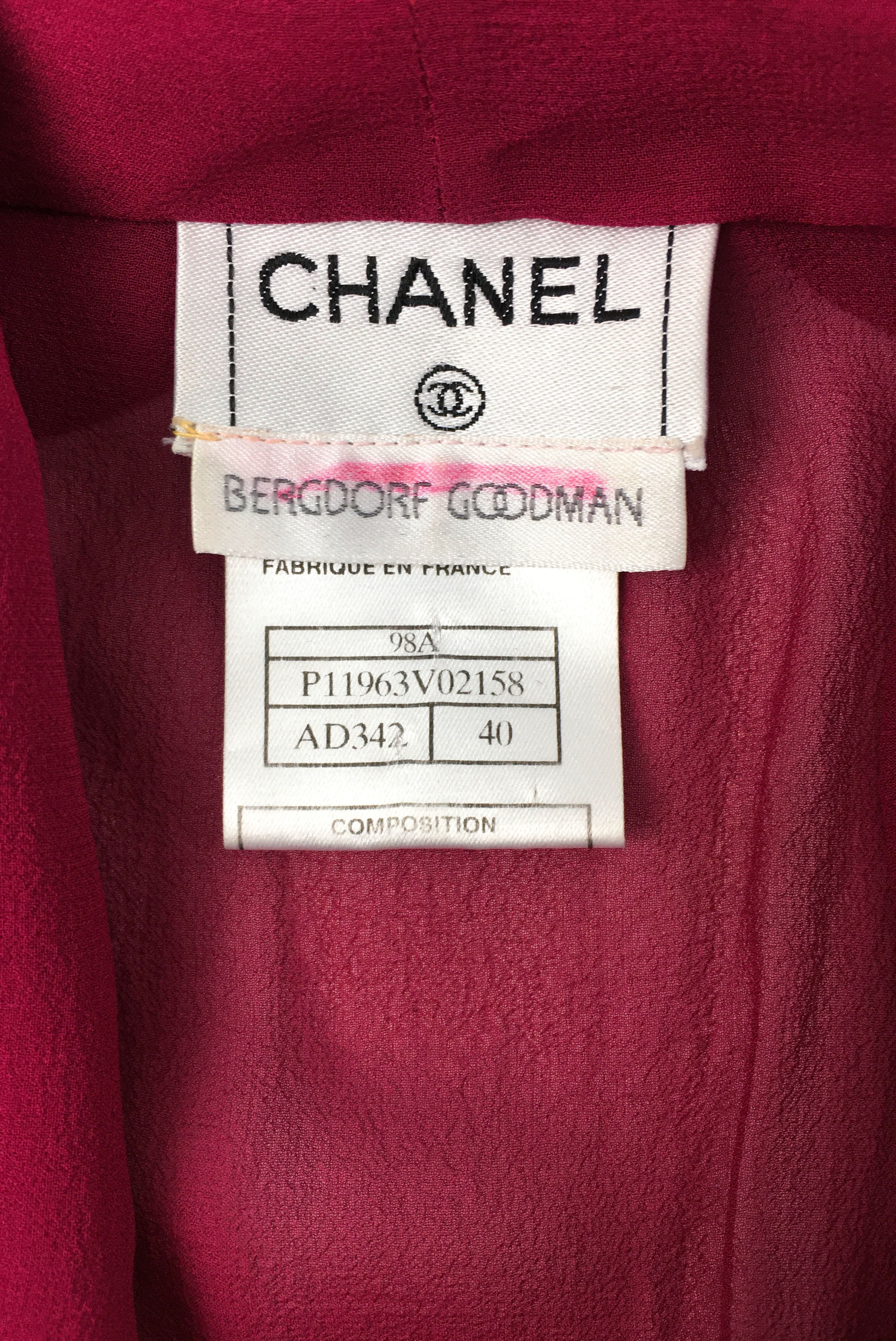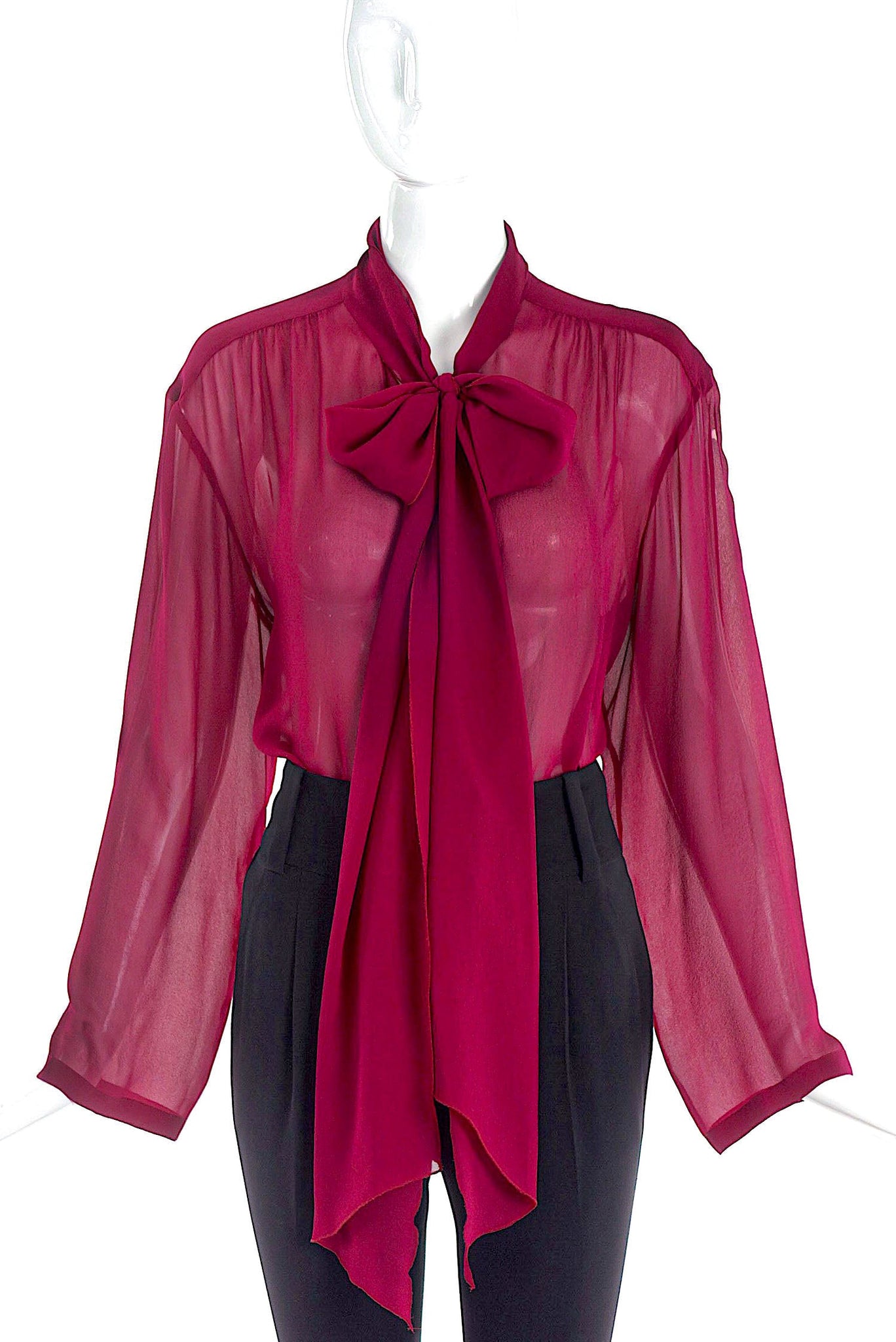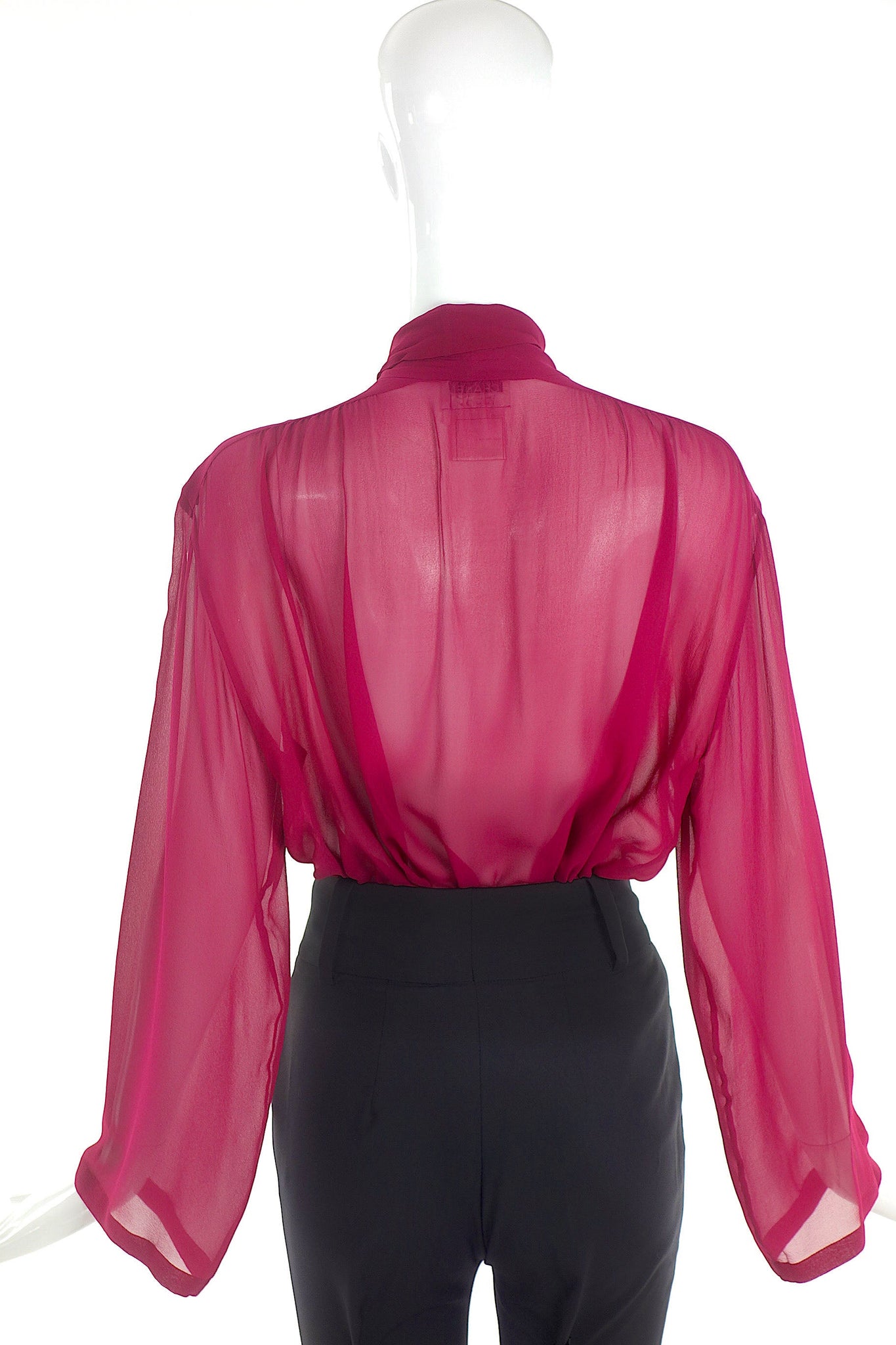 A Chanel raspberry red chiffon blouse with a dramatic pussy bow at the collar of the blouse. The vintage Chanel blouse has a sheer quality to it with buttons down the front. From the Chanel by Karl Lagerfeld Fall / Winter 1998 collection.