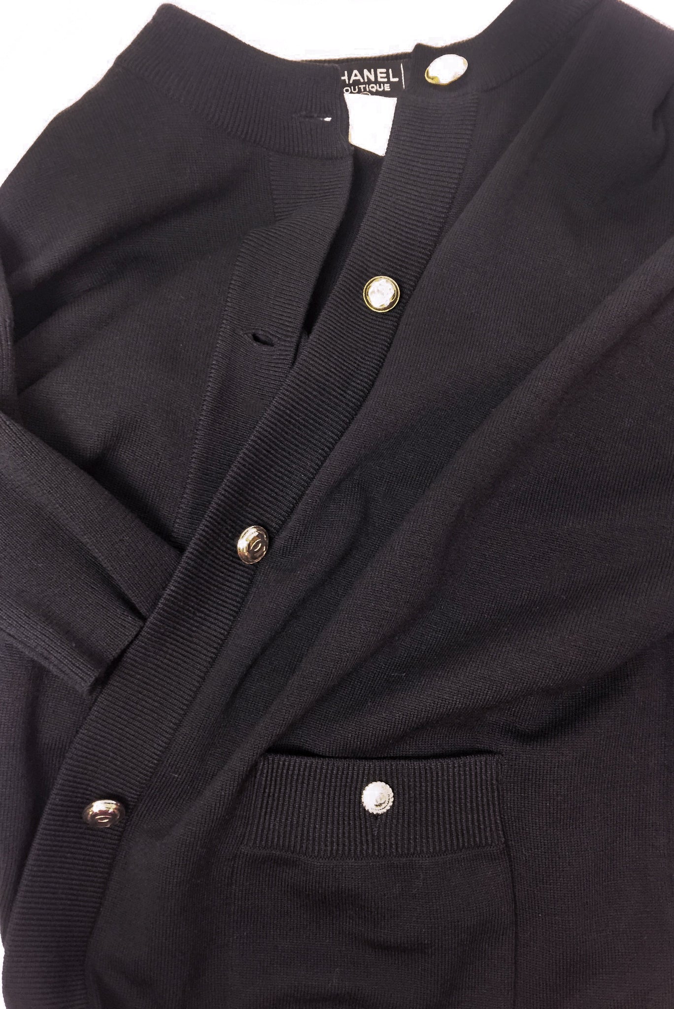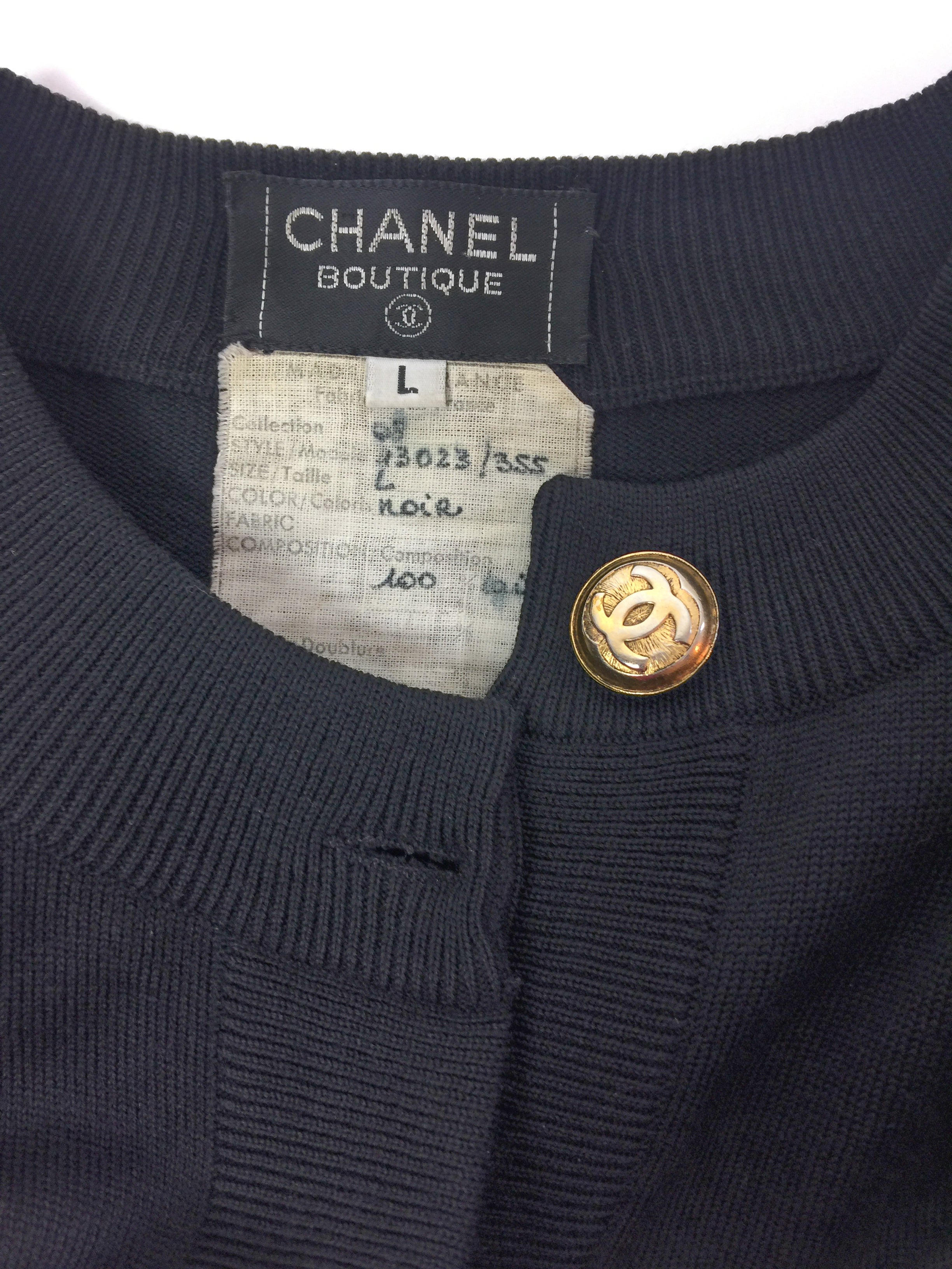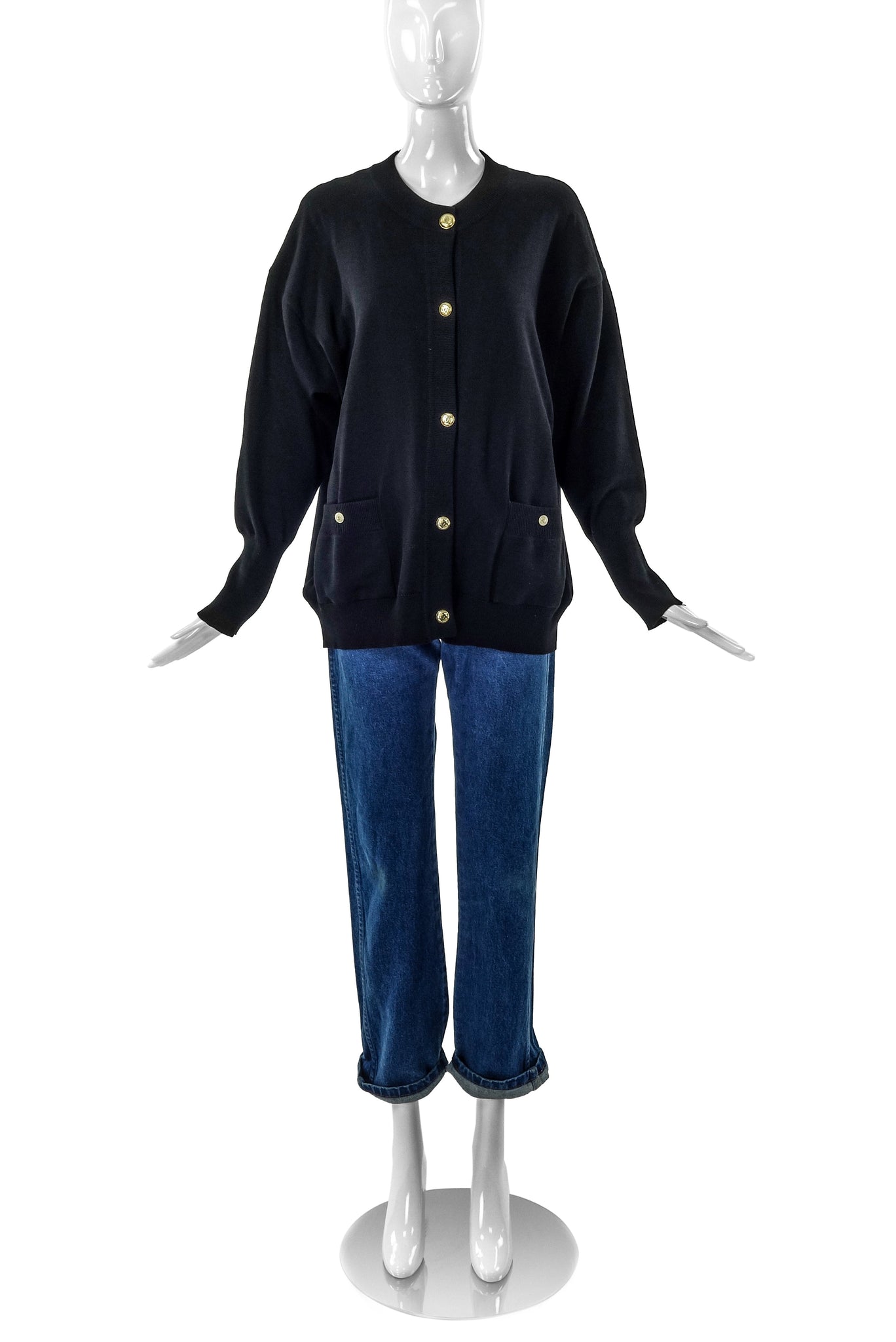 A classic 1980's Chanel black laine wool cardigan with the iconic interlocked CC gold buttons along the right side. Two pockets with the CC interlocked gold buttons sit on the waist line.