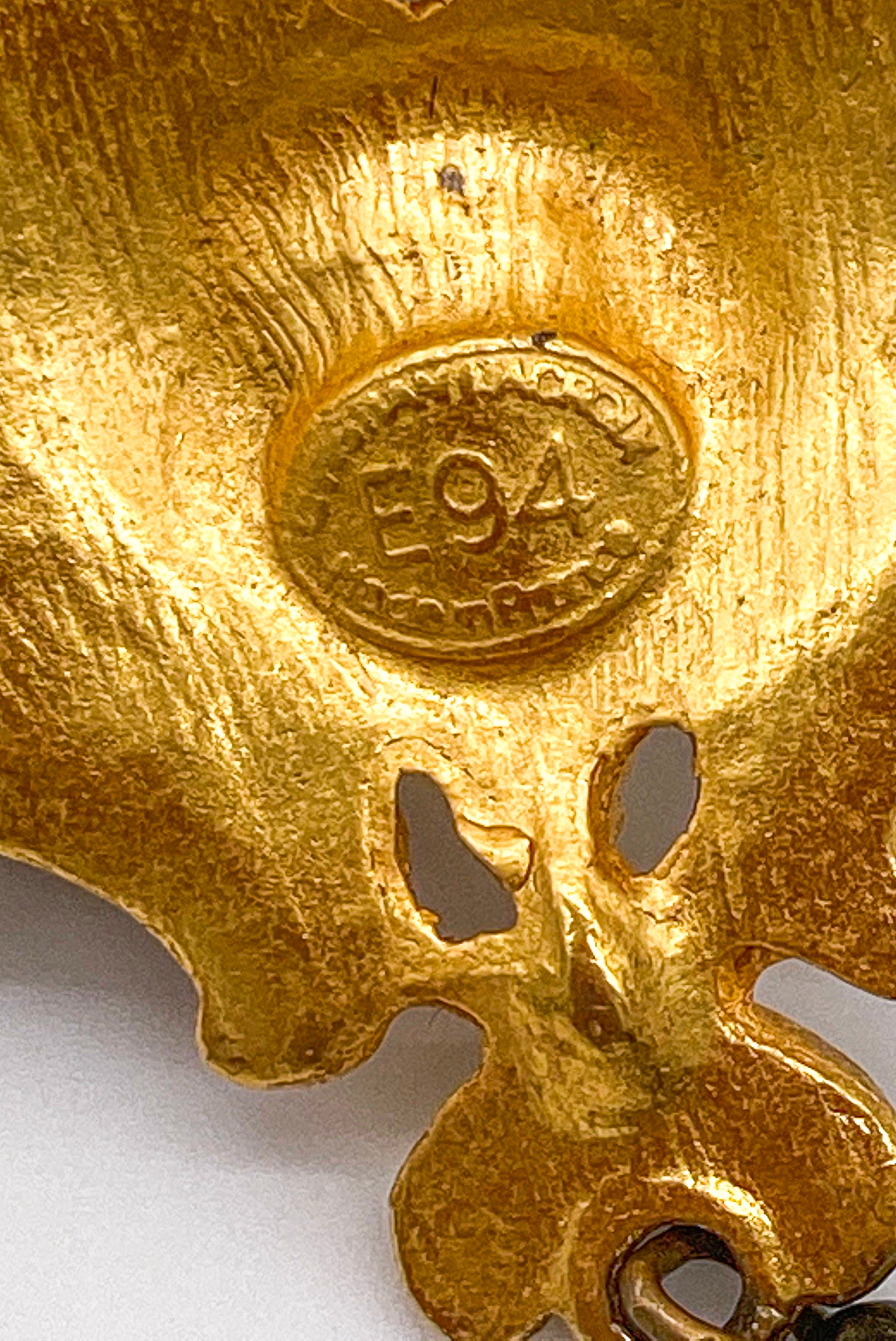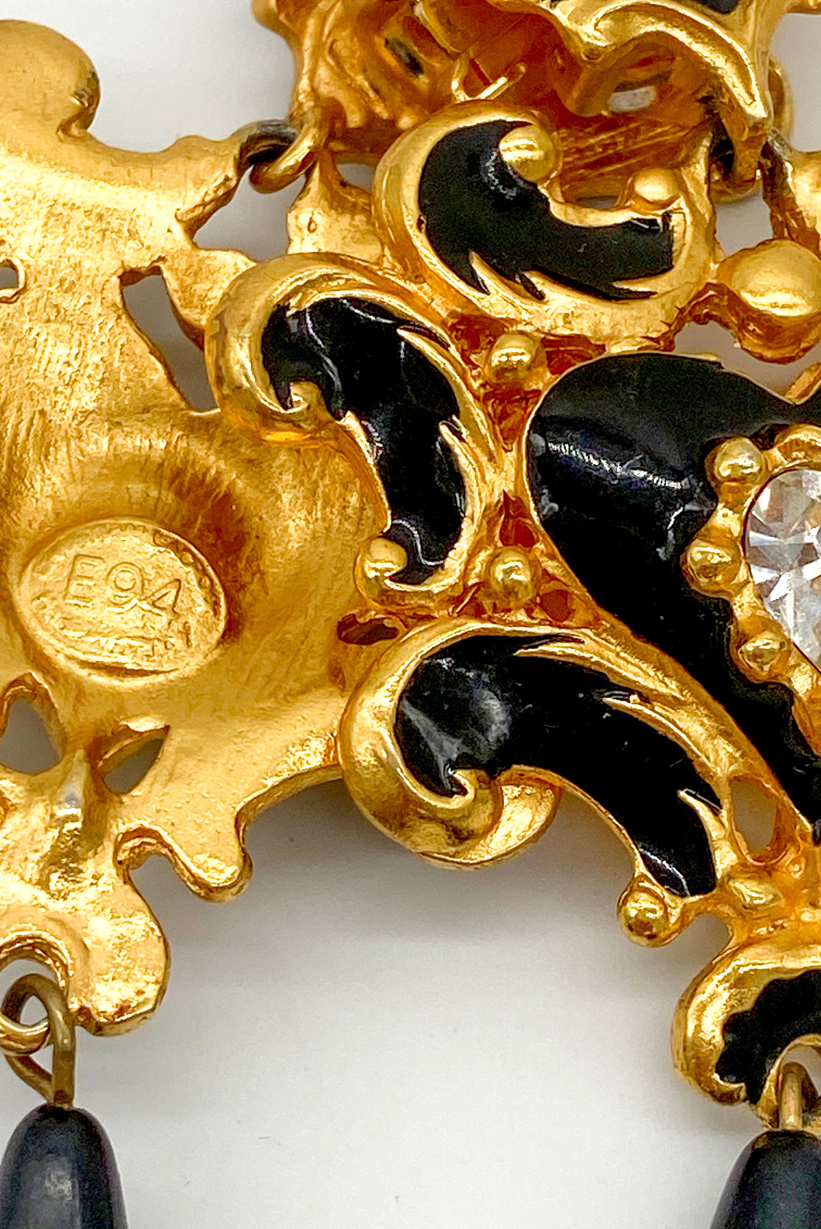 A pair of Christian Lacroix golden baroque statement earrings with delicate costume diamonds highlighting the black enamel detailing. Earrings have a gold clip on backing and are stamped Christian Lacroix E94 Made in France. From the Christian Lacroix Eté (Summer) 1994 collection.