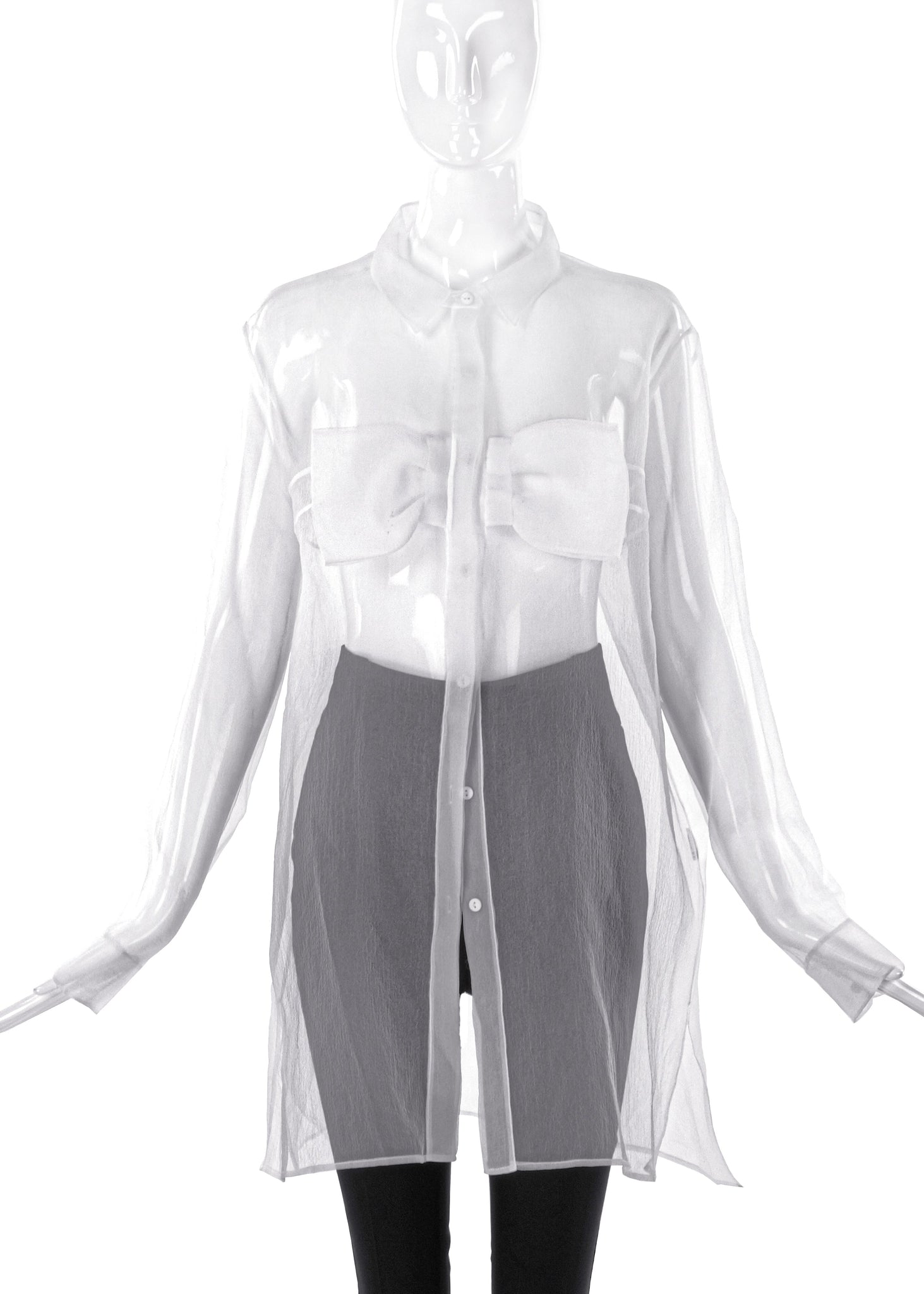Christopher Kane sheer nylon crepe button-up blouse with an oversized bow detail at the bust. The blouse has a straight point style collar with white covered buttons down the front of the blouse. Shirt is completely sheer. From the Christopher Kane Spring / Summer 2013 runway presentation Look 32.
