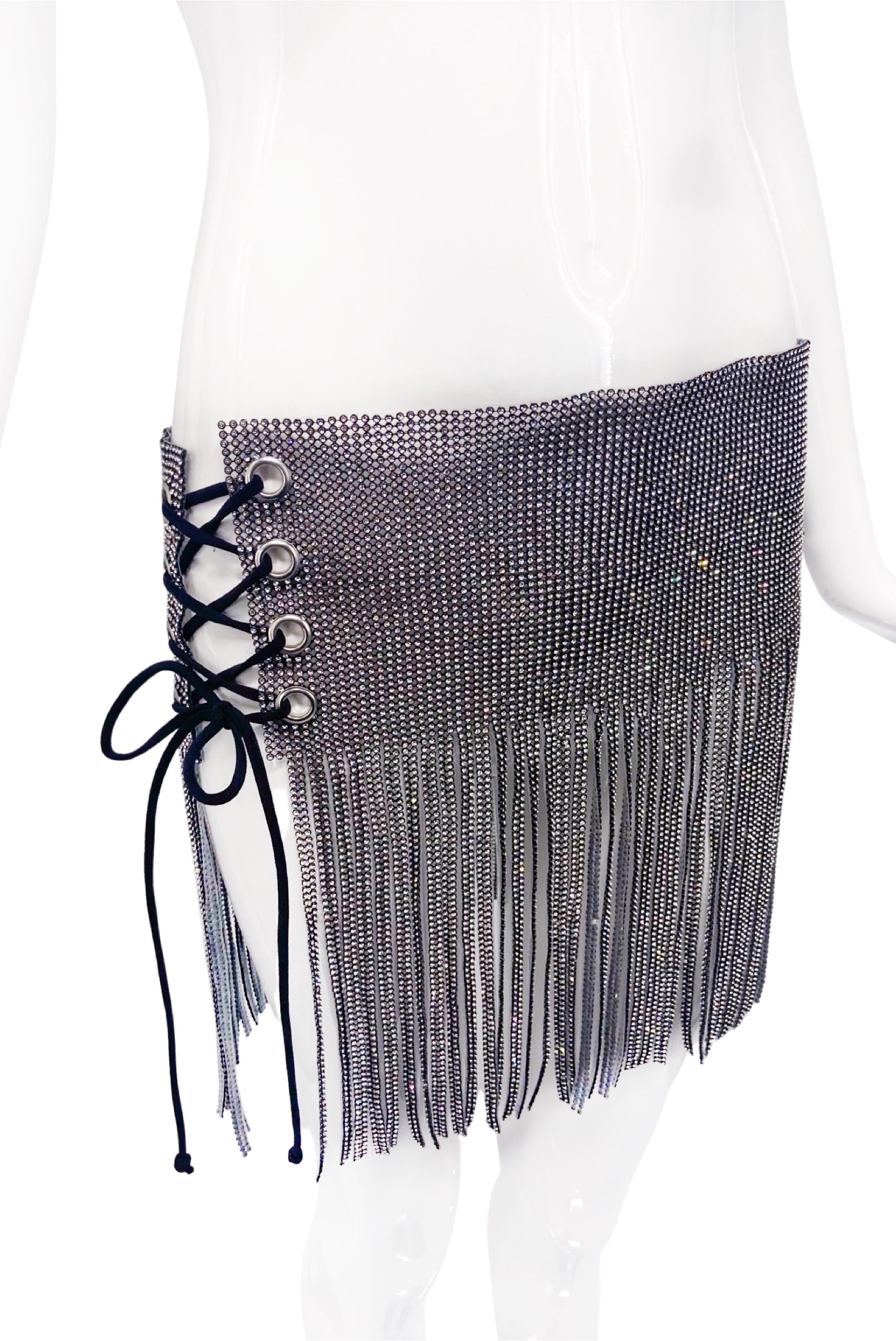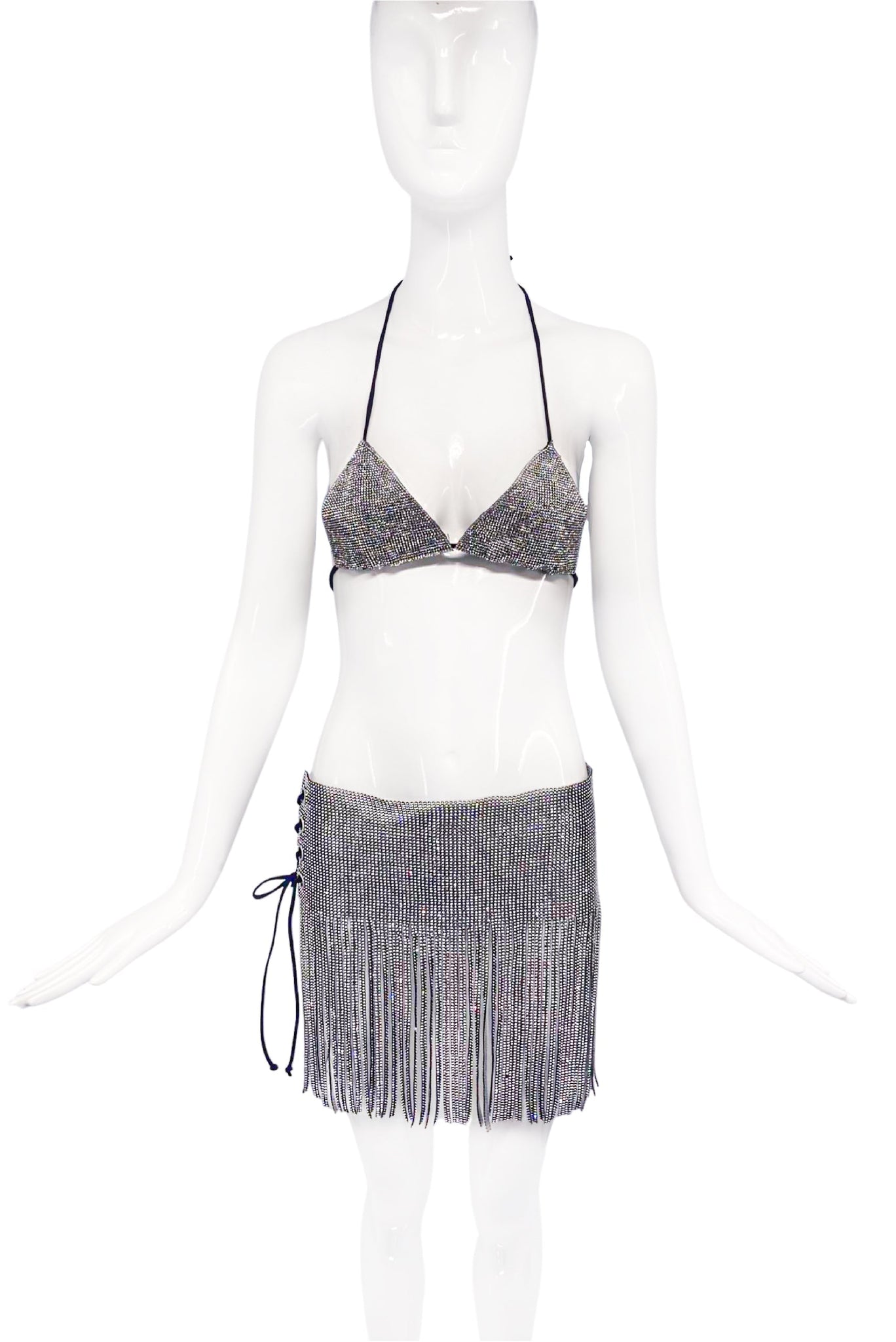 Vintage Silver Pavé Crystal Bikini Top with PVC Fringe Side Slit Cross Tie Skirt
