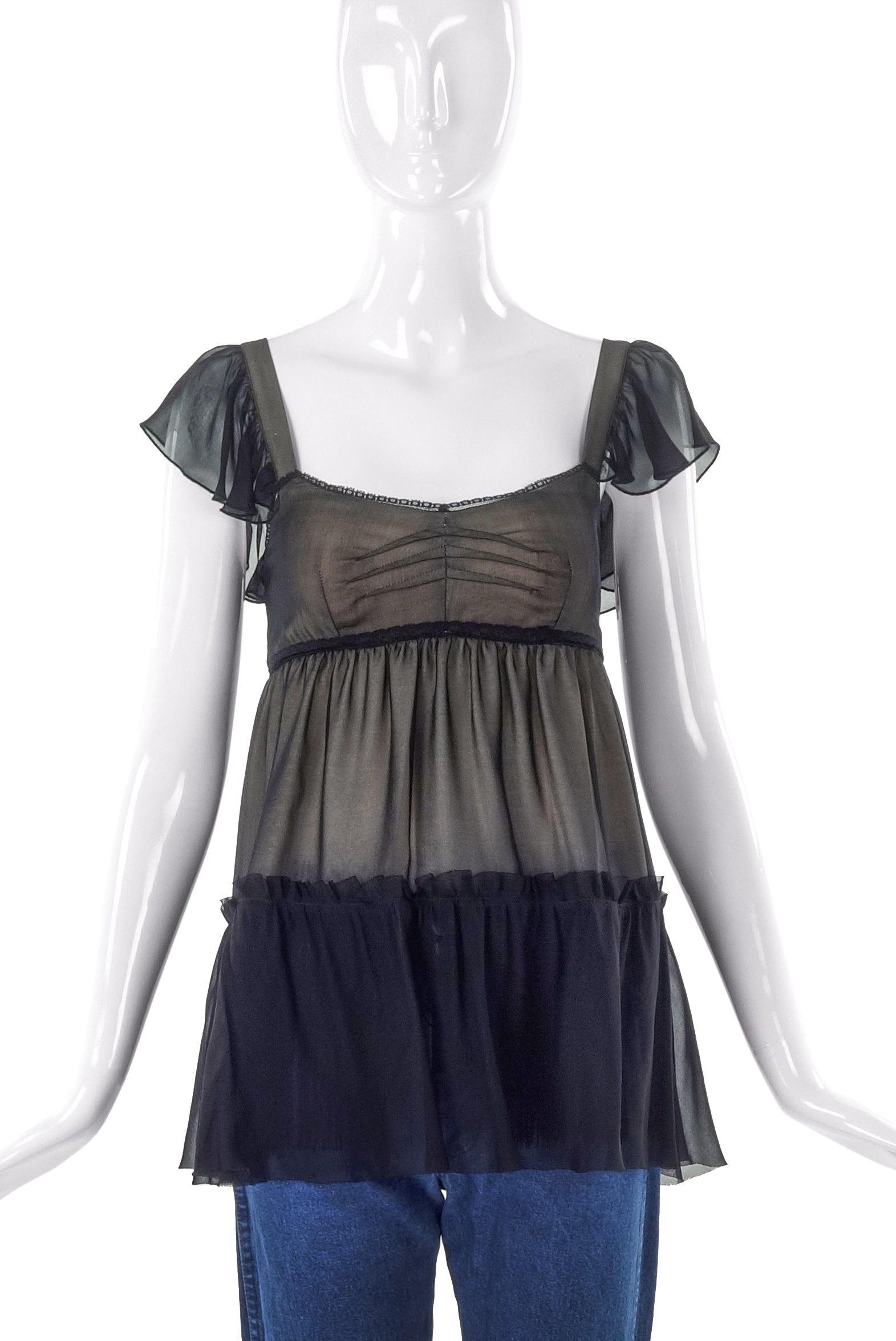 A 2000's D&G by Dolce and Gabbana baby doll top with ruffle along the bottom of the top. The black chiffon flows over a beige silk with a fringe trim along the bottom. There is black chiffon ruffling along the strap and small lace detailing along the bust.