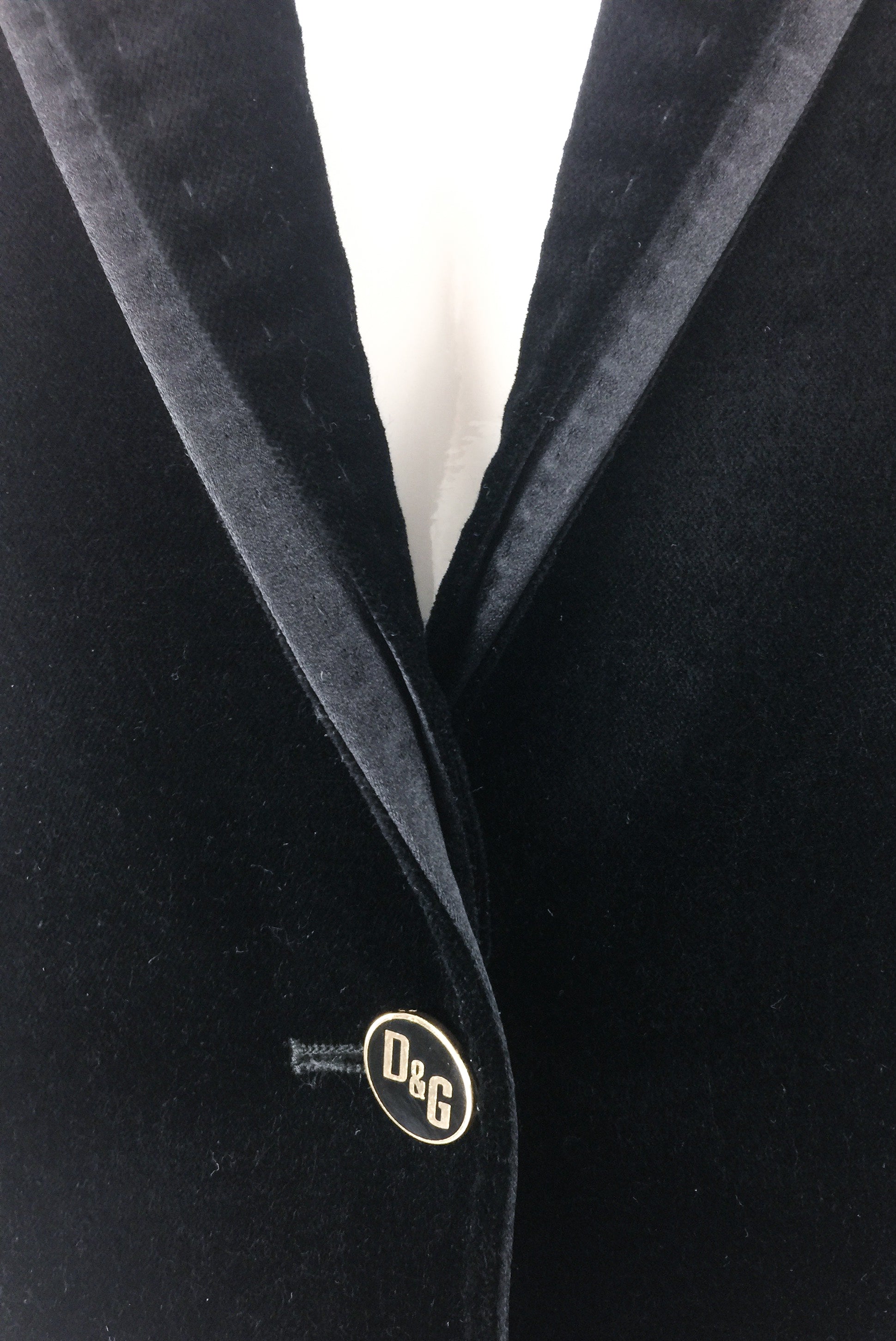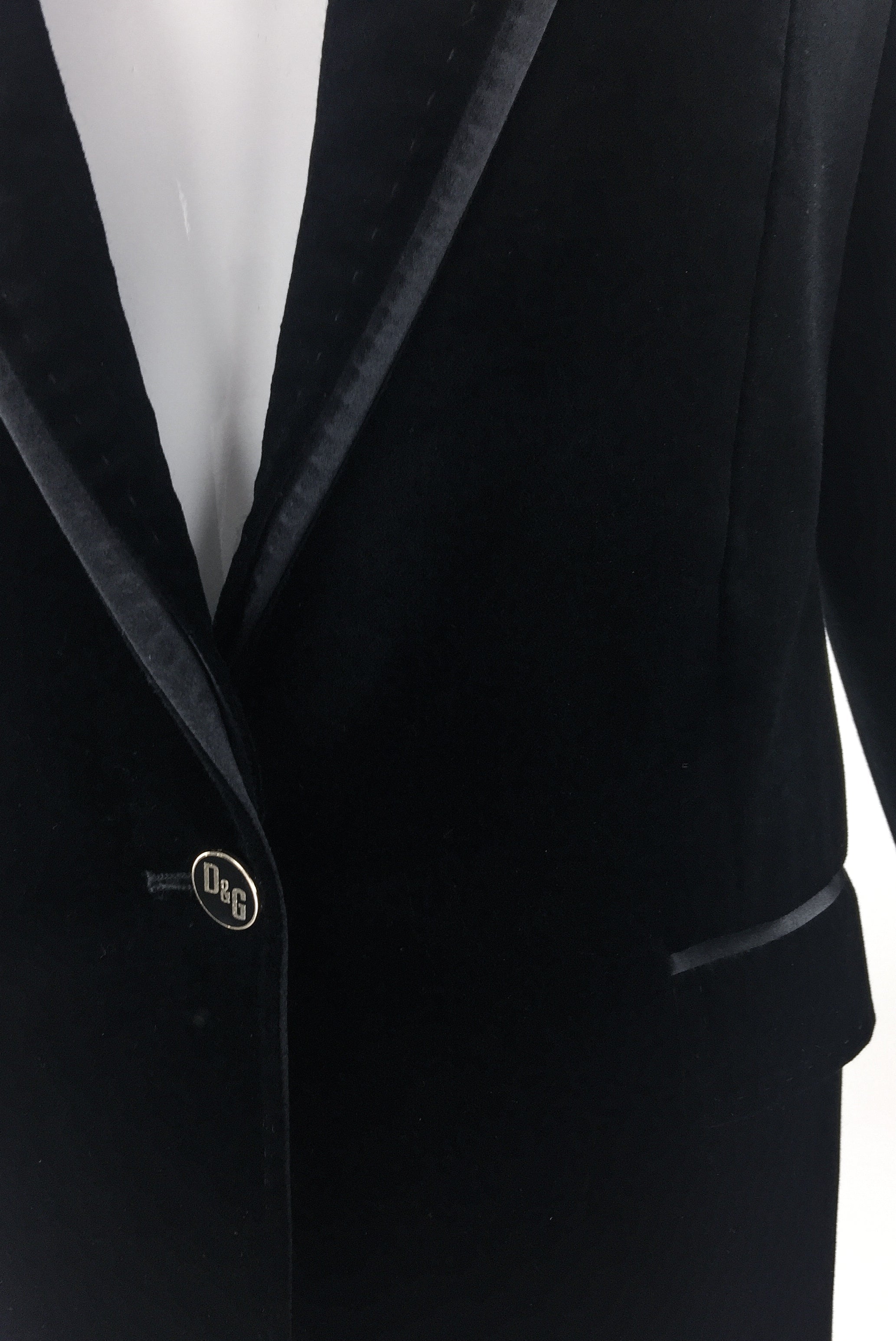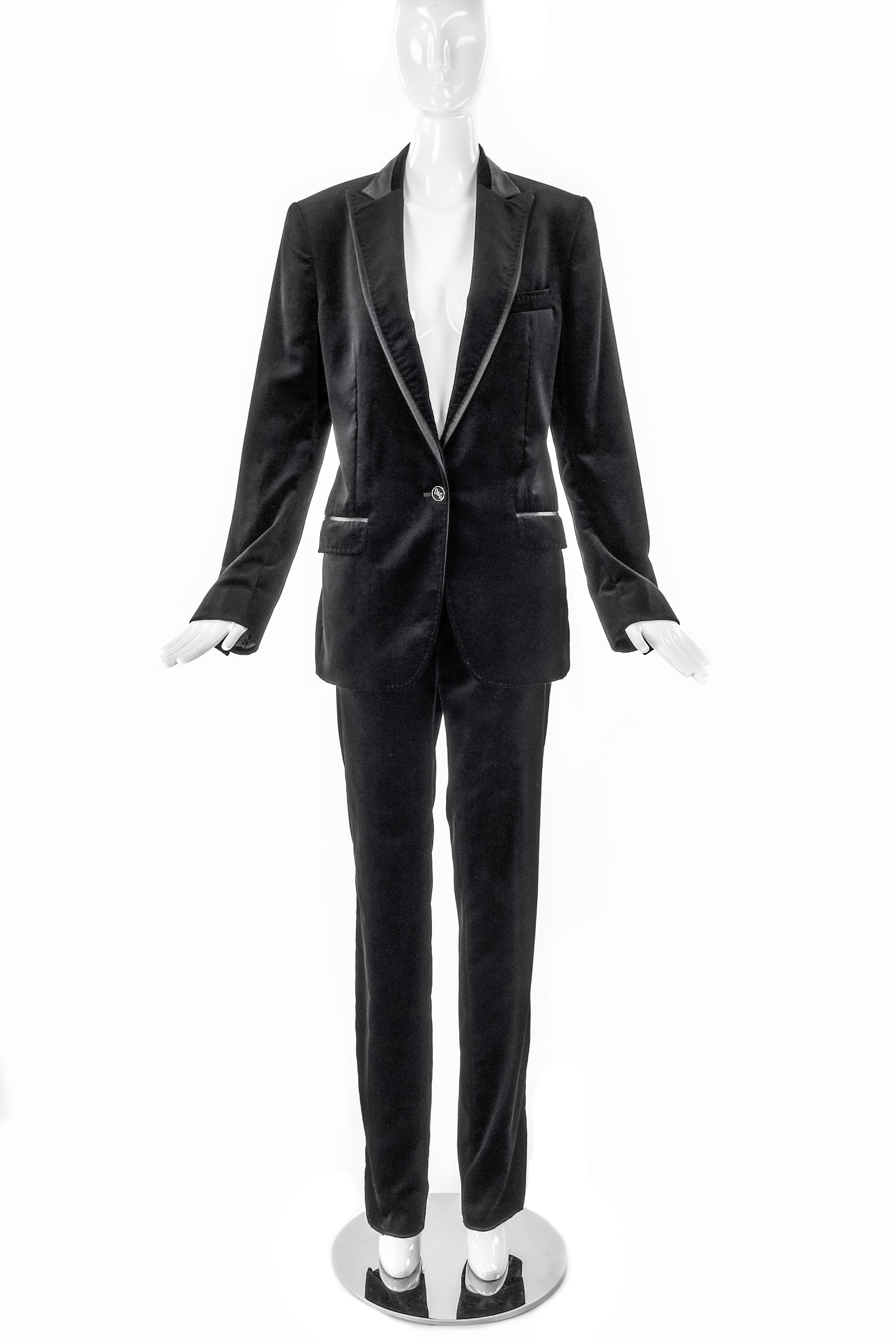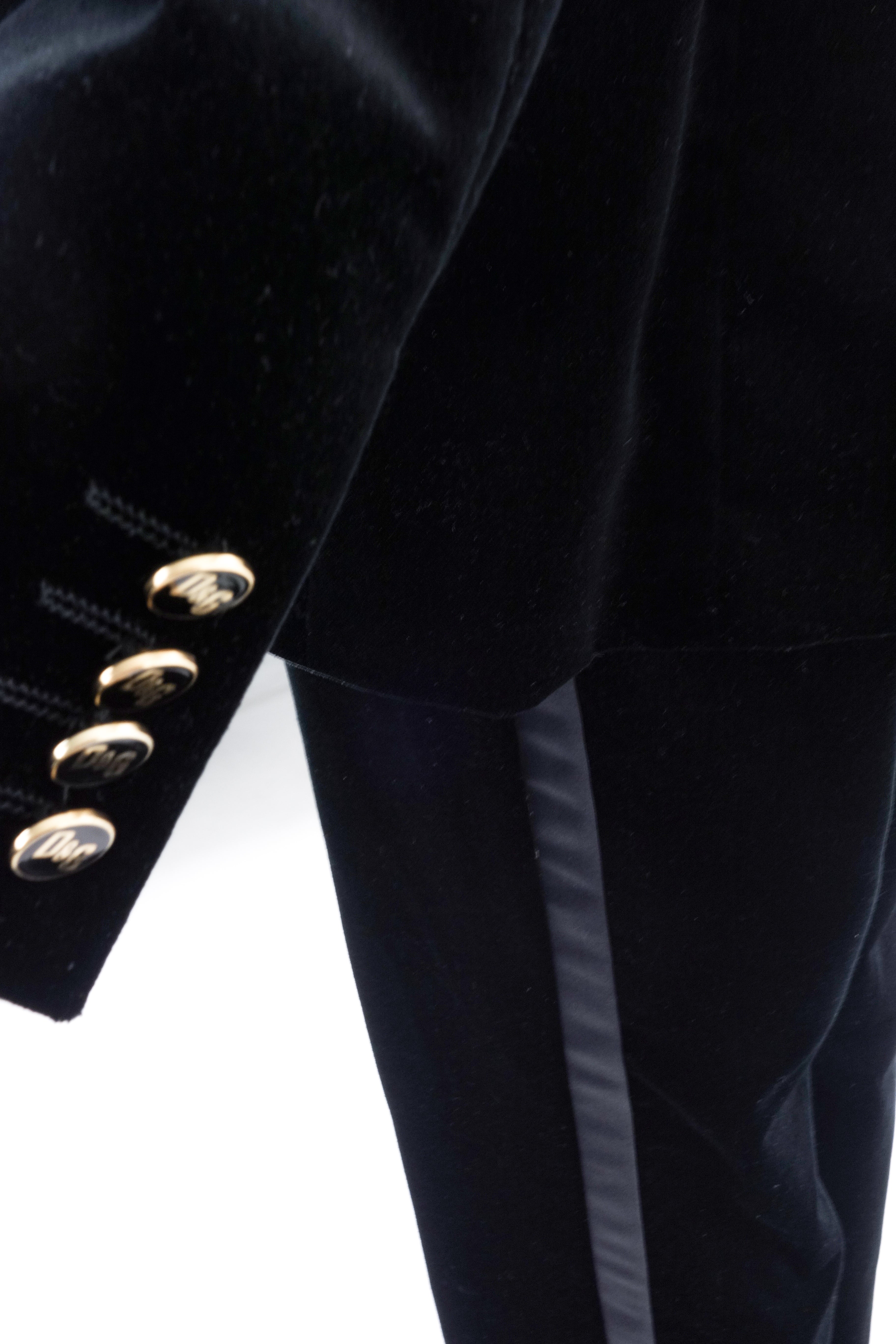 D&G by Dolce & Gabbana velvet suit with satin details and beautiful heavy stitch detailing. Satin tuxedo side stripe on the pants. Double satin/velvet layer on the lapel. Gold logo buttons on the cuff and waist. Gold logo buttons on the cuffs and waist. from the D&G by Dolce and Gabbana Fall / Winter 2007 Look 4 runway sample.