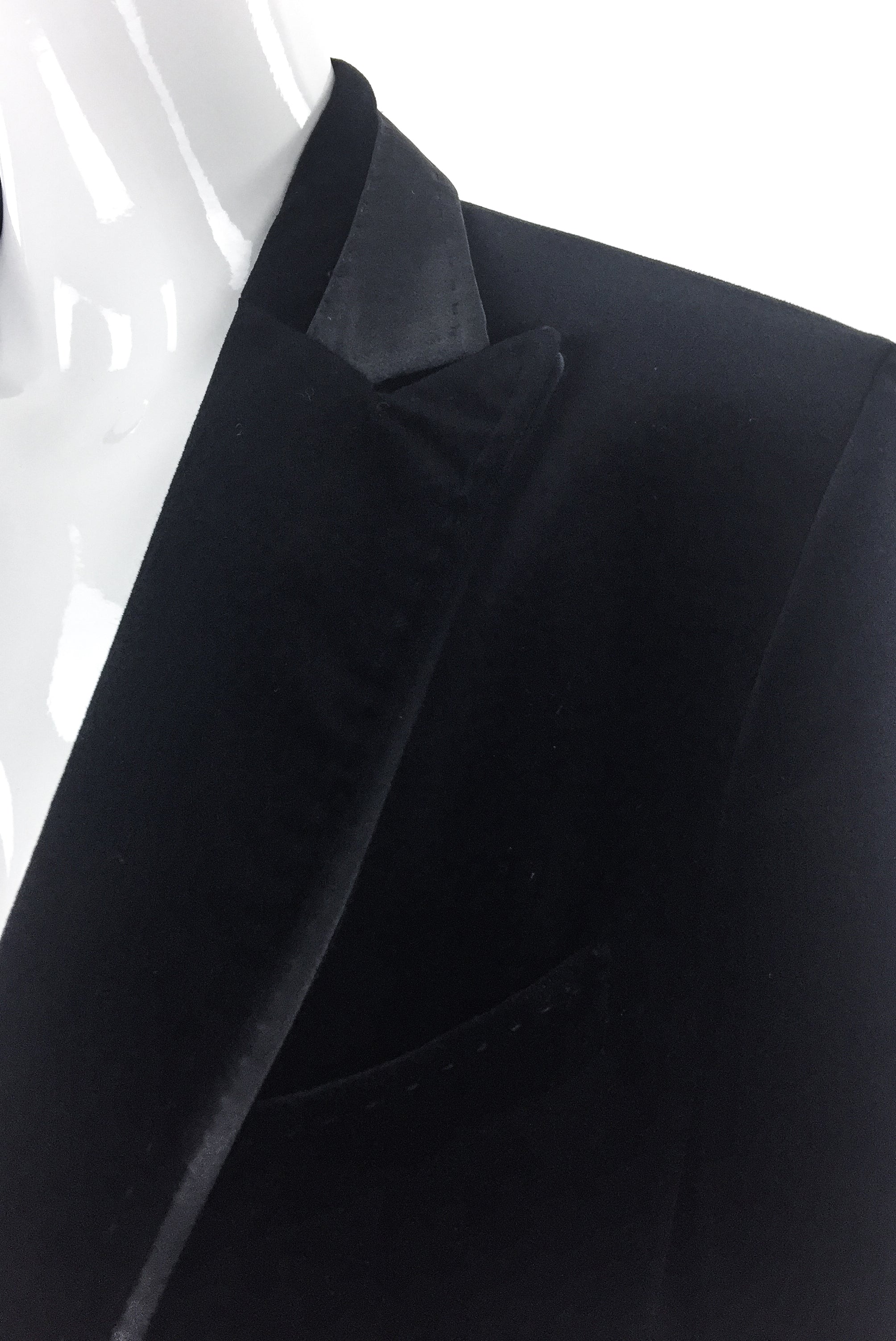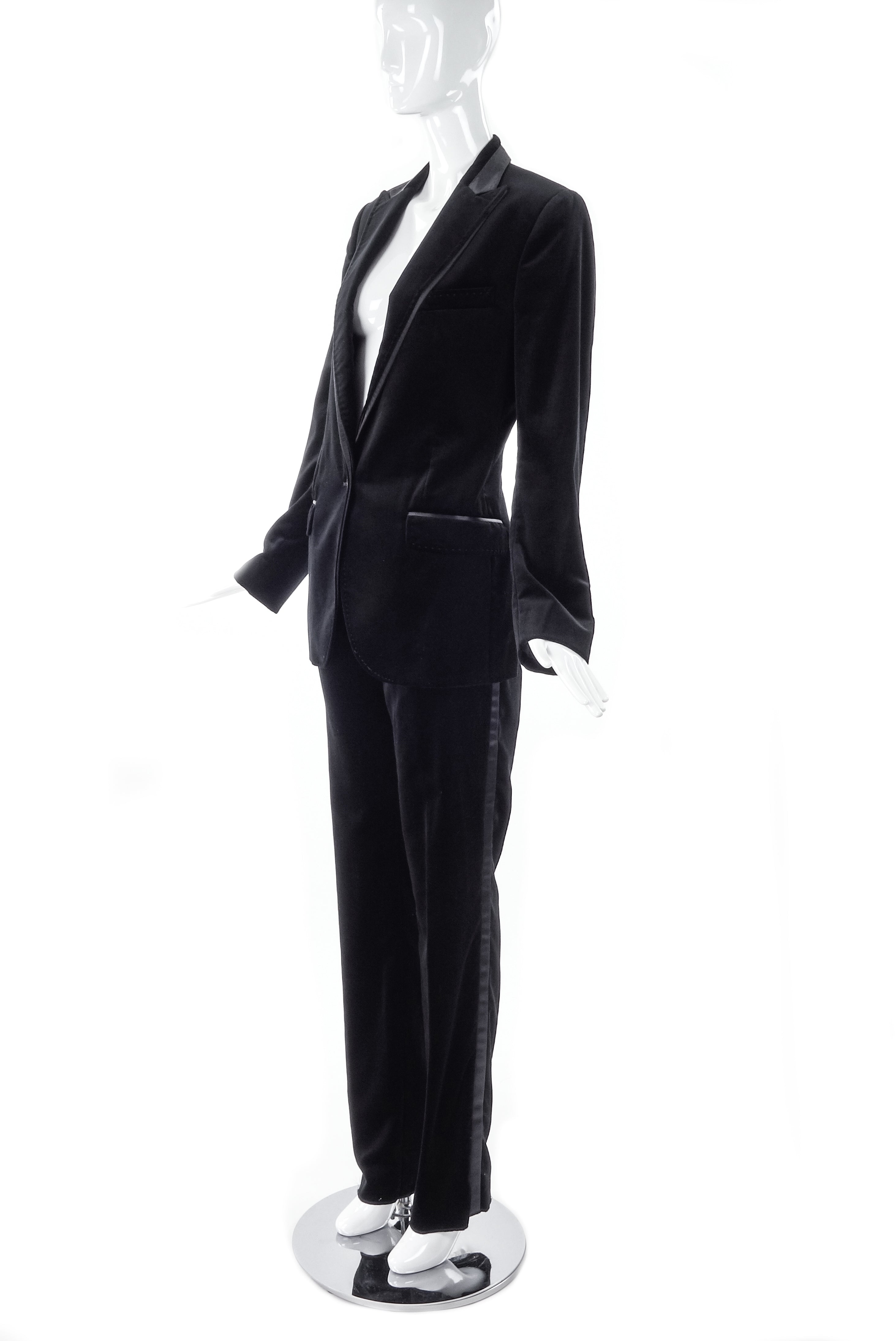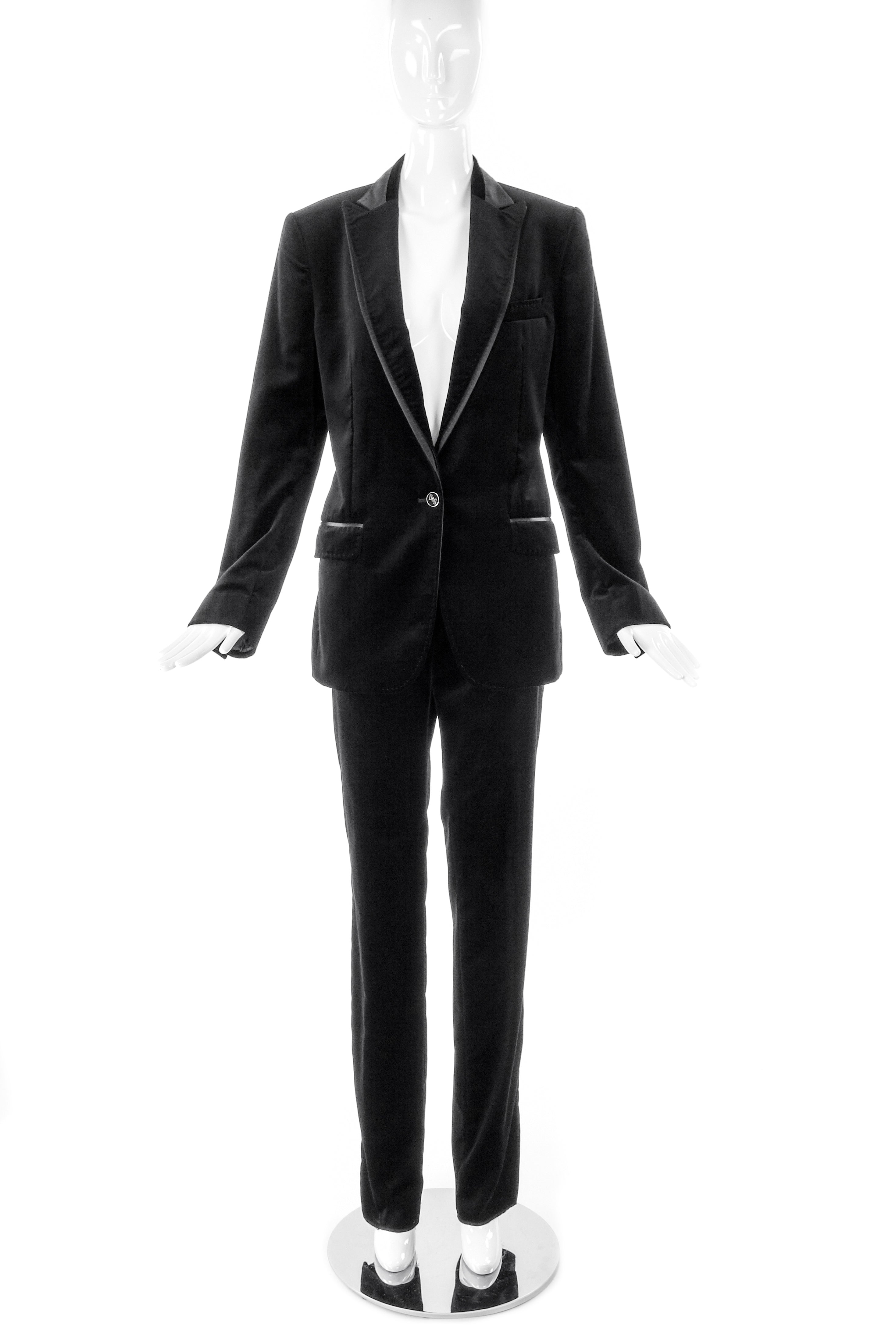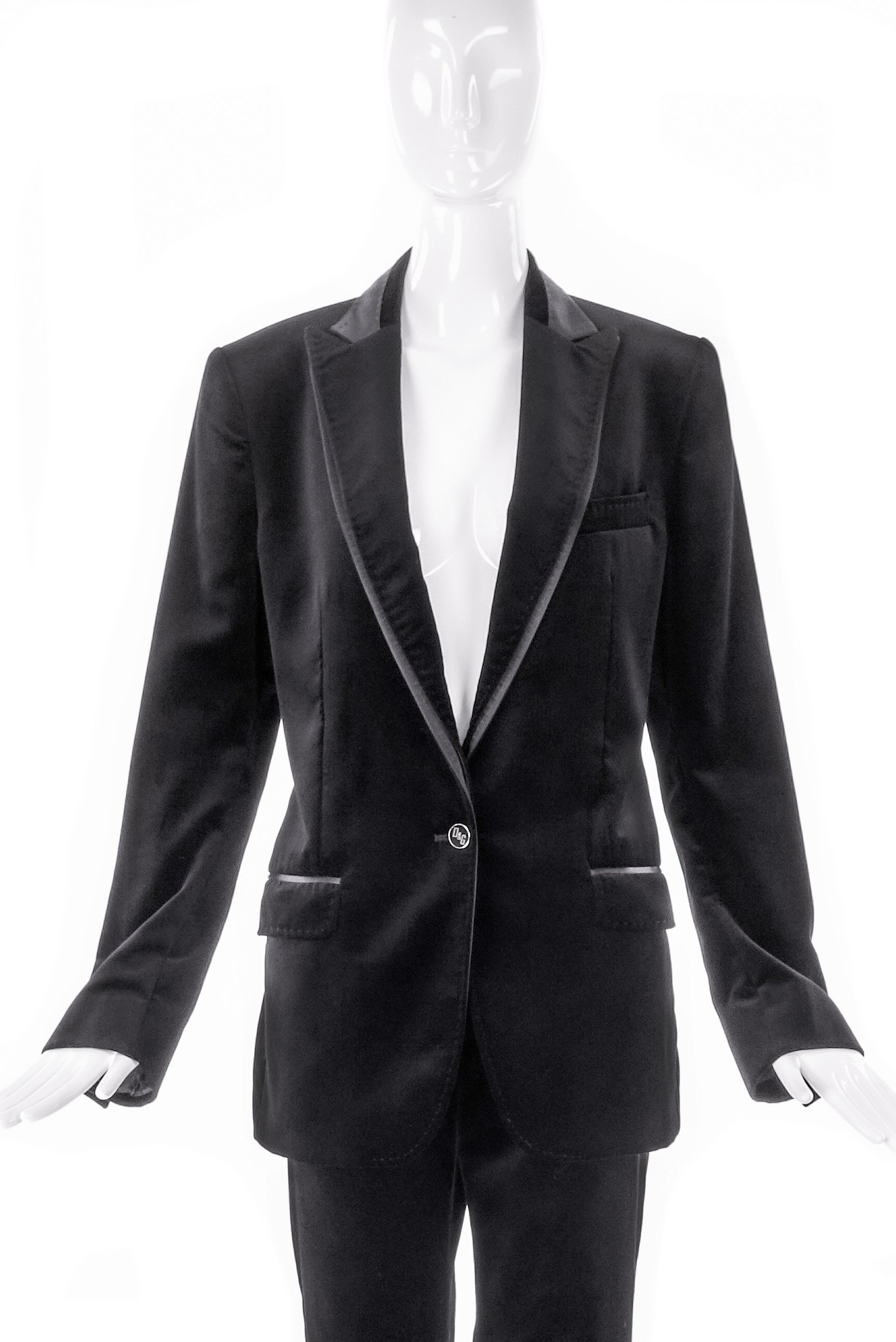 D&G by Dolce & Gabbana velvet suit with satin details and beautiful heavy stitch detailing. Satin tuxedo side stripe on the pants. Double satin/velvet layer on the lapel. Gold logo buttons on the cuff and waist. Gold logo buttons on the cuffs and waist. from the D&G by Dolce and Gabbana Fall / Winter 2007 Look 4 runway sample.