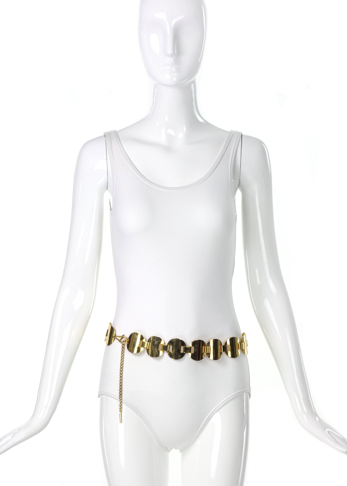 A Dolce & Gabbana belt created from gold discs interlocked together. The belt is clasped with a lobster clip which can be clipped onto a link in a chain that cascades down the leg upon clipping. This closure makes the belt adjustable for different sizes.