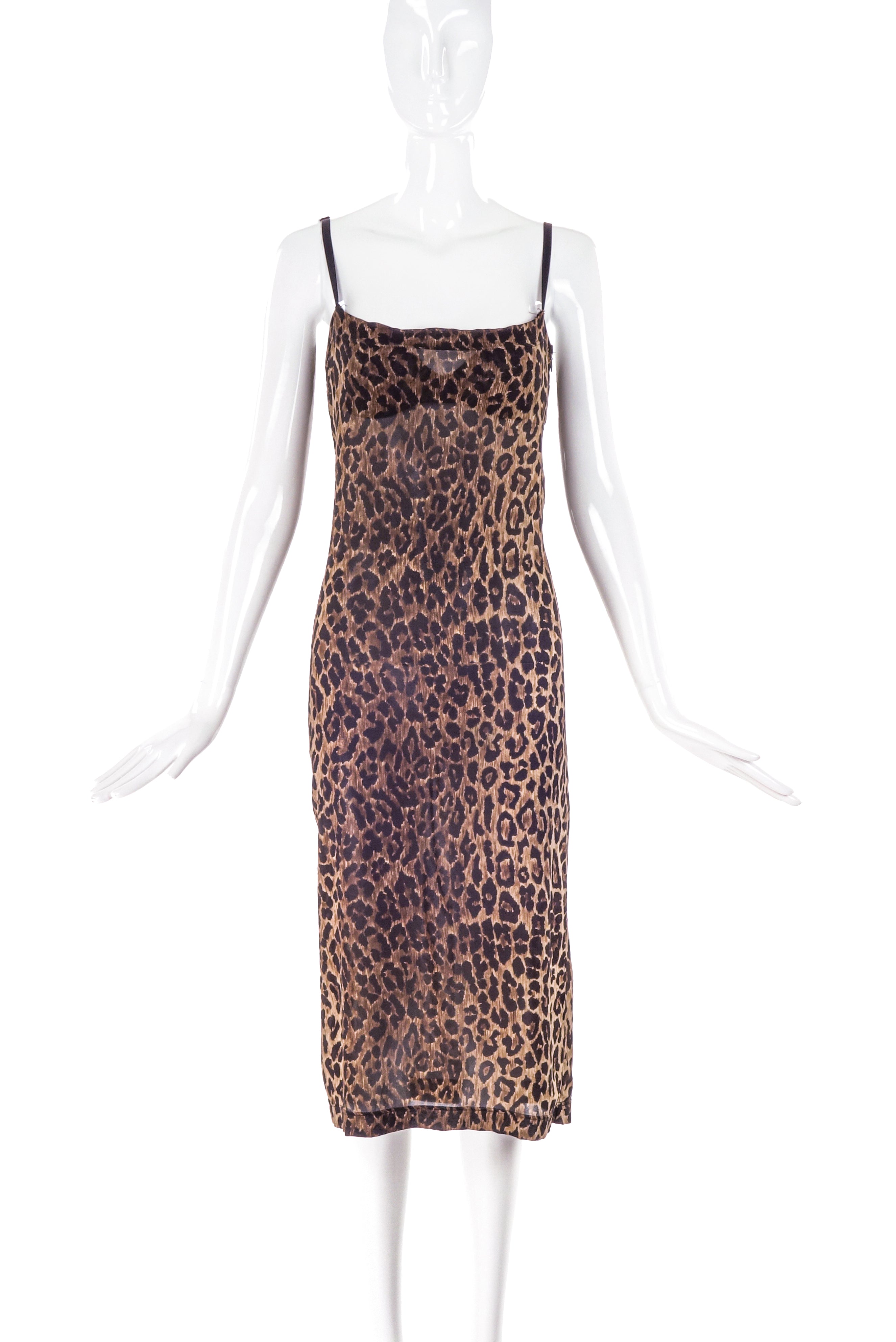 A Dolce & Gabbana leopard print chiffon long slip dress. The dress has two satin adjustable straps at the shoulder. The slip dress has a tiger stripe bra attached underneath for support. Circa 1990s.