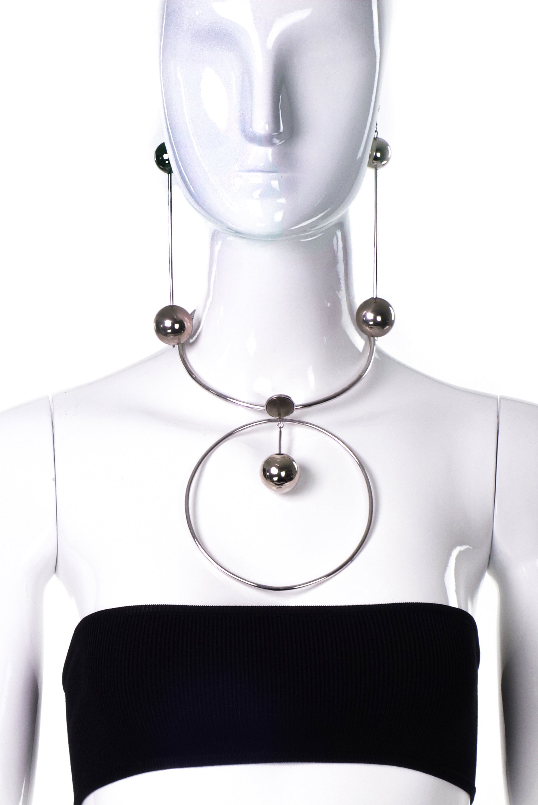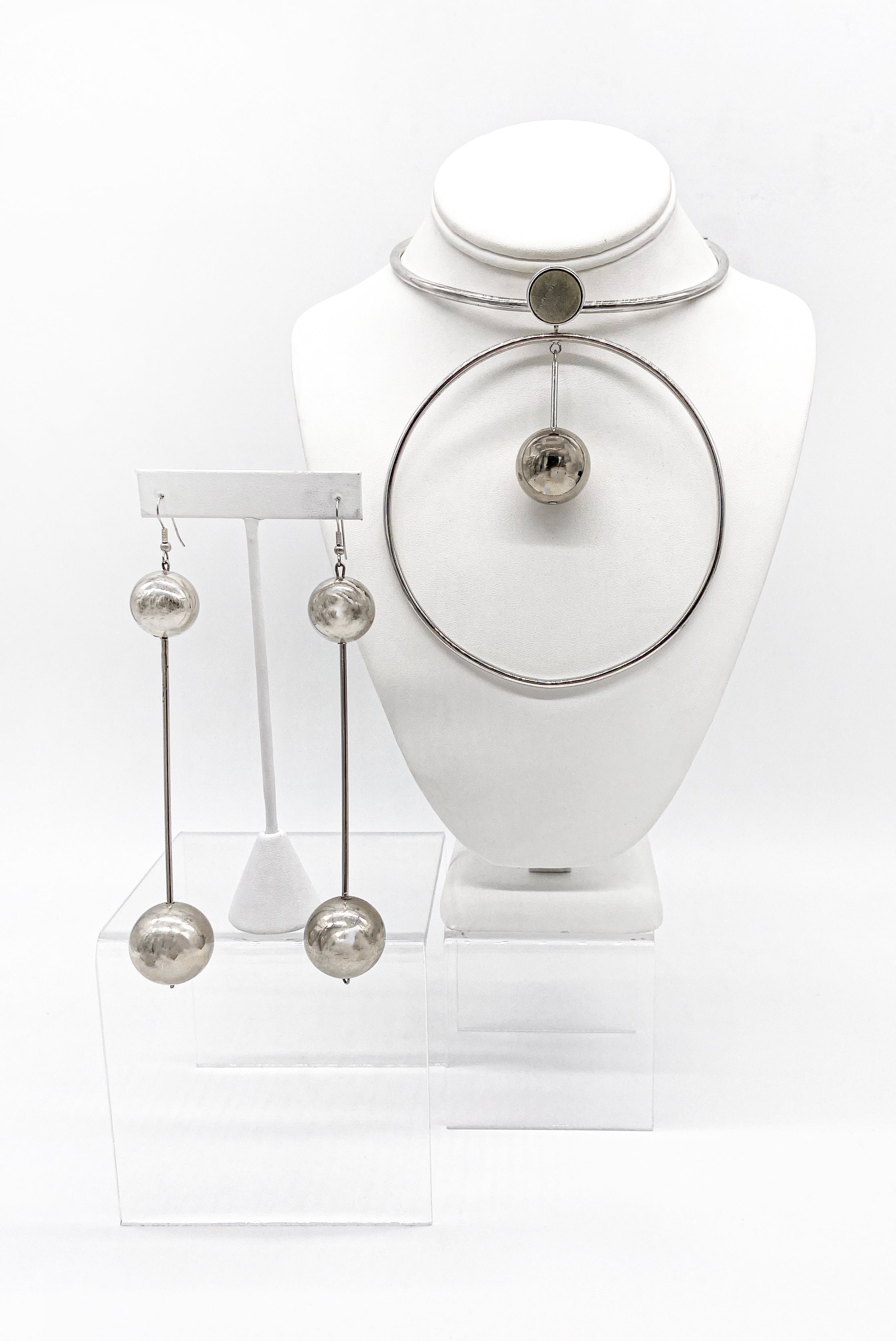 Eddie Borgo silver 1960s "Space Age" inspired necklace and earring set with globe details. The earrings have a clip on backing at the lobe with a long skinny drop into a silver globe. The necklace has a structured silver choker with a ball detail that dangles inside of an open oversized circle pendent.