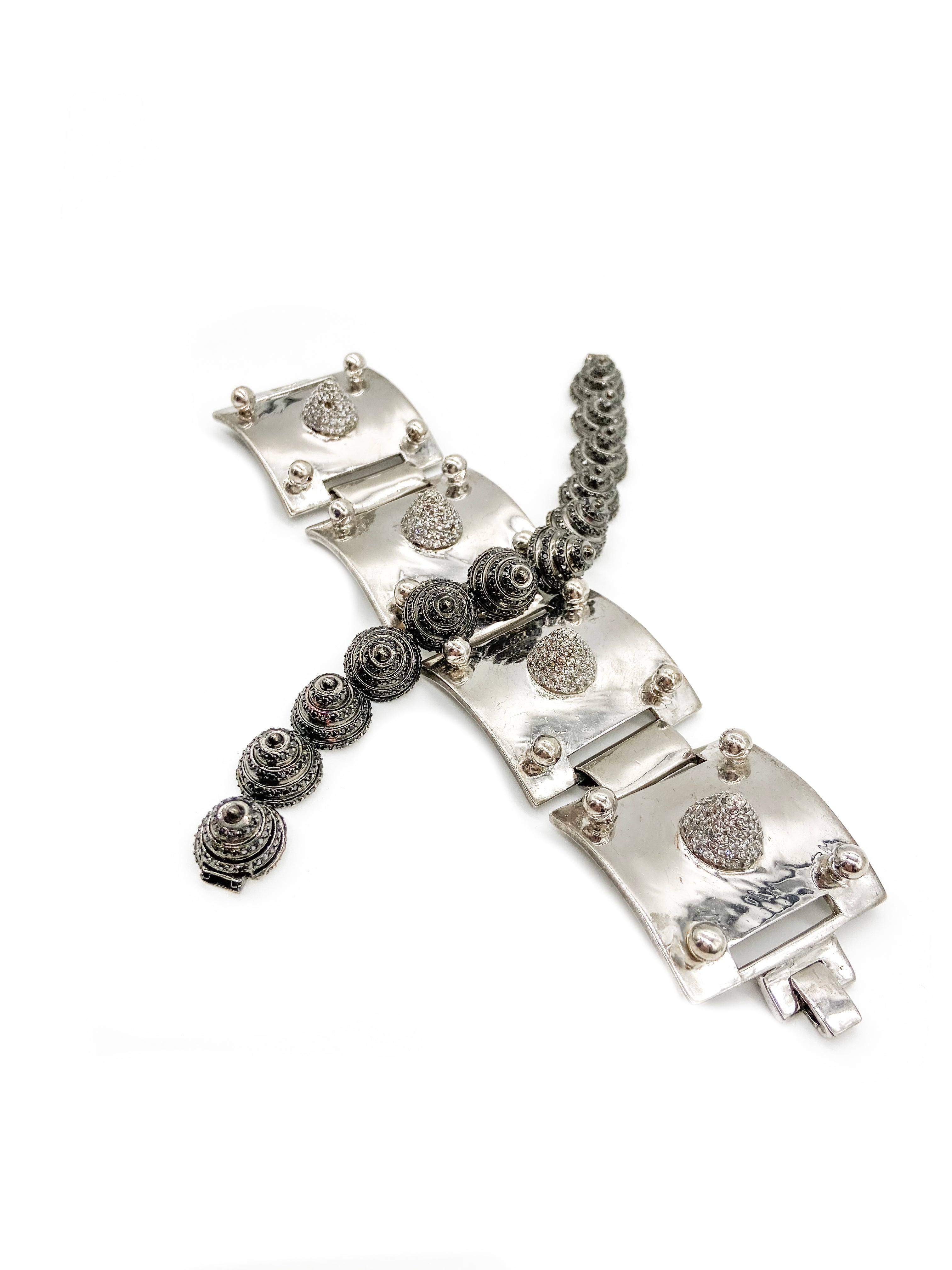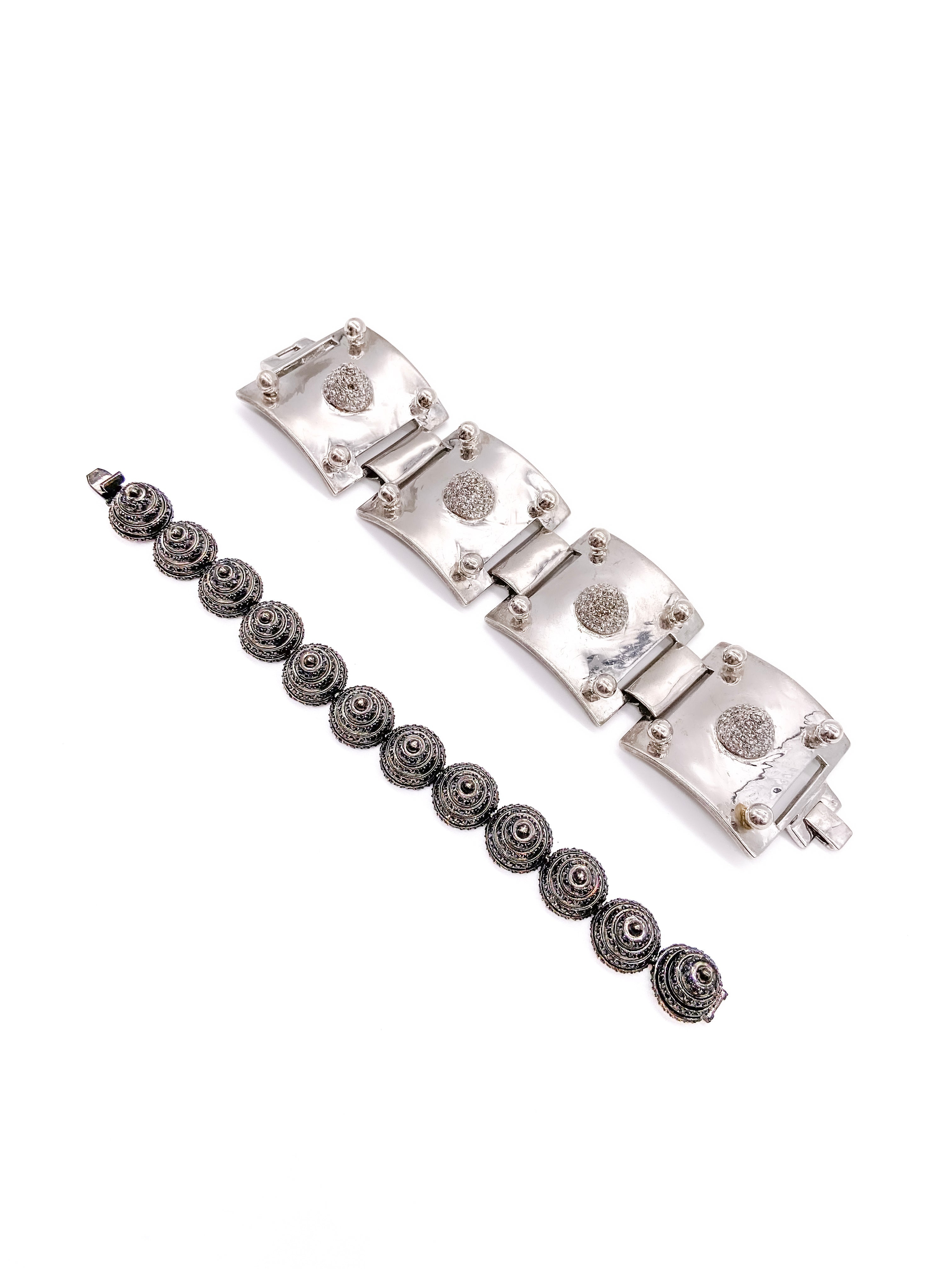 A set of Eddie Borgo cone bracelets with pavé crystal details. The first bracelet is the classic Eddie Borgo cone bracelet in a dark gunmetal with tiers of pavé crystals going up the cones. The second cuff composed of silver tone curved squares are linked together with a cone in the middle of each link covered in sparkling pavé diamonds. Each bracelet has a latch lock closure.For further information please inquire.