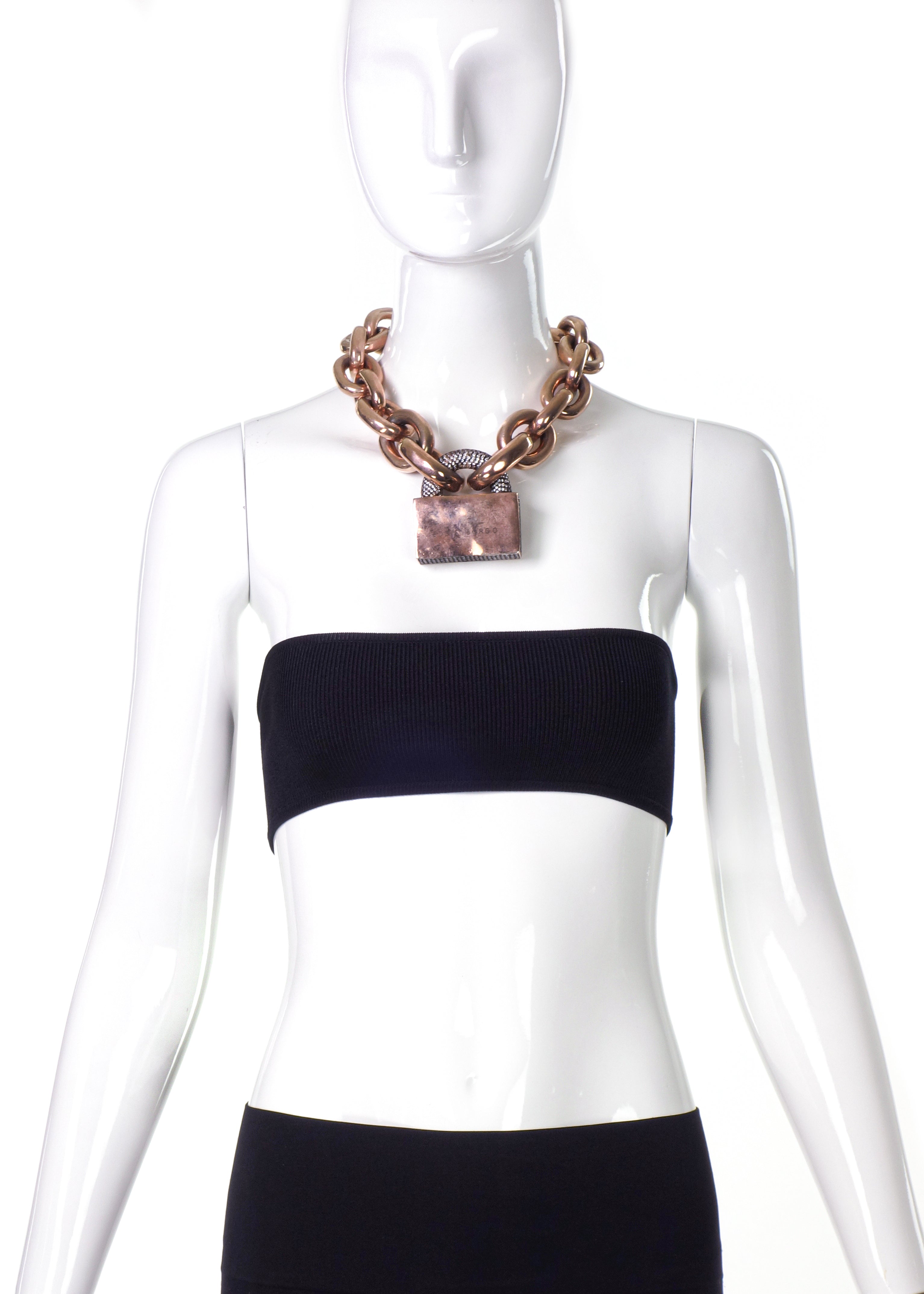 A one of kind Eddie Borgo rose gold, oversize chain necklace with a statement padlock pendent interlocked on the chain with pavé diamond details on sides and handle of padlock. There is a lock clasp to connect the right and left sides of the necklace.