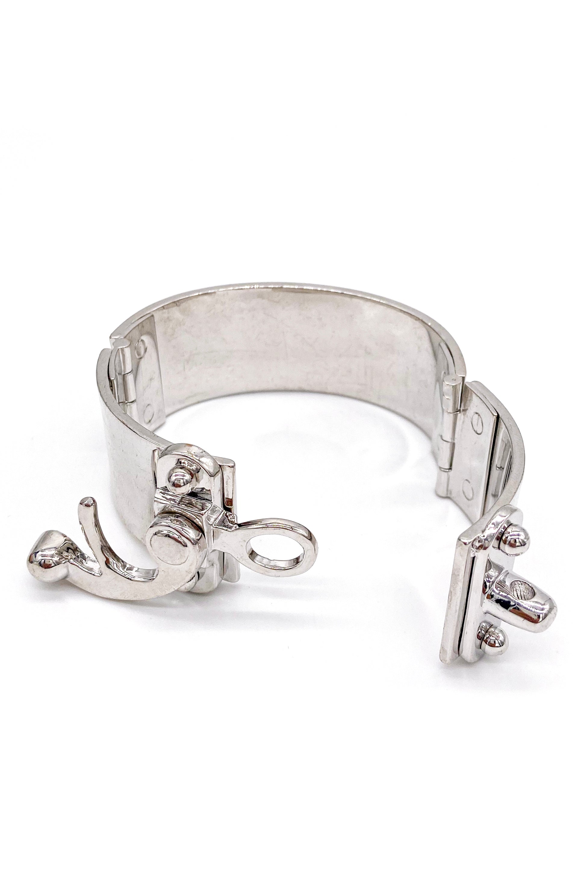 An Eddie Borgo silver cuff bracelet with a hook and latch hardware detail. The hook and latch closure have a ball detail on the latch with hinges that open the cuff. The cuff is stamped Eddie Borgo Jewelry on the interior of the cuff.