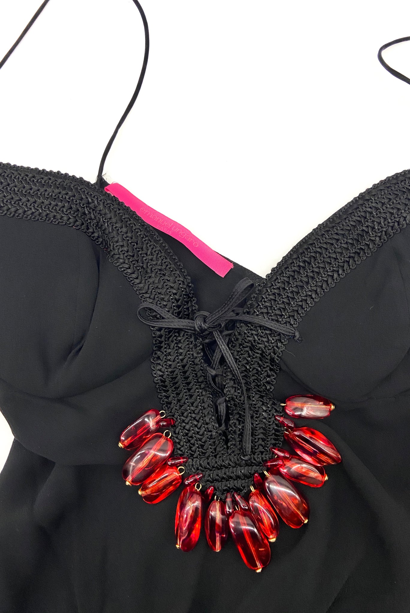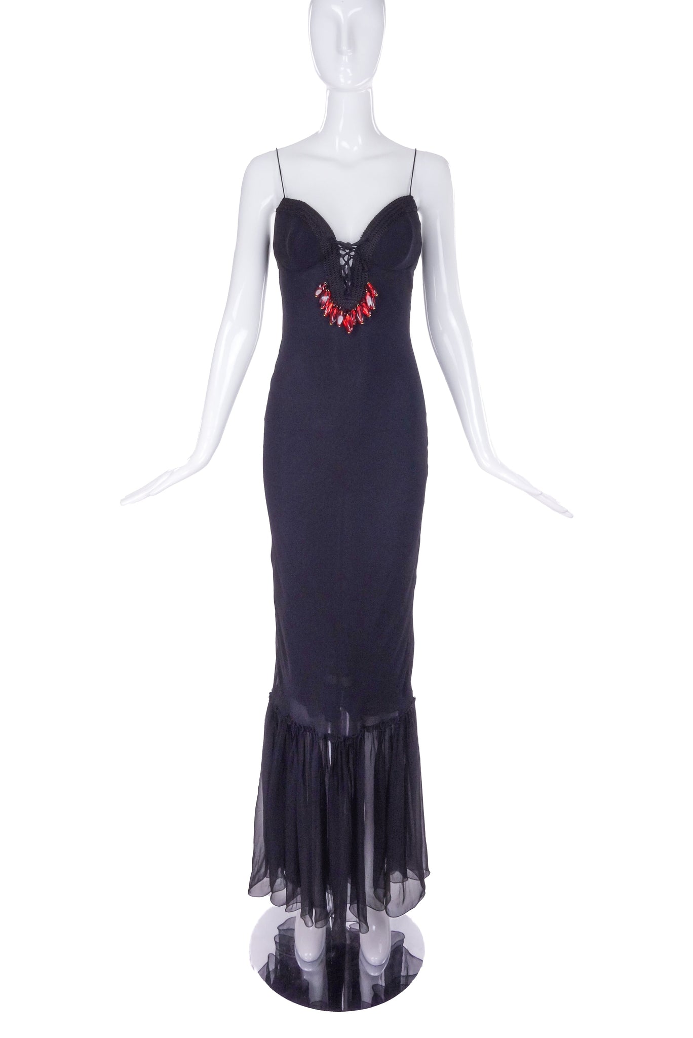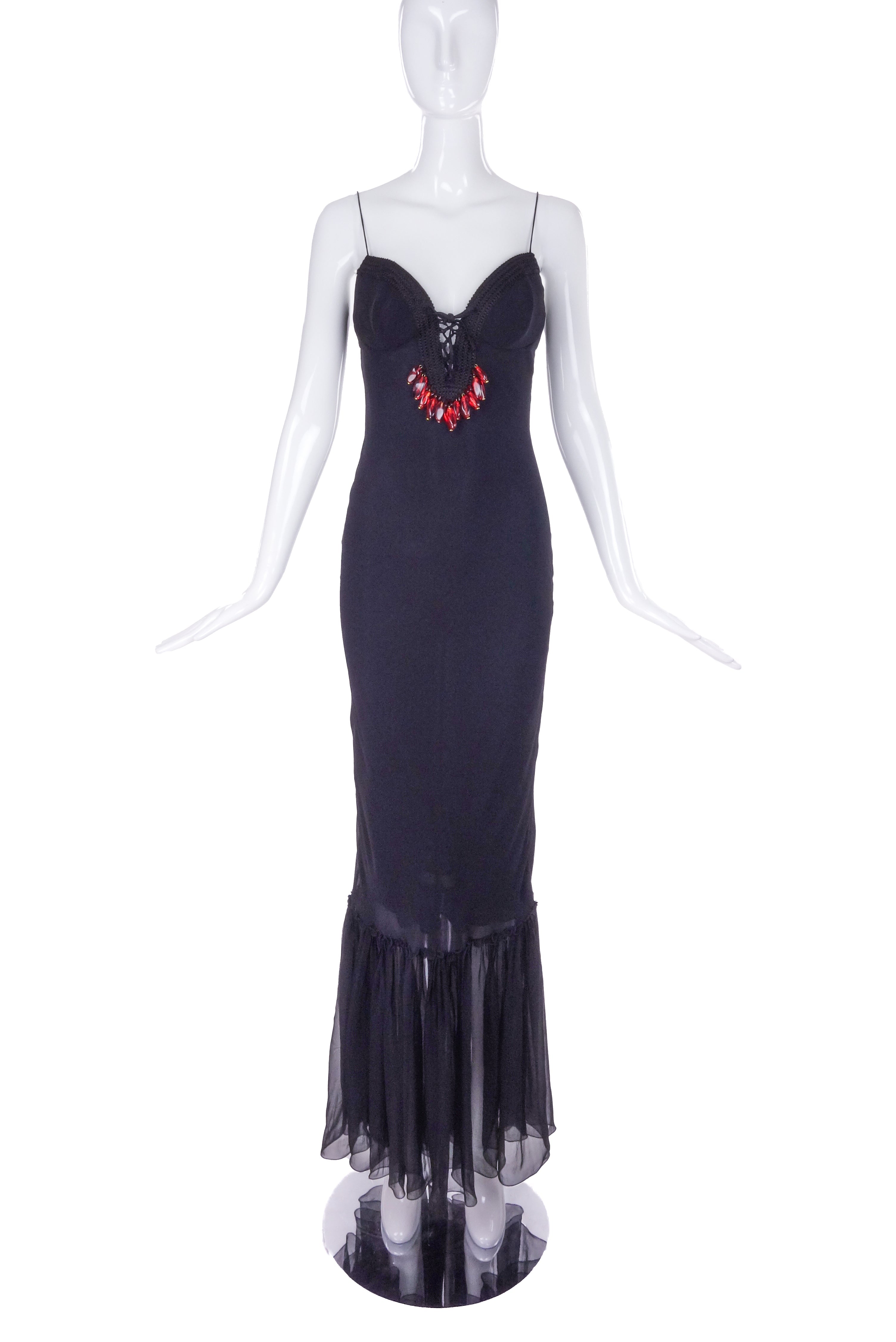 An Emanuel Ungaro black chiffon gown with oversize red glass beads cascading around the lace up bust. The bust of the gown has black ribbon braid details along the cups of the bust. The floor length chiffon gown has small ruffle details around the skirt under the knee to create a mermaid silhouette. The gown has an invisible zipper down the back. Circa 2000s.