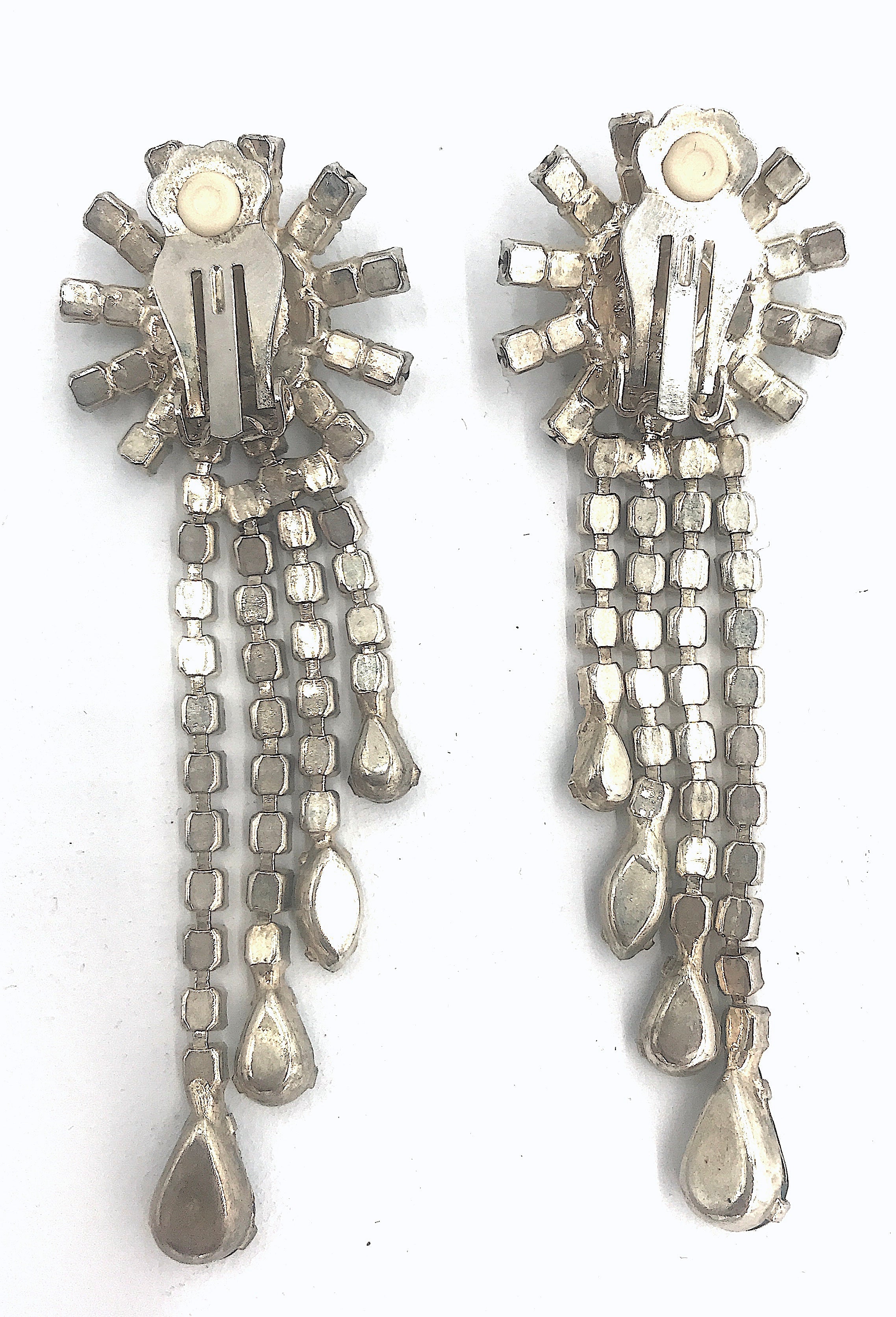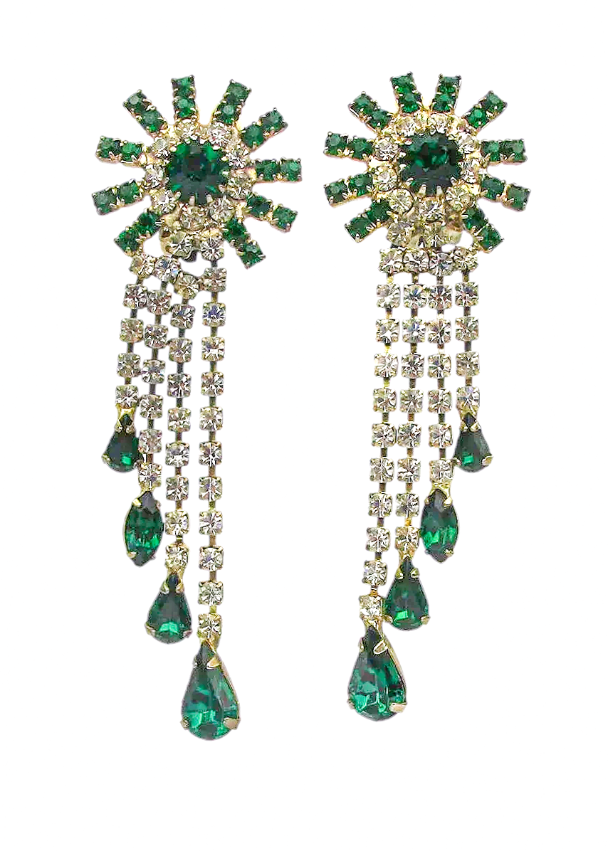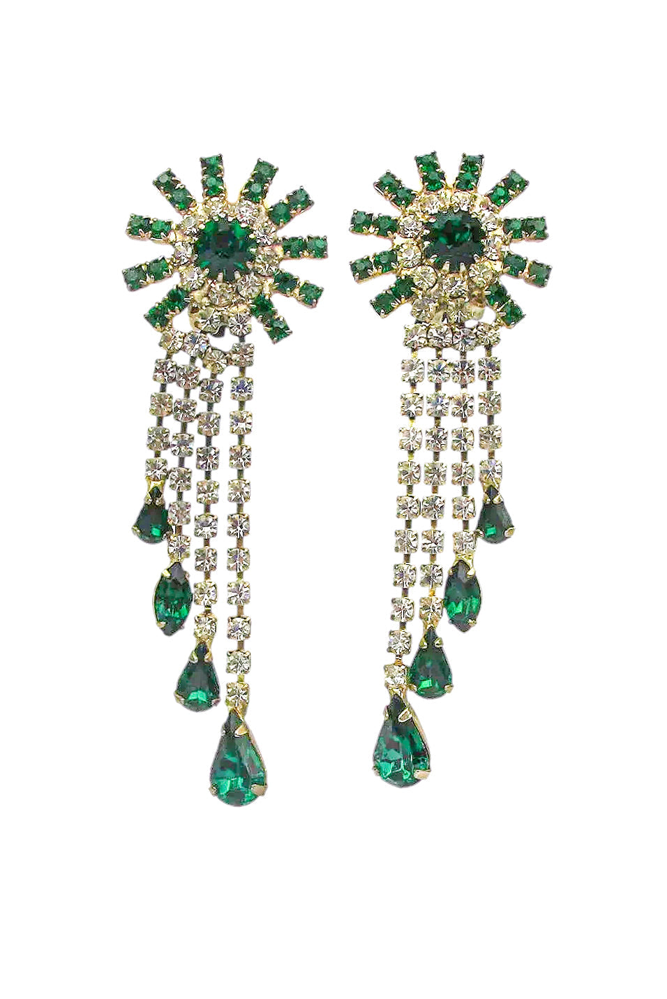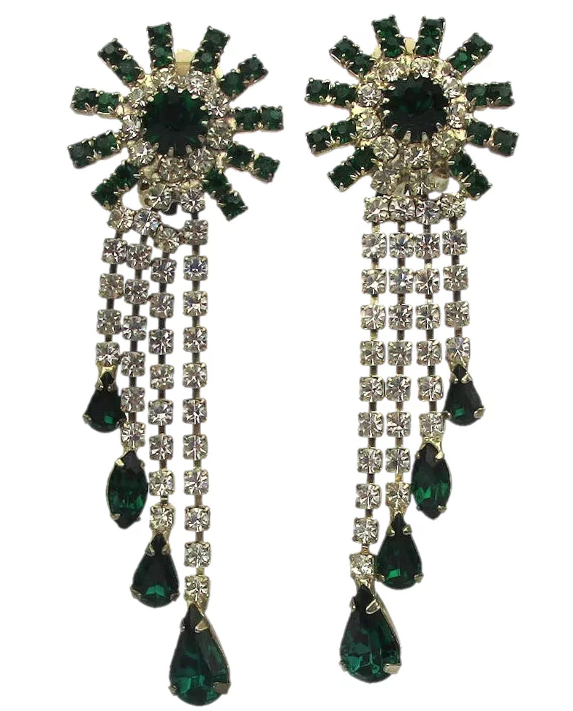 These sultry costume clip earring are made are high quality costume jewelry with stunning costume crystal and emeralds in a silver setting. The design is unique with a sunburst post and four graduated rhinestone tassels hanging below. Made circa the 1950's. Clip on backings.