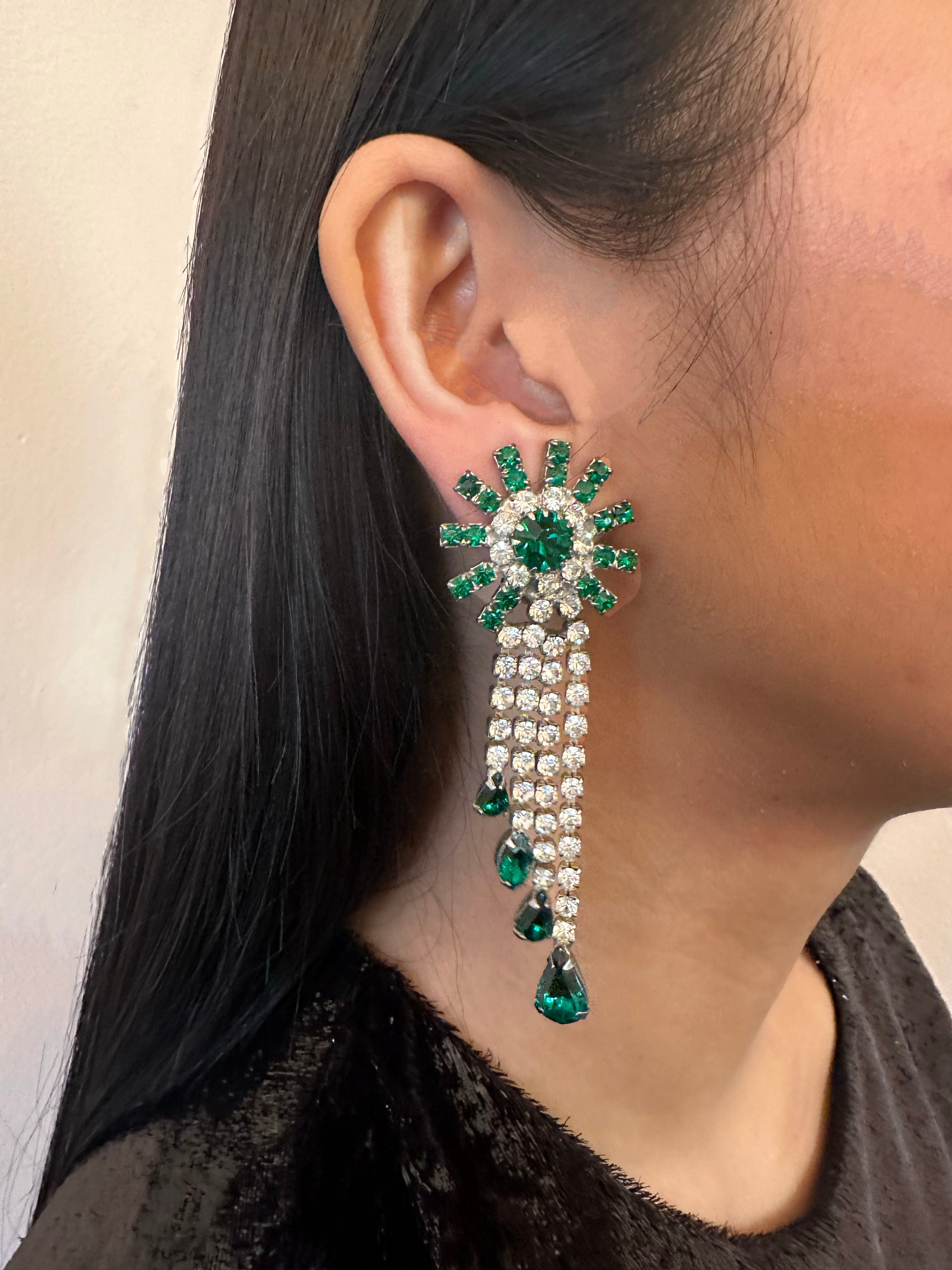 Vintage Silver Emerald Green and Diamond Cascading Rhinestone Crystal Earrings