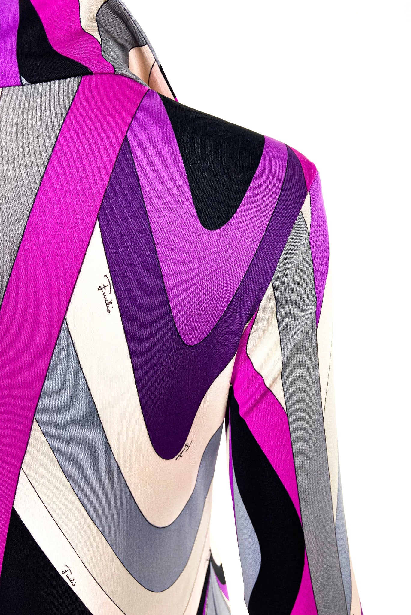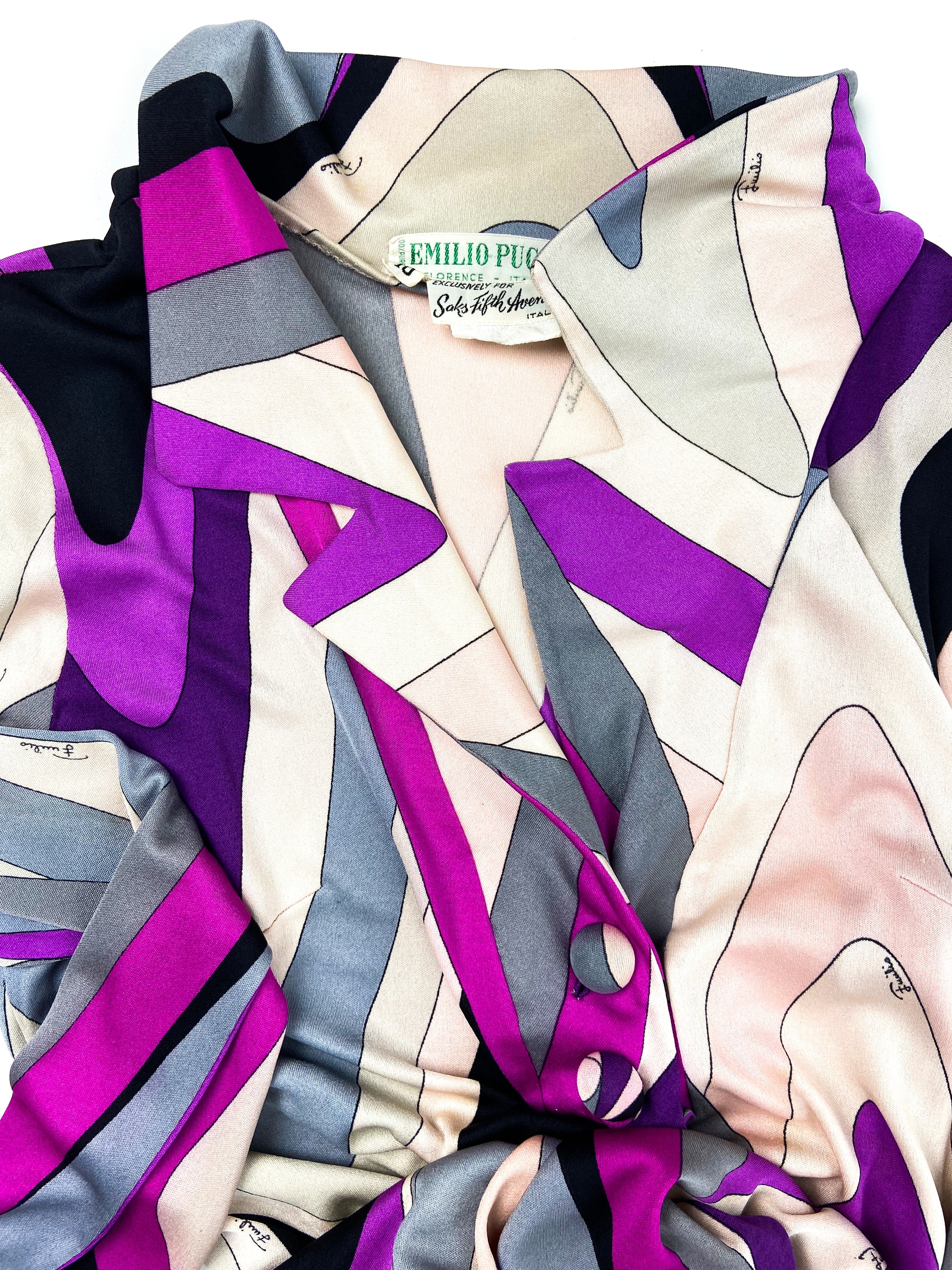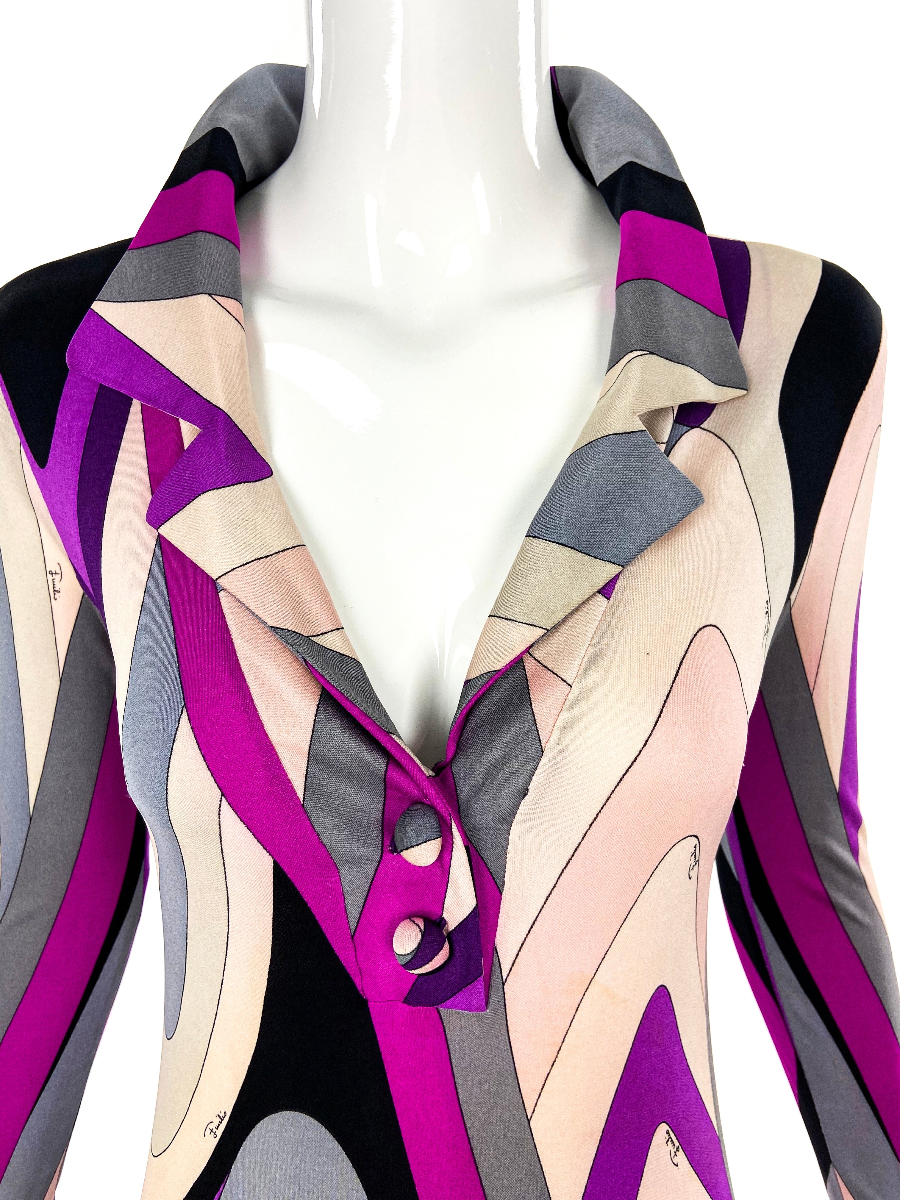 A vintage Emilio Pucci classic geometric print long sleeved midi dress in blush pink, ivory, grey black and shades of purple. The dress has a classic 1970's notched lapel style at the color with a slightly v-neckline. The dress has two fabric covered buttons just below the point of the neckline. Circa 1960s.