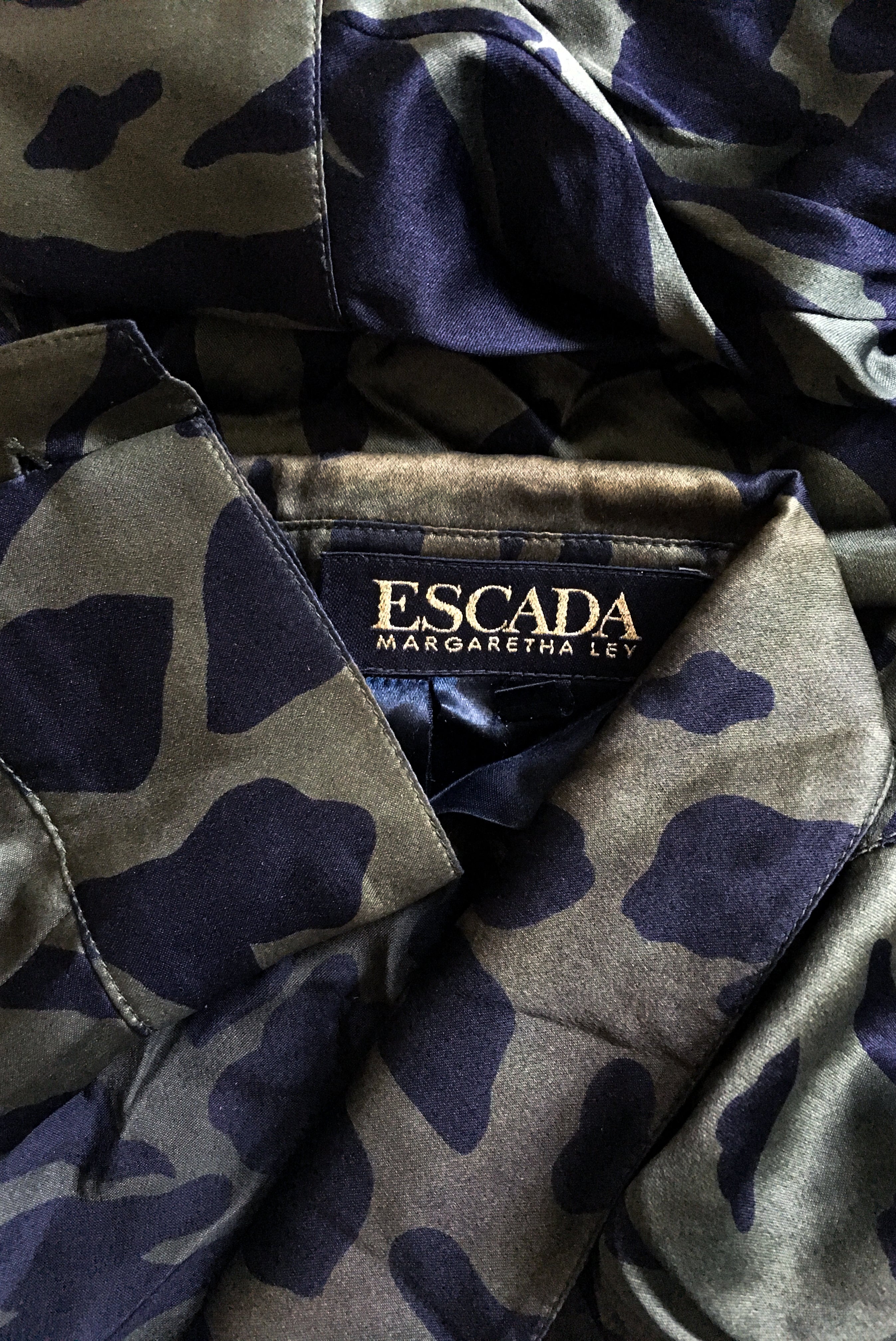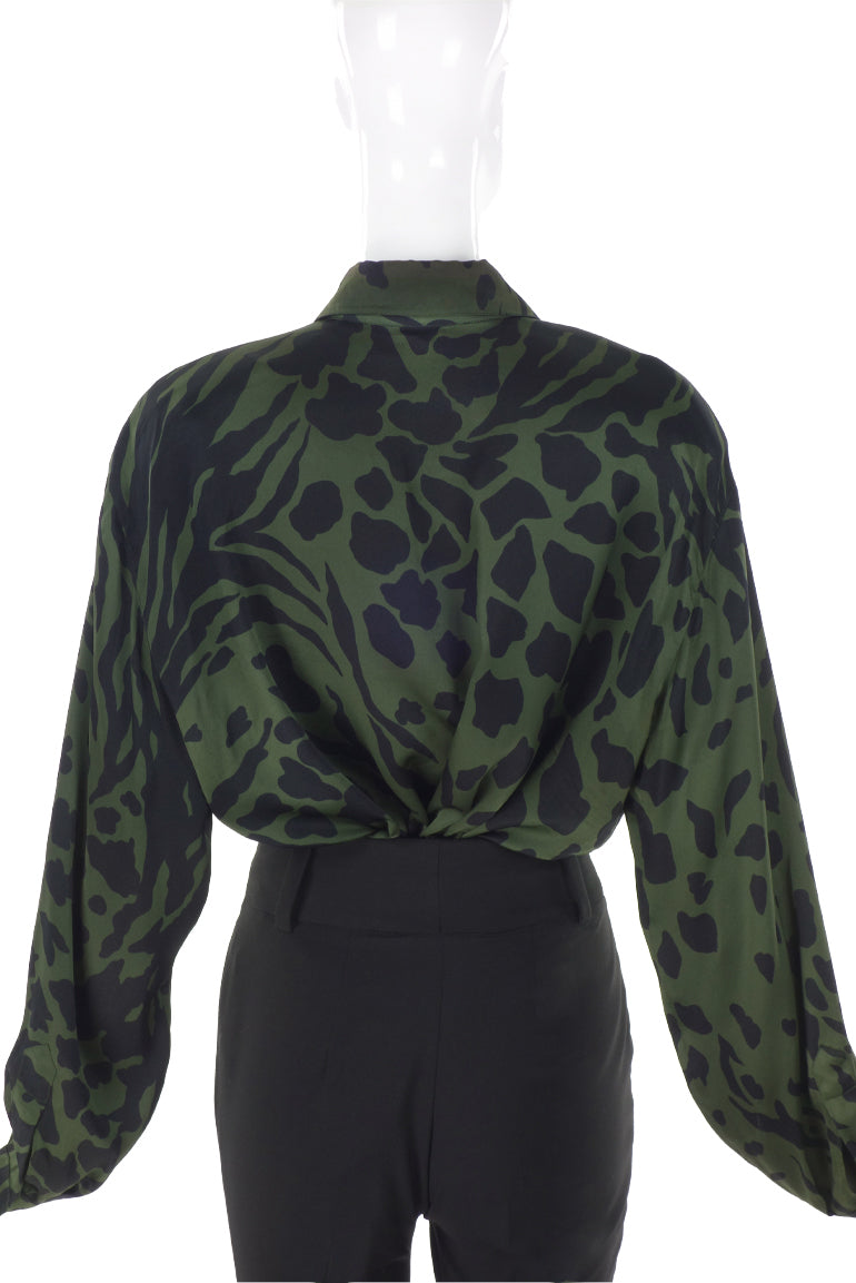 An Escada forest green silk button-up collared long sleeve blouse. The blouse has a mixture of black animal prints to create and interesting and abstract pattern. The top has concealed buttons up the front.