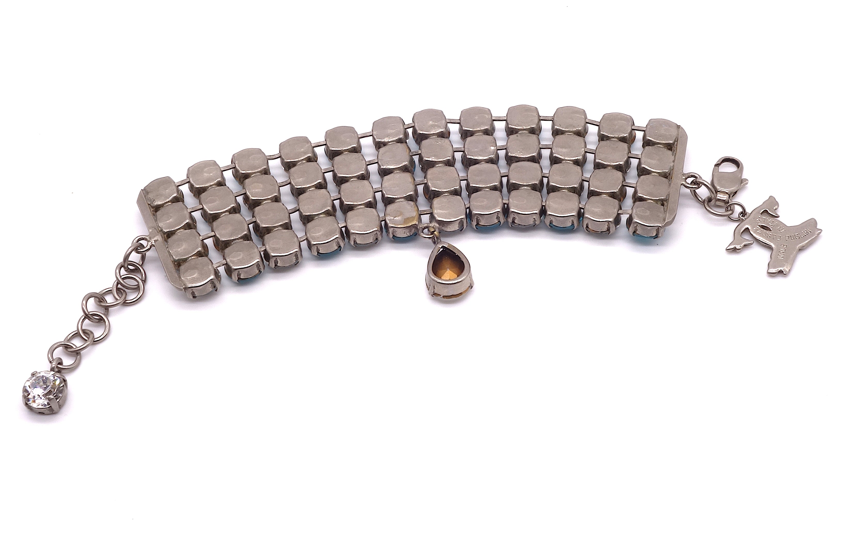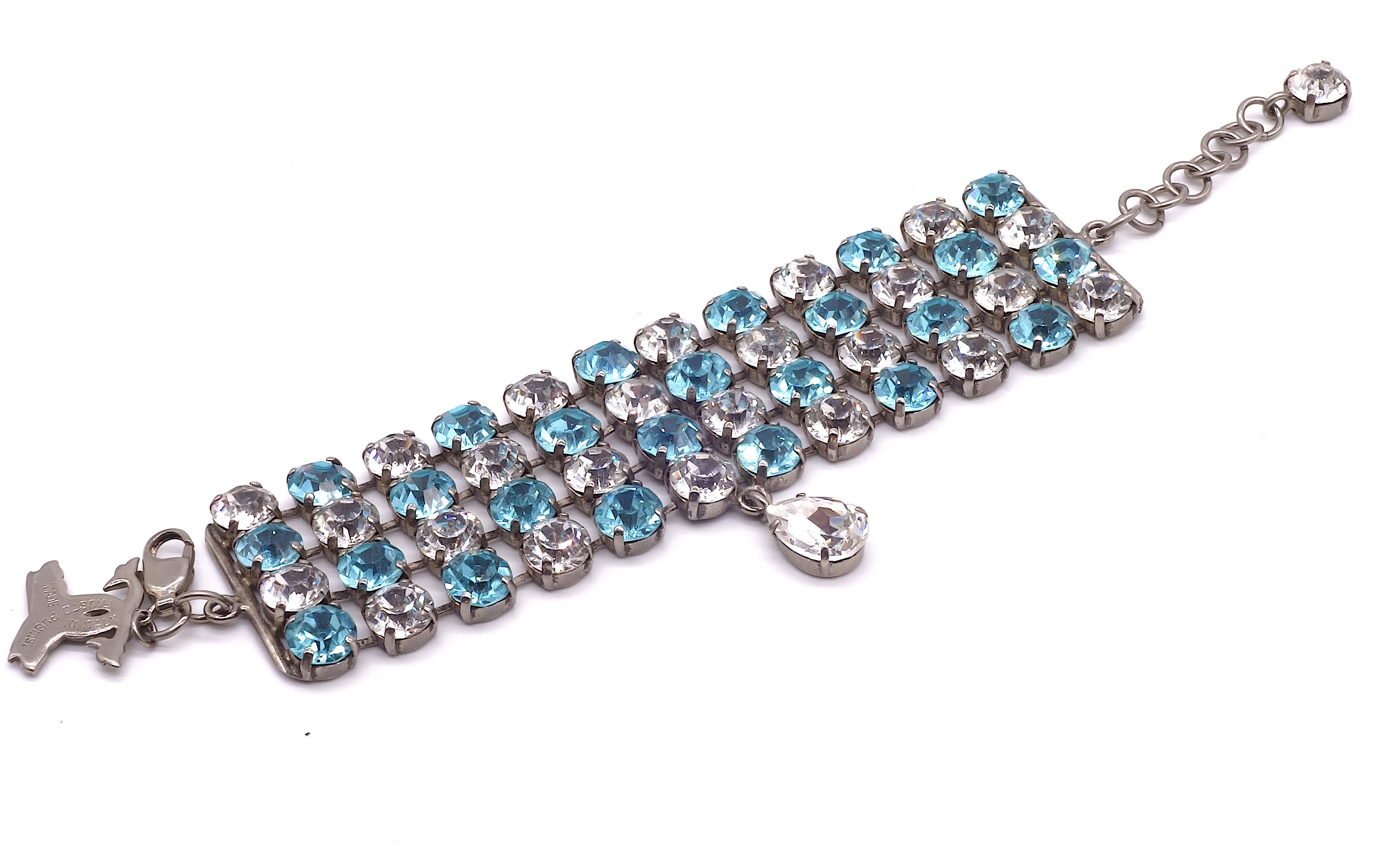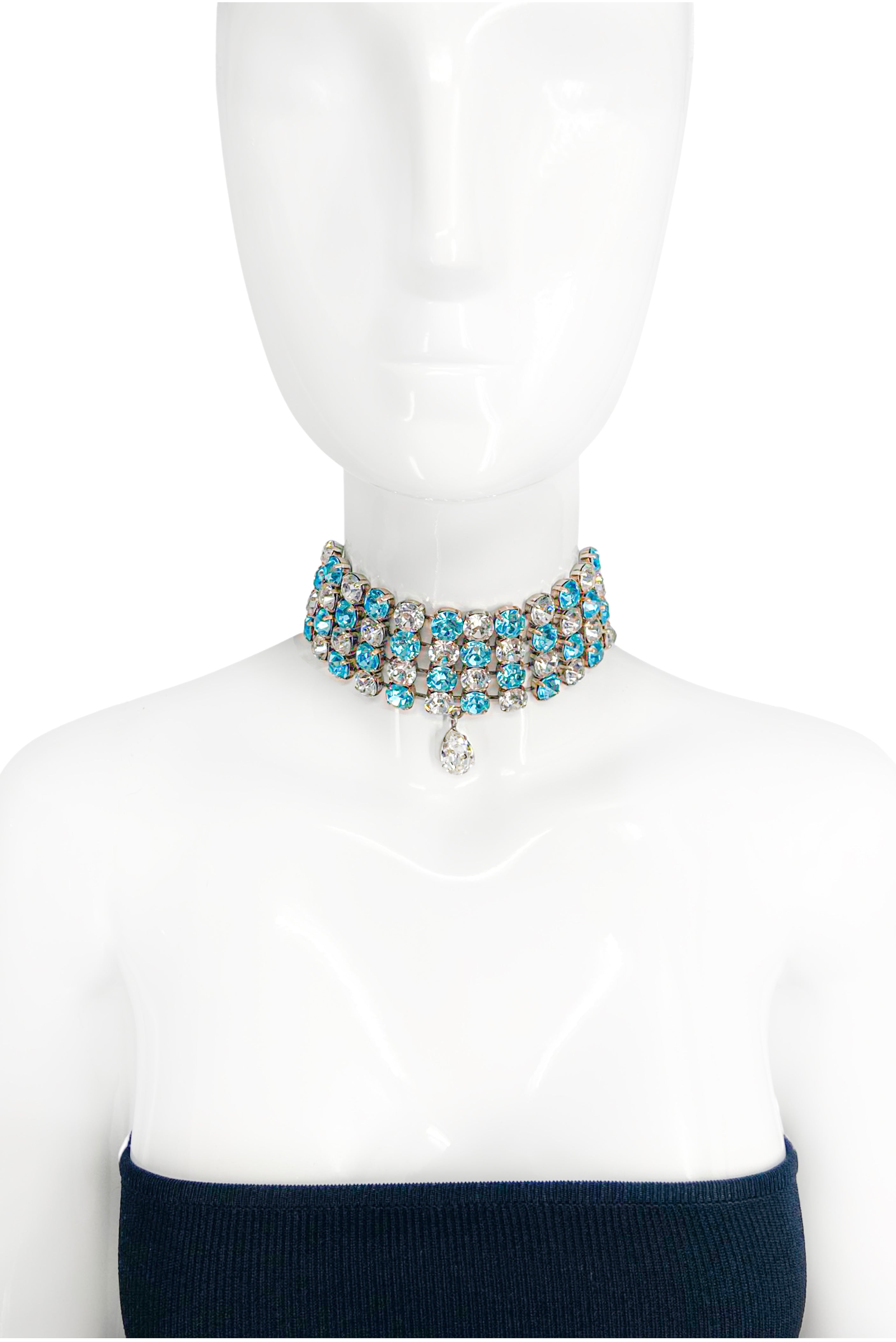 Fausto Puglisi Aquamarine and Clear Diamond chain cuff with a tear drop crystal pendent detail. With extenders it can be worn as a choker. The bracelet / choker is from the Fausto Puglisi Fall / Winter 2001 collection.