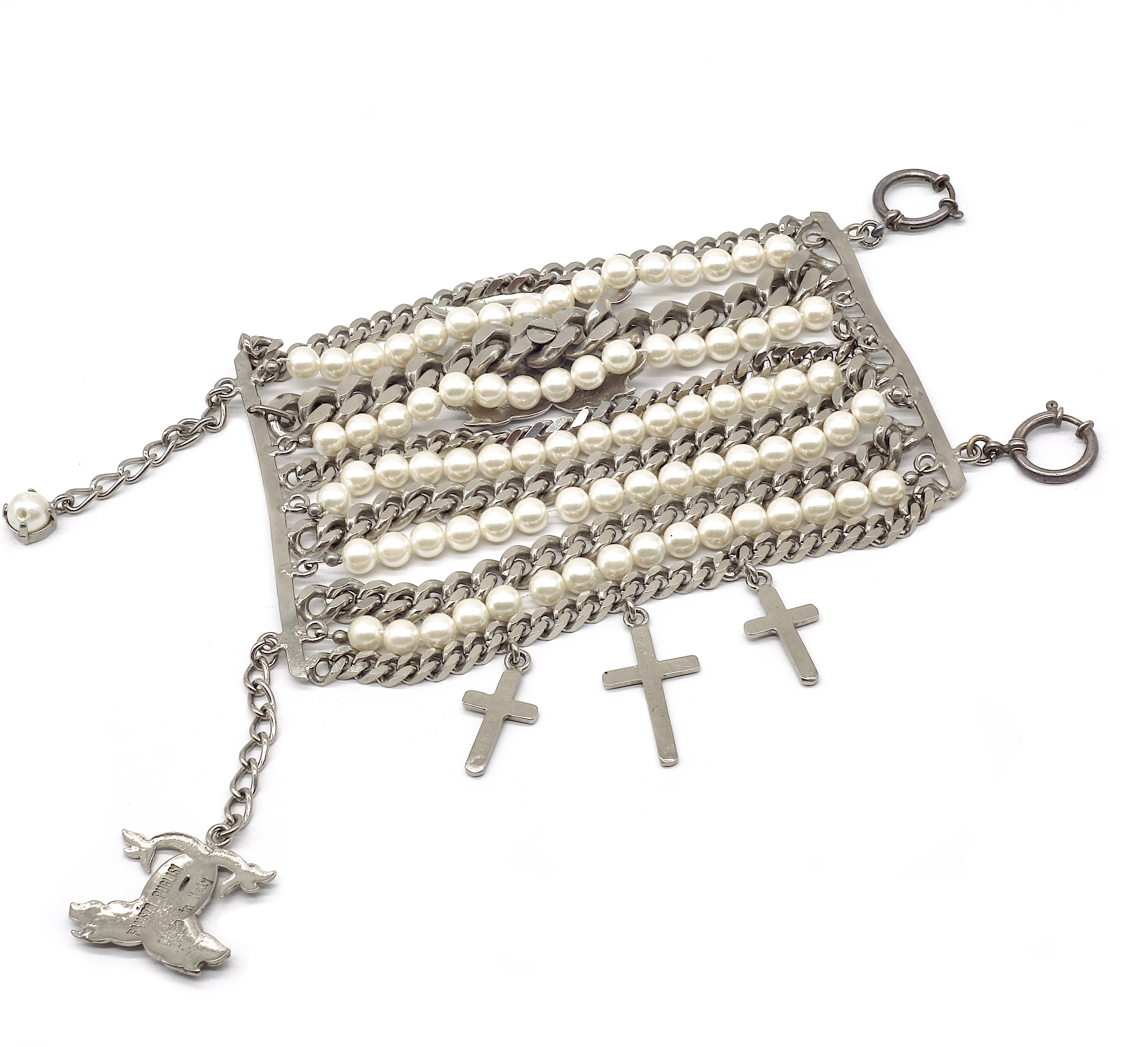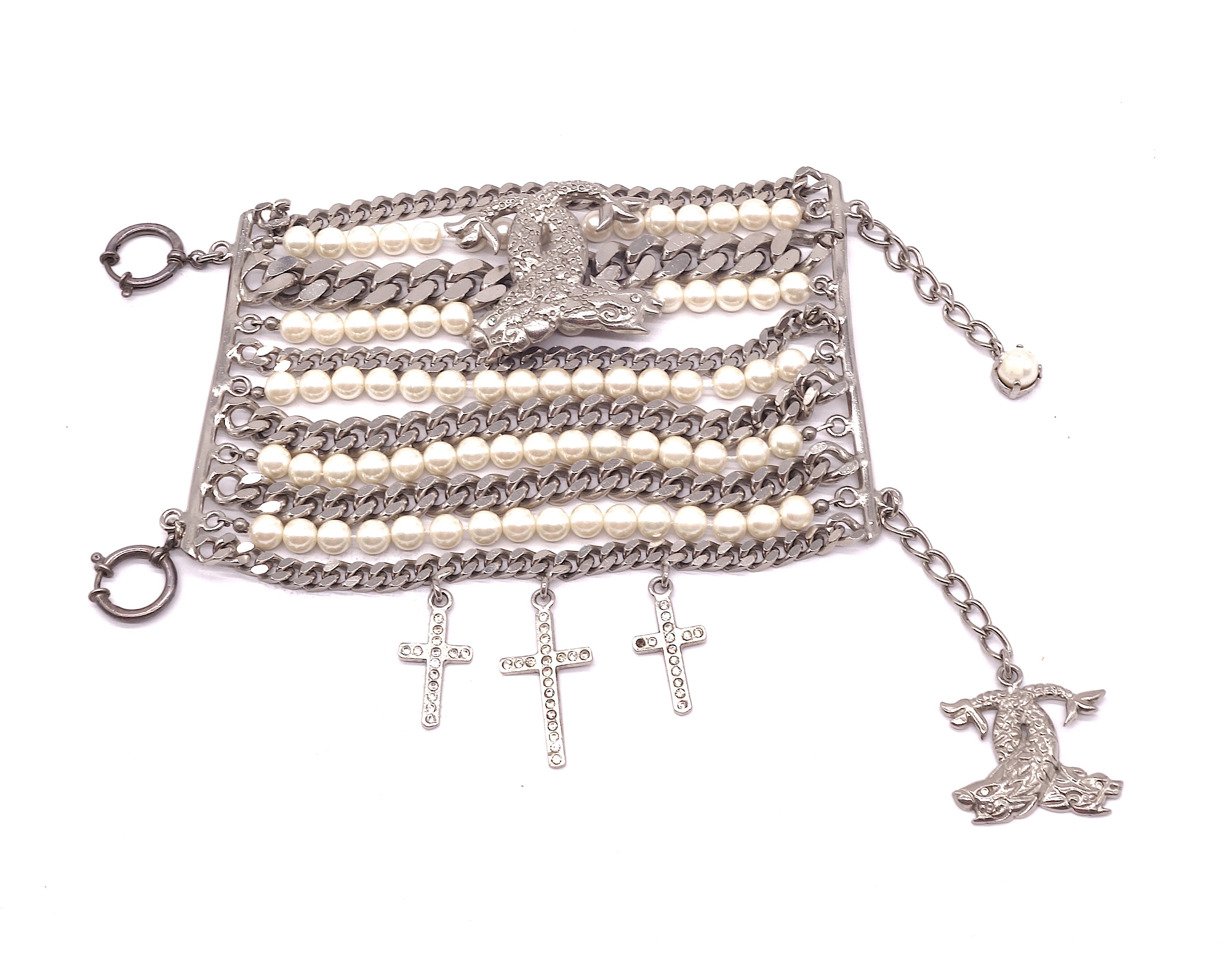 Fausto Puglisi Pearl and Metal Chain Huge Cuff Bracelet with Crosses