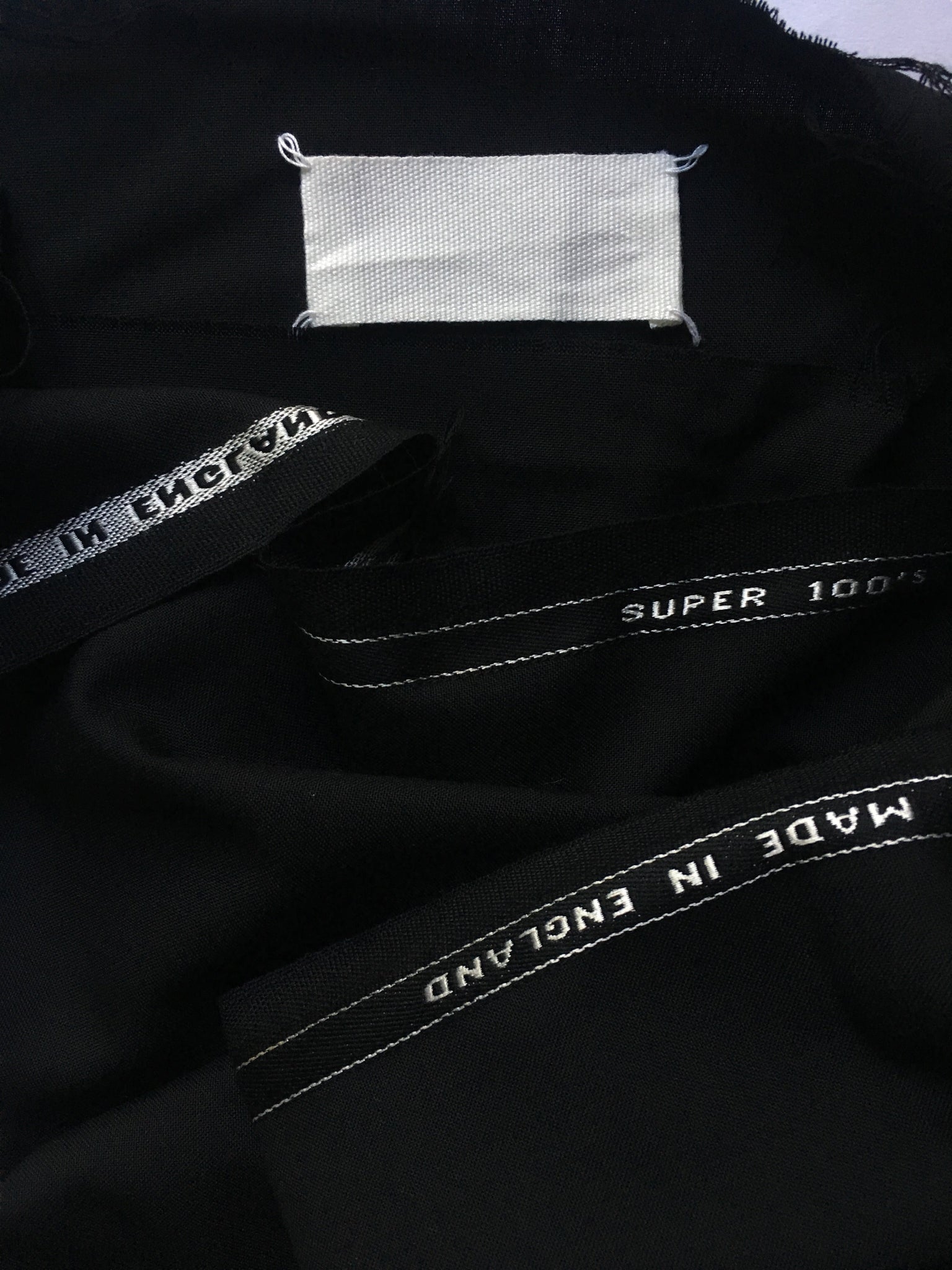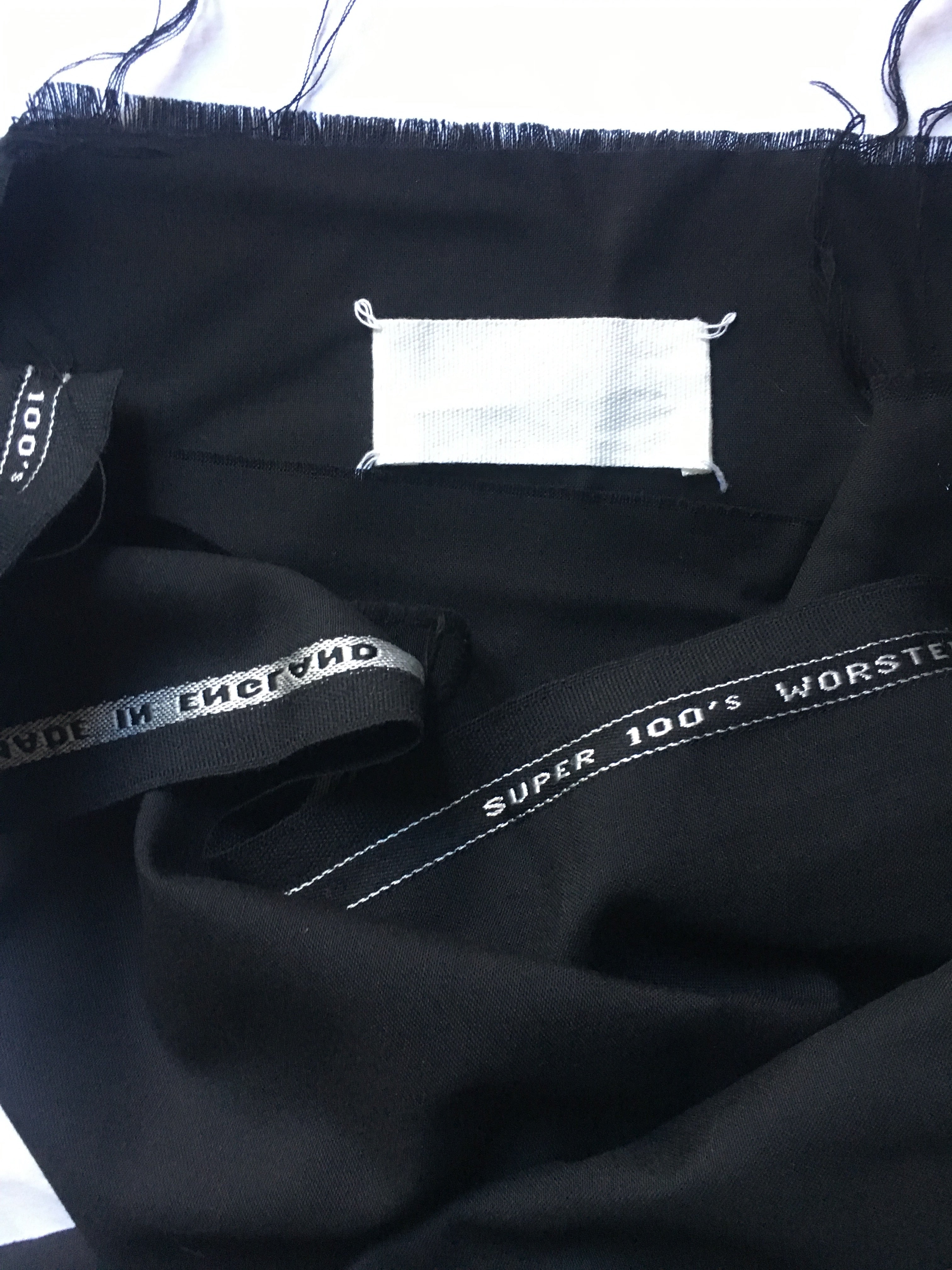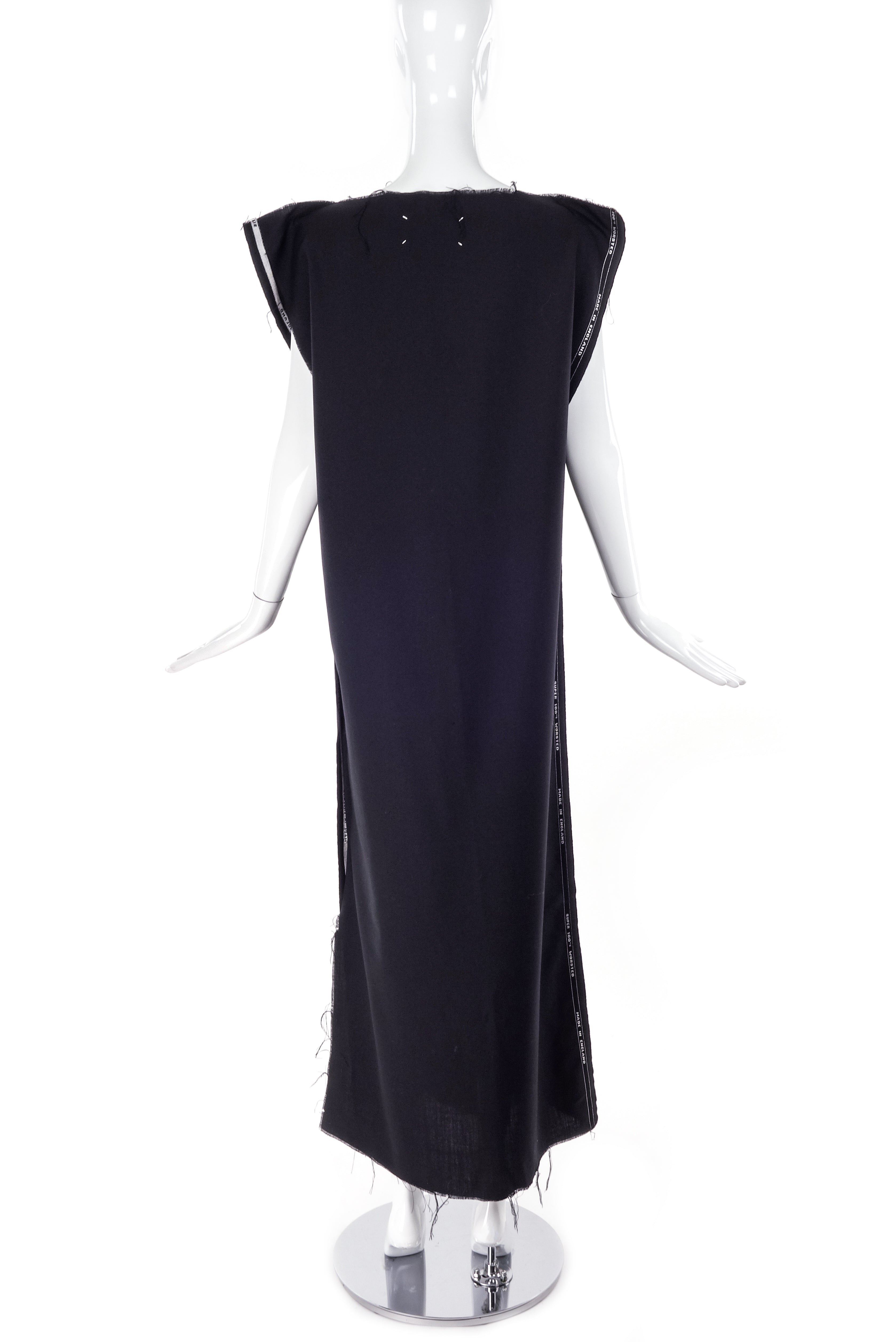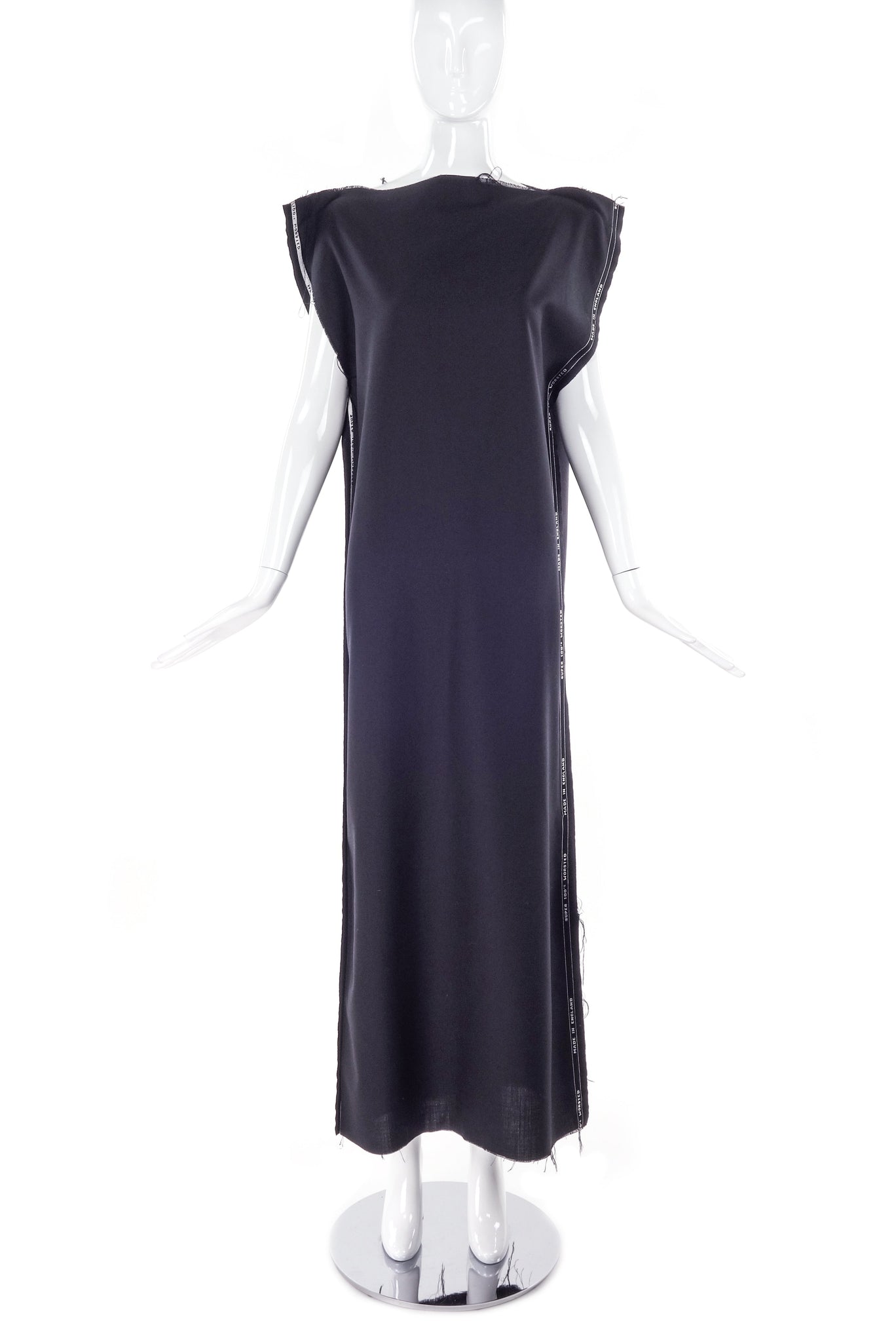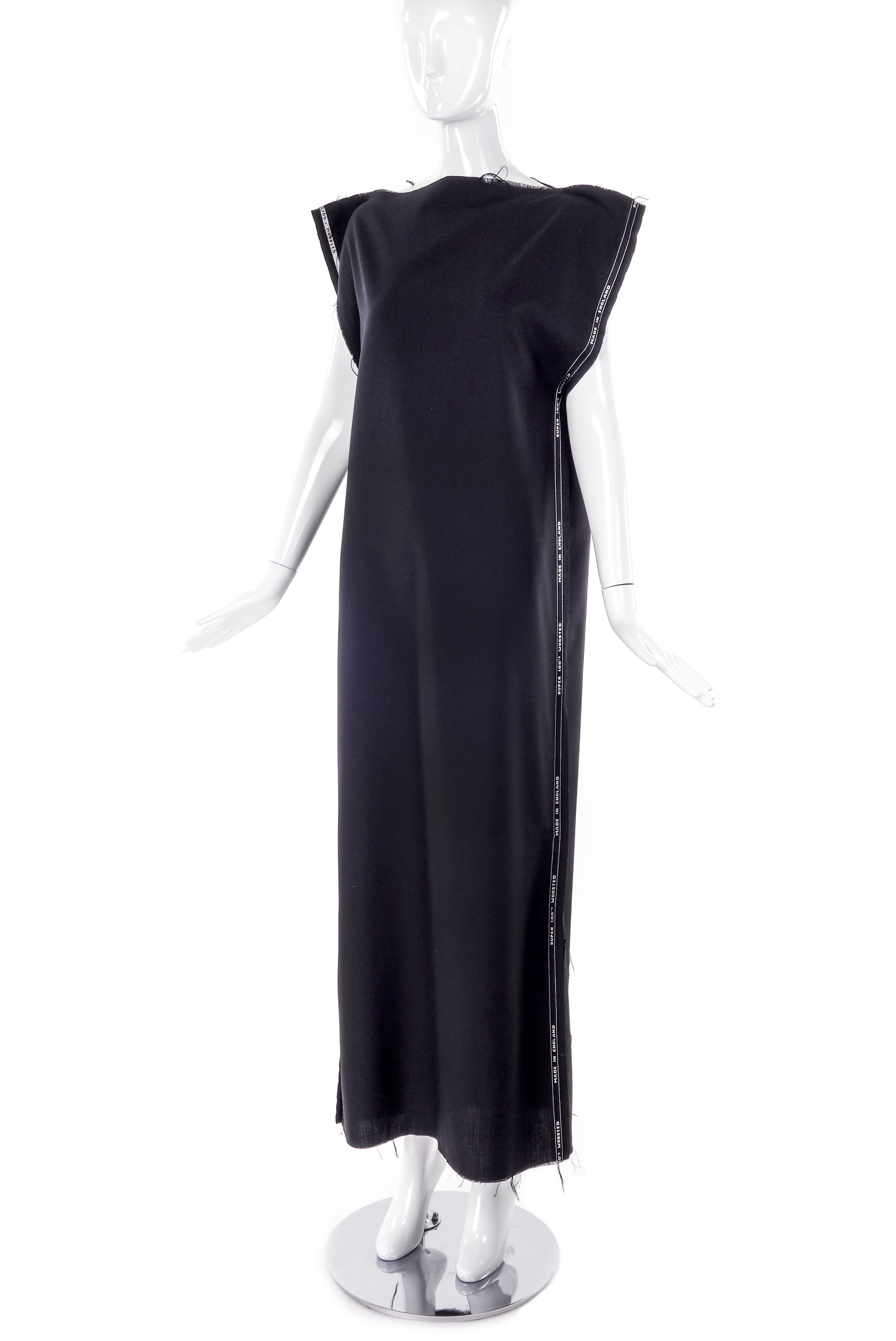 An iconic Maison Martin Margiela black wool dress created from two panels of woven fabric stitched together. The panels of the dress are hemmed by a selvedge imprinted with “Made in England…Super 100…Worsted,” which are usually indicative of the last parts on a roll of fabric. The dress was created to highlight the different stages of work that go into creating garments in a couture atelier and is reminiscent of the ancient greek's chiton garment. From the Maison Martin Margiela Fall / Winter 1997 collection.