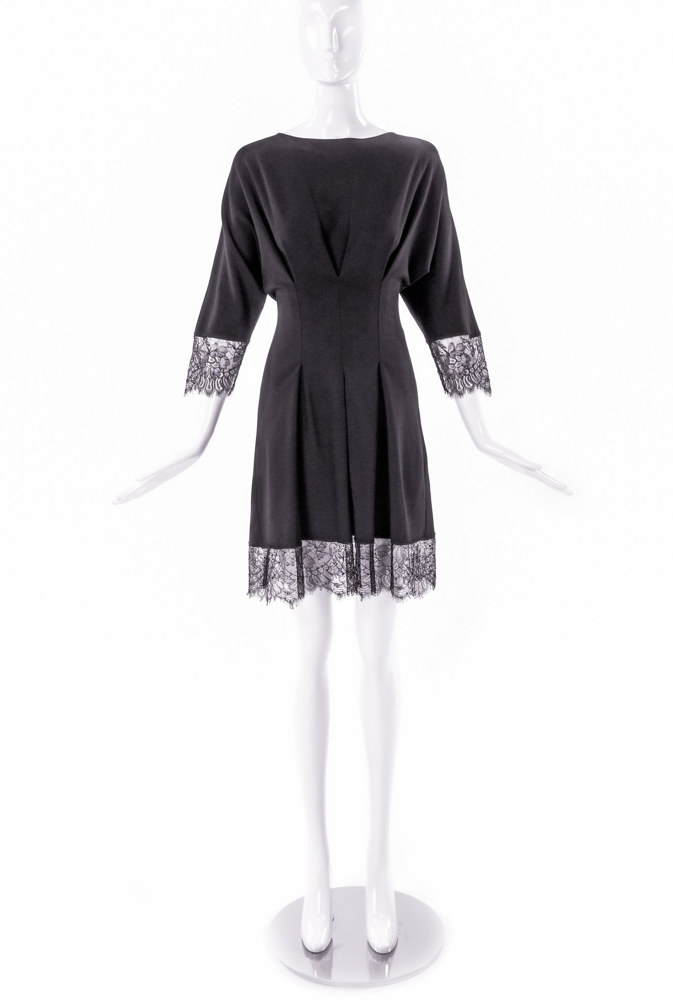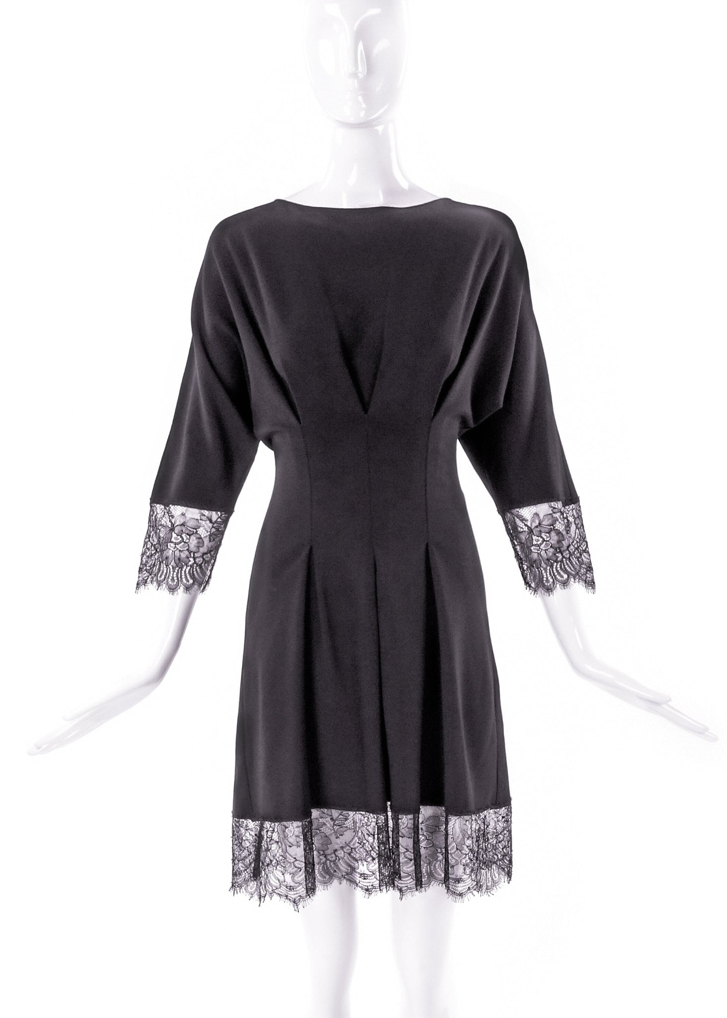 A Francesco Scognamiglio black 3/4 sleeve dress with a cinched in waist creating a flattering pleat detail along the bust and giving the skirt a fullness. There is beautiful lace details along the hem of the skirt and at the cuff of the sleeves. The back of the dress has an exposed zipper and hook and eye closure.