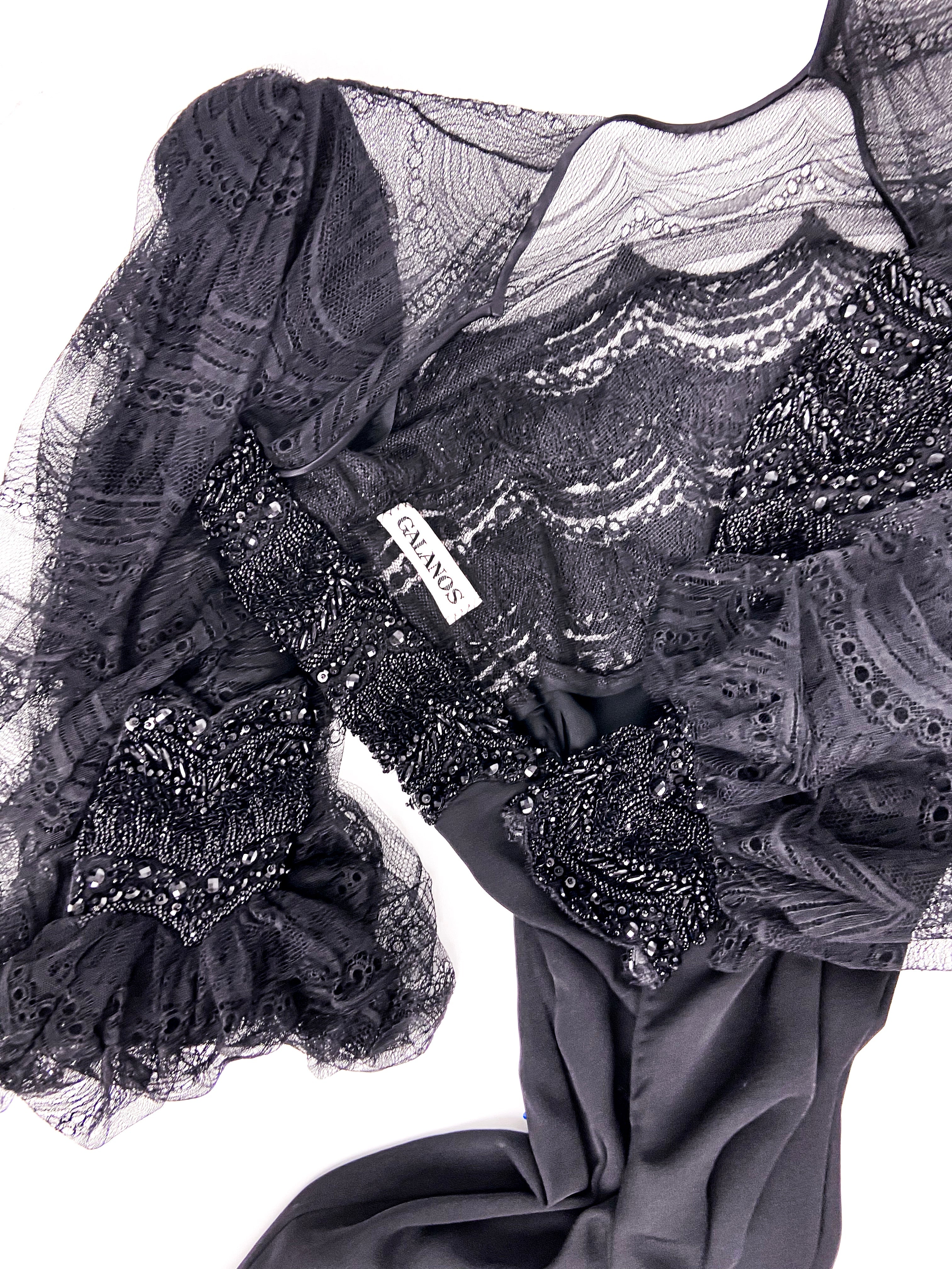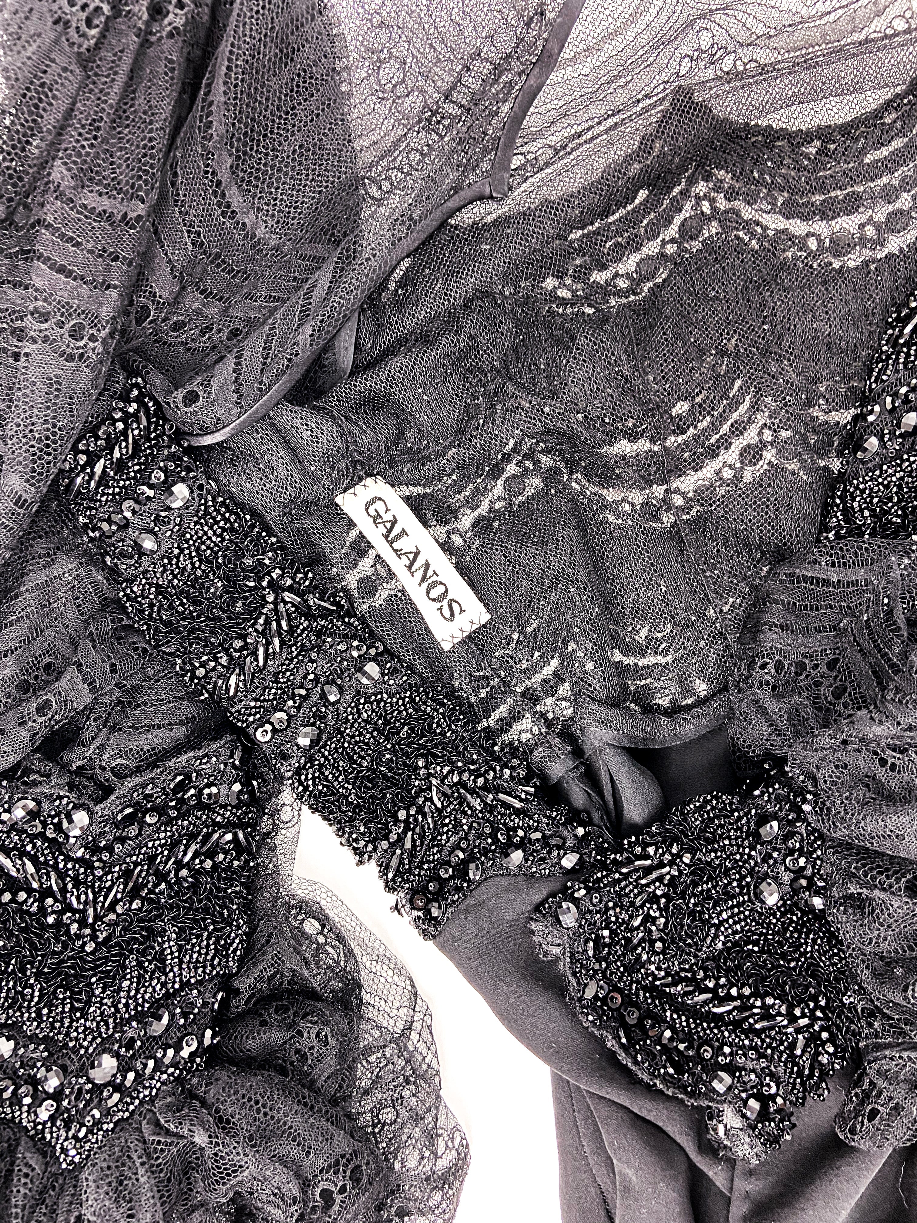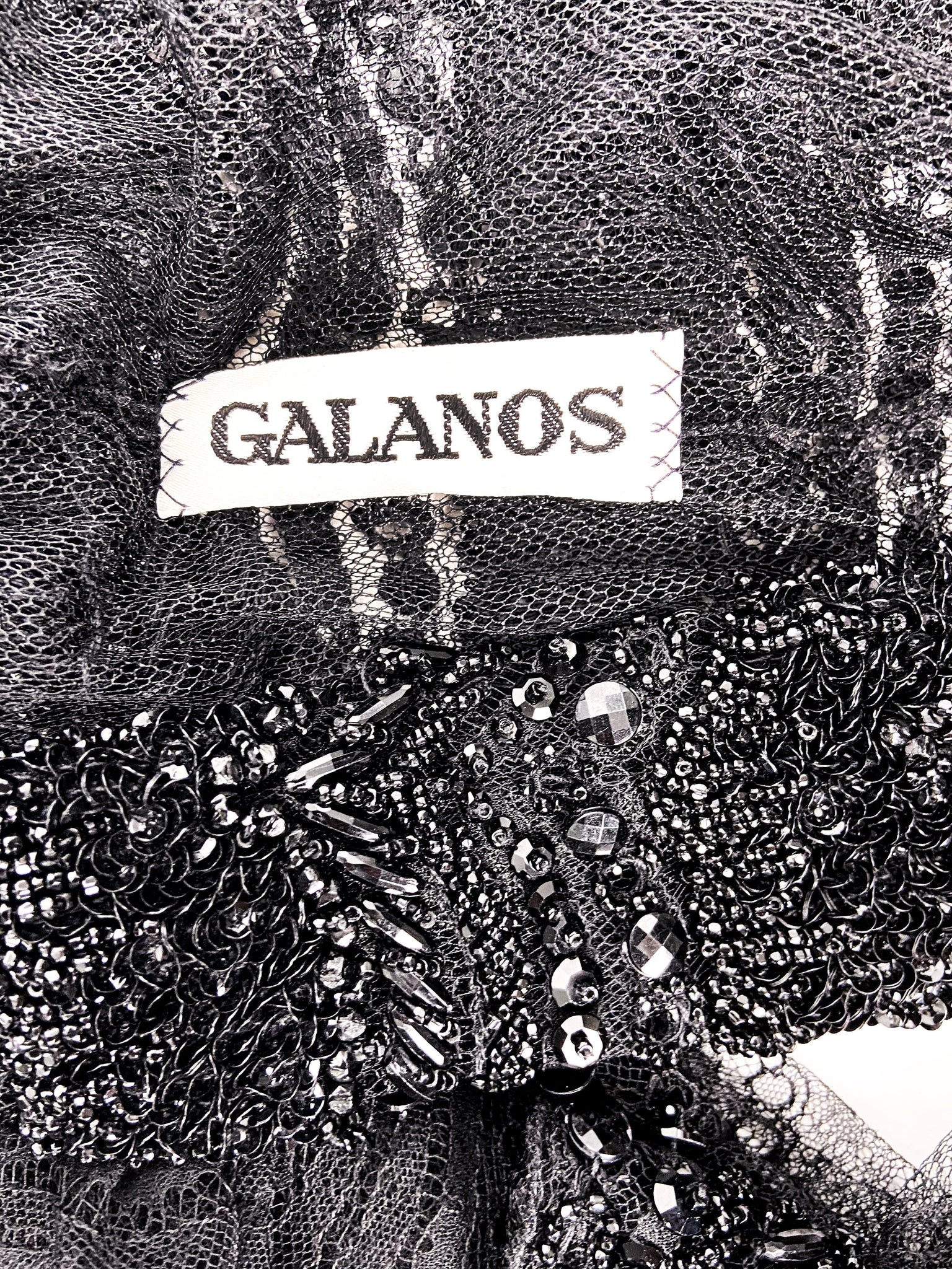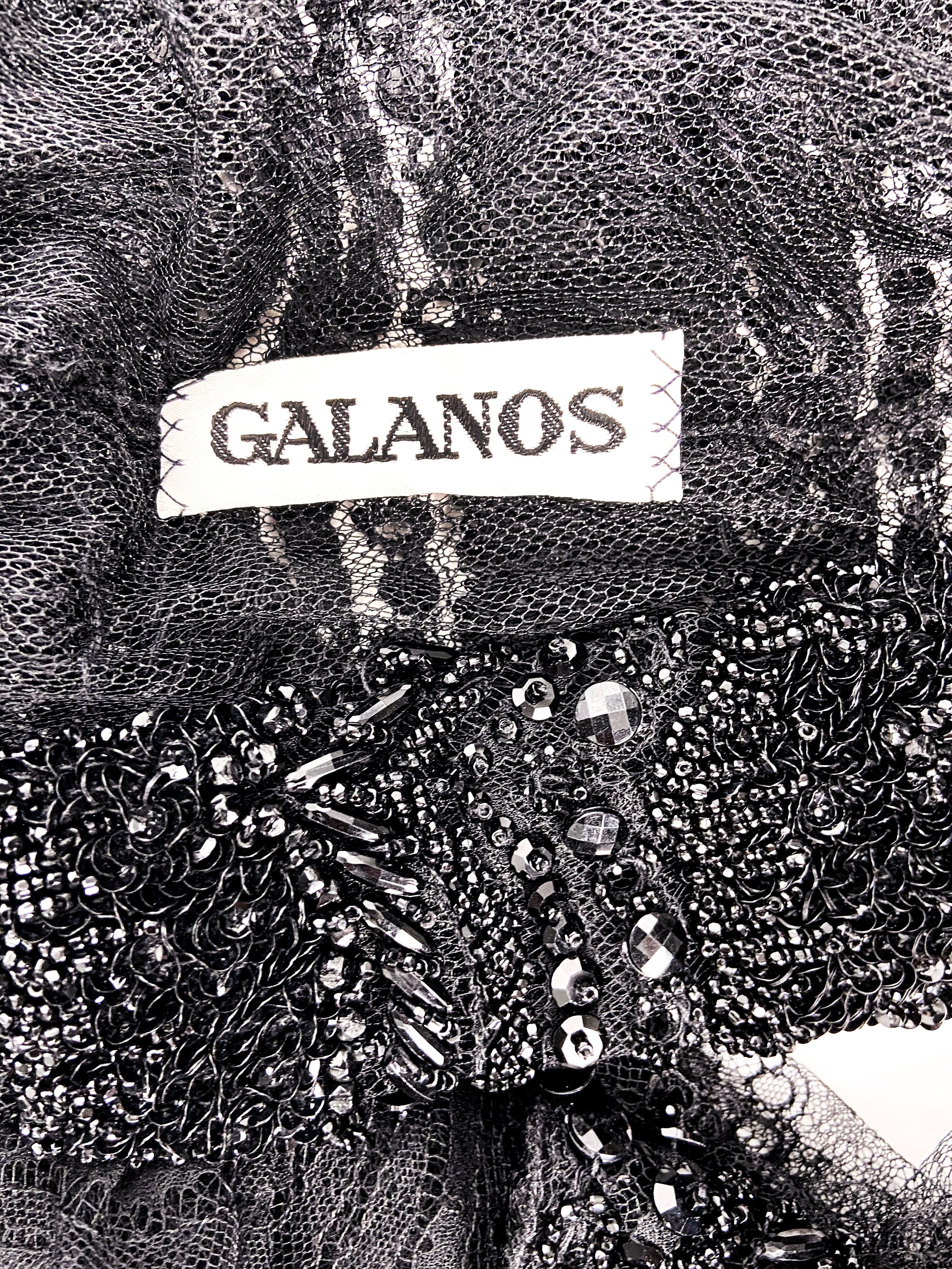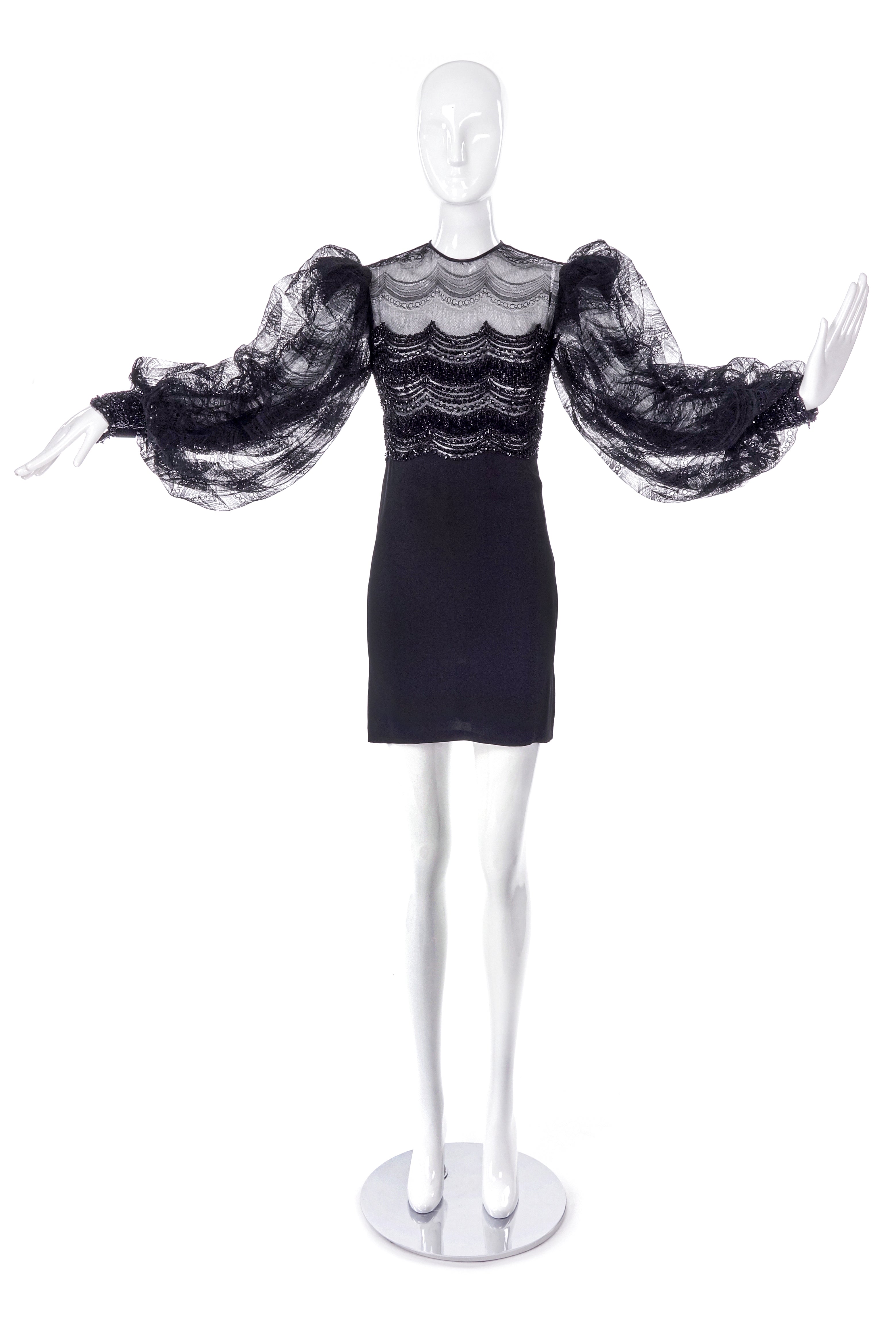 Galanos Black Evening Mini Dress with Lace Sleeves and Bead Details