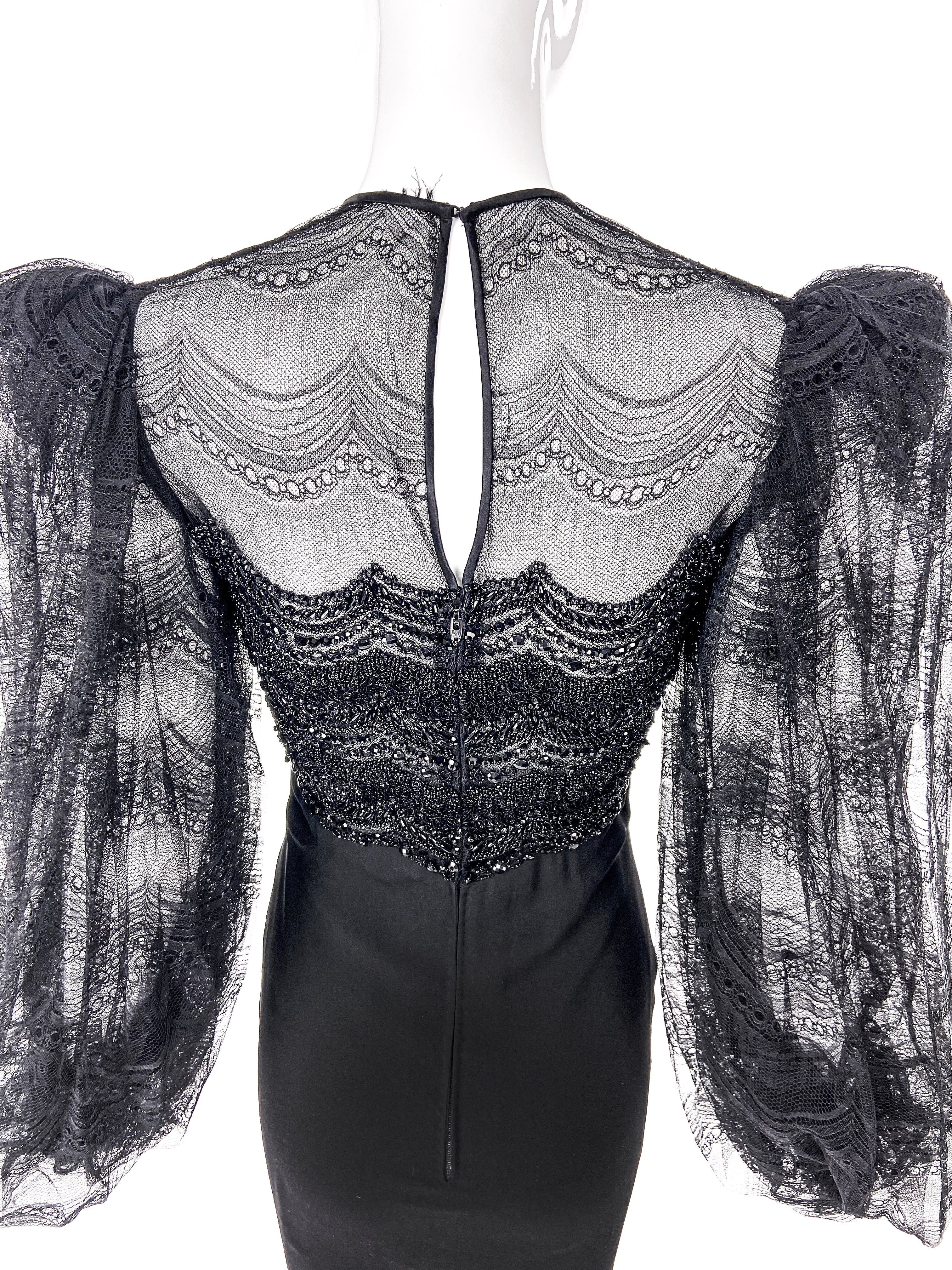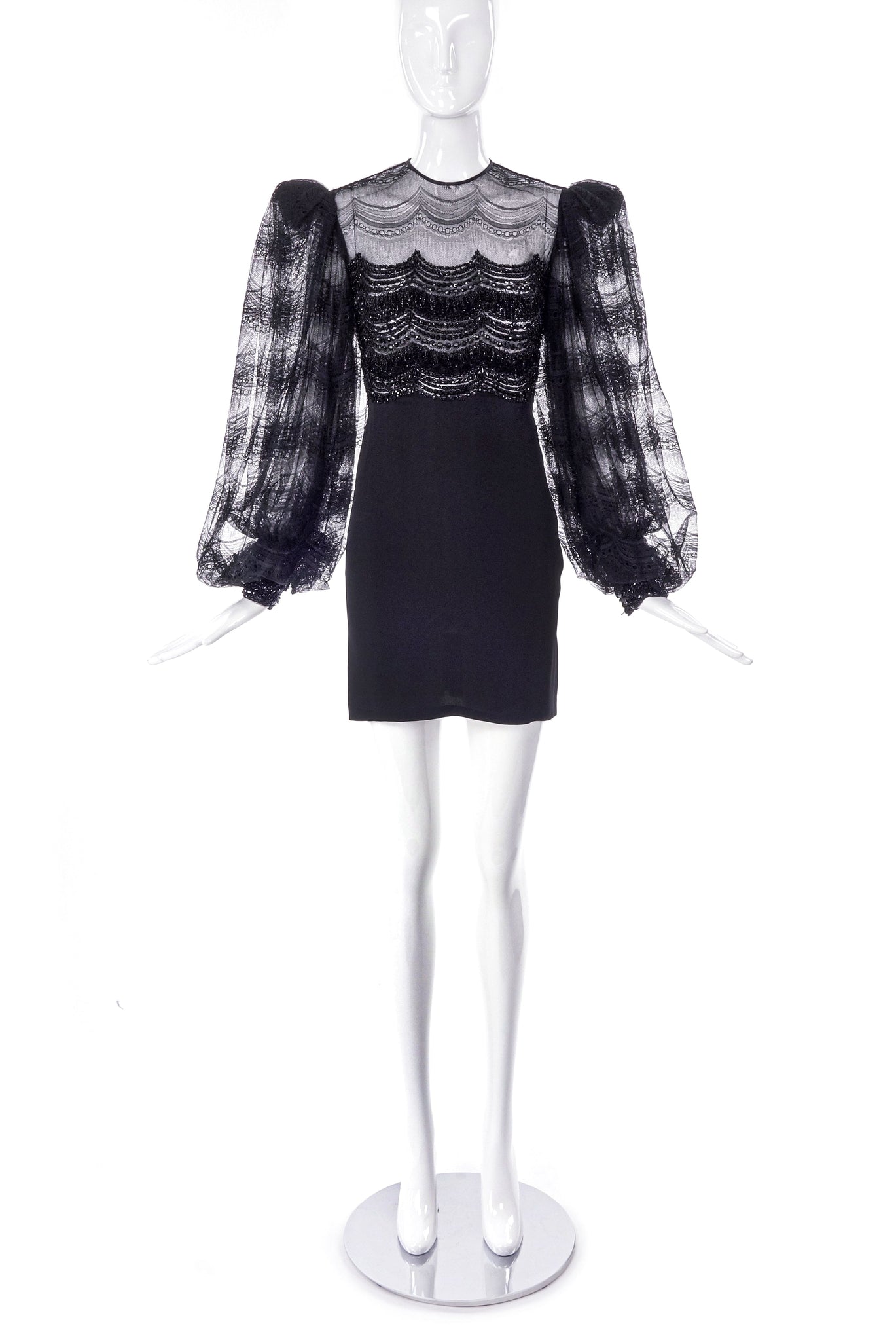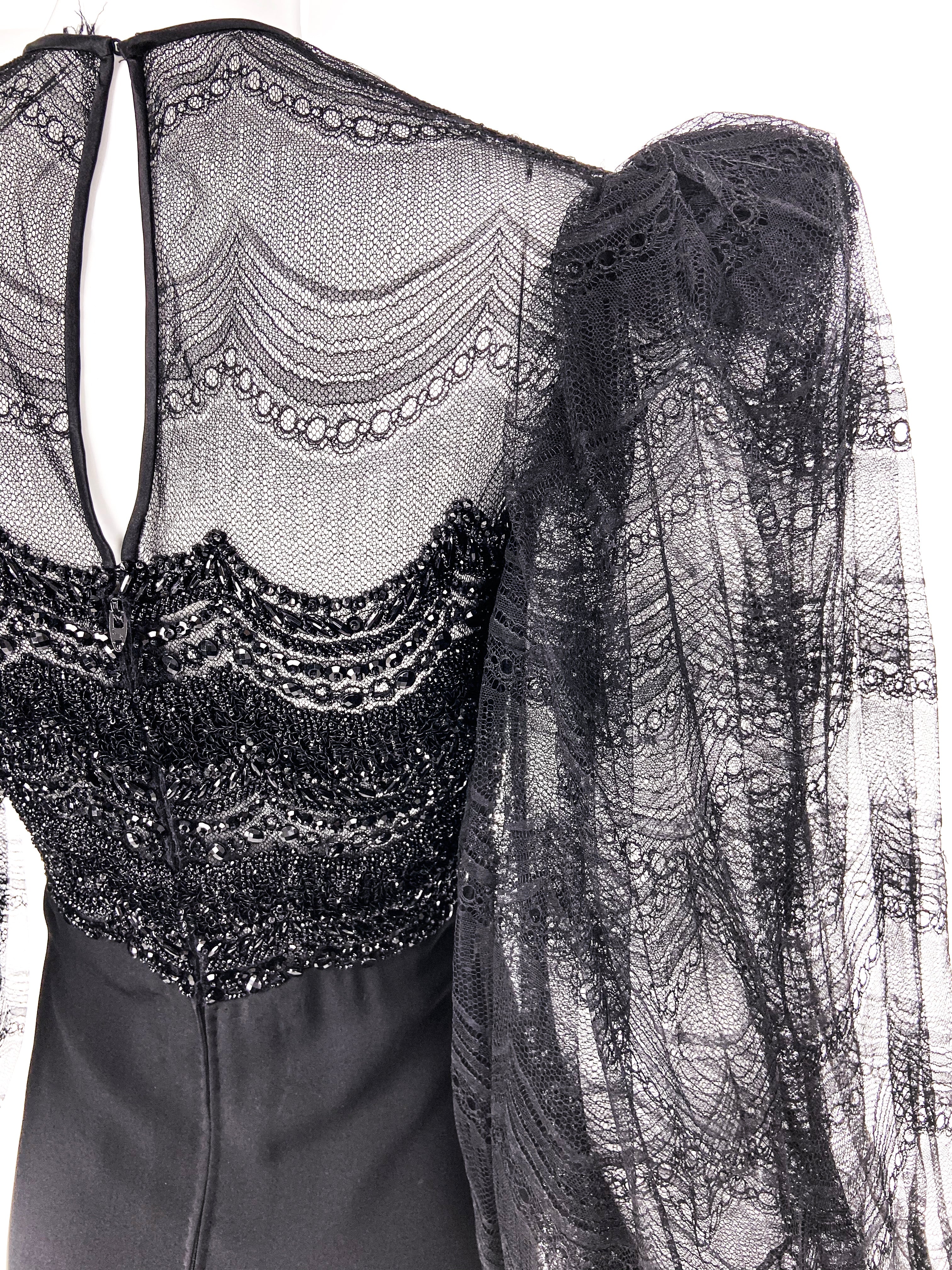 A stunning James Galanos evening mini dress with glamorous black lace balloon sleeves. Along the lace bodice of the dress is jet black beads creating a corset-like illusion.