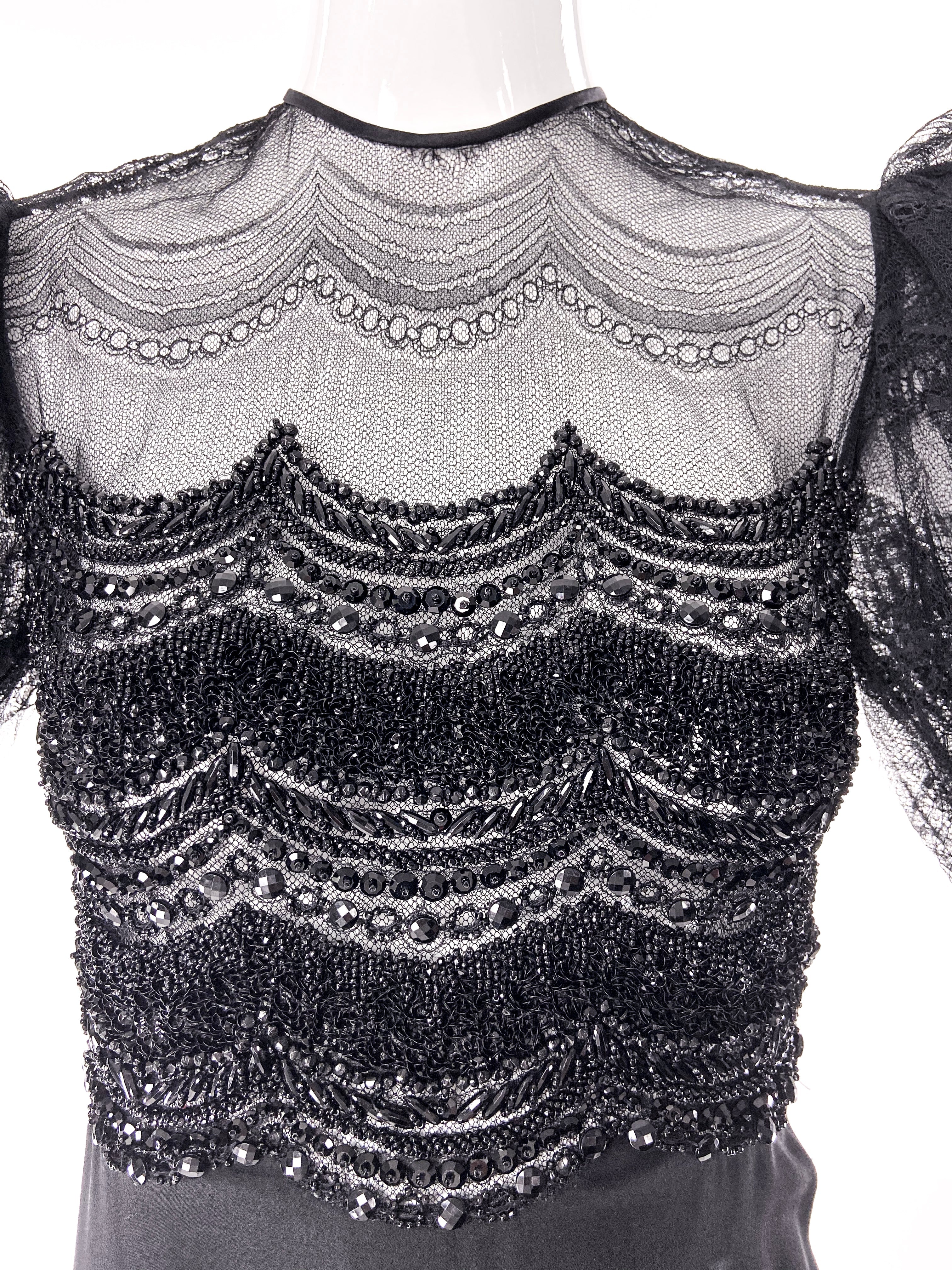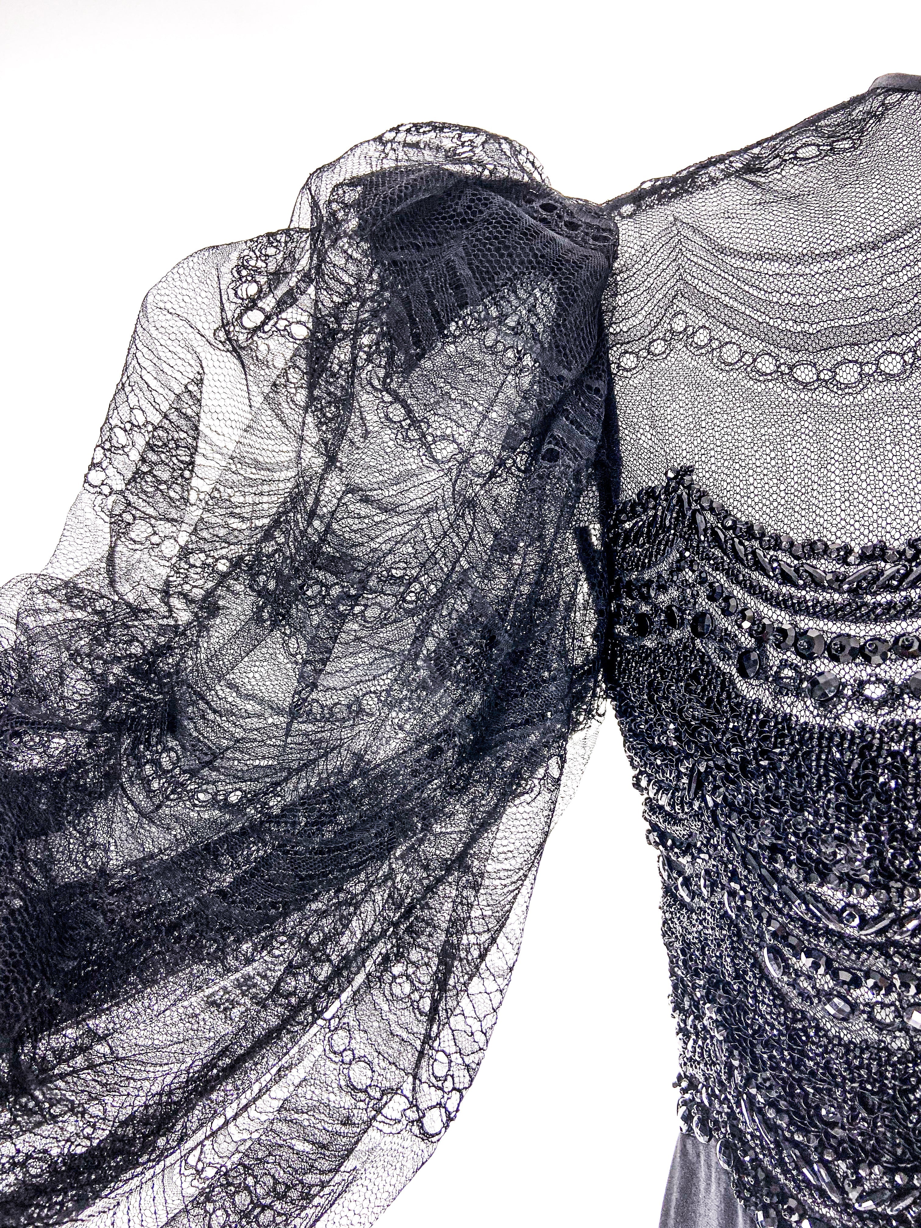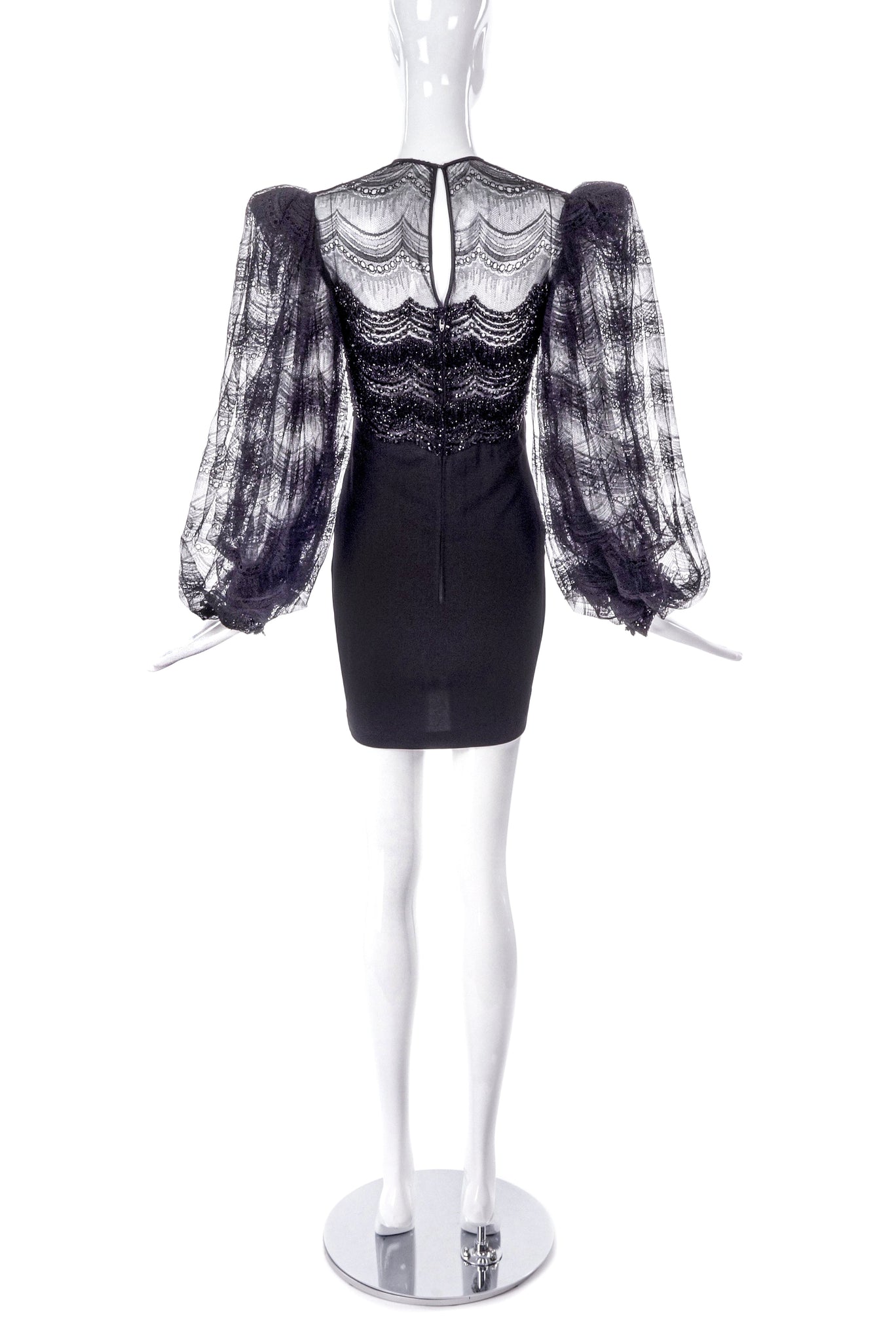 A stunning James Galanos evening mini dress with glamorous black lace balloon sleeves. Along the lace bodice of the dress is jet black beads creating a corset-like illusion.
