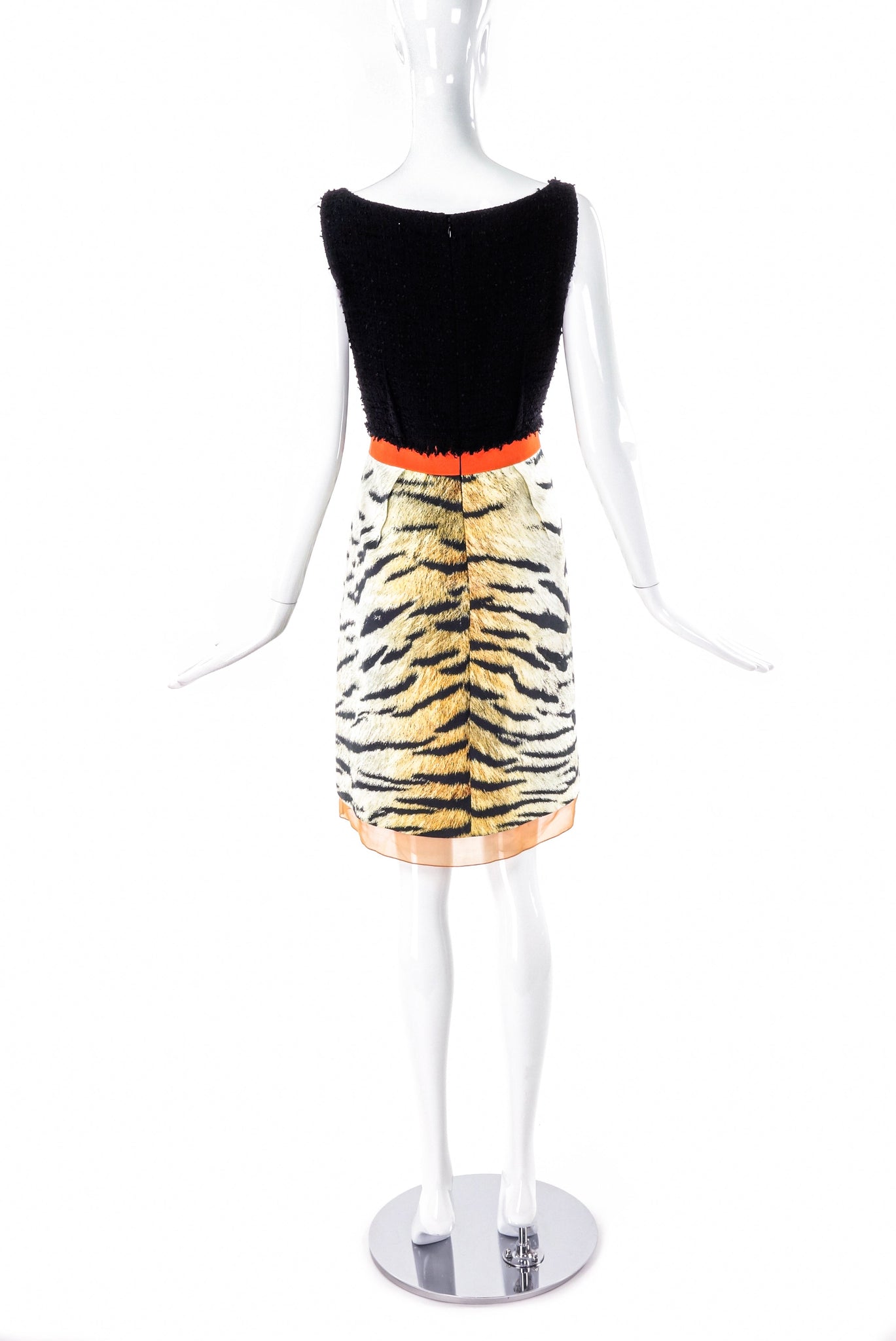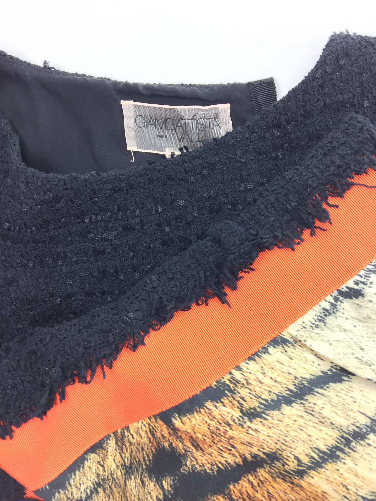 A Giambattista Valli black boucle and tiger printed dress with orange chiffon detailing peeking out from underneath the skirt. The dress has an electric orange belt detail at the waist that gives the dress an hourglass style shape.