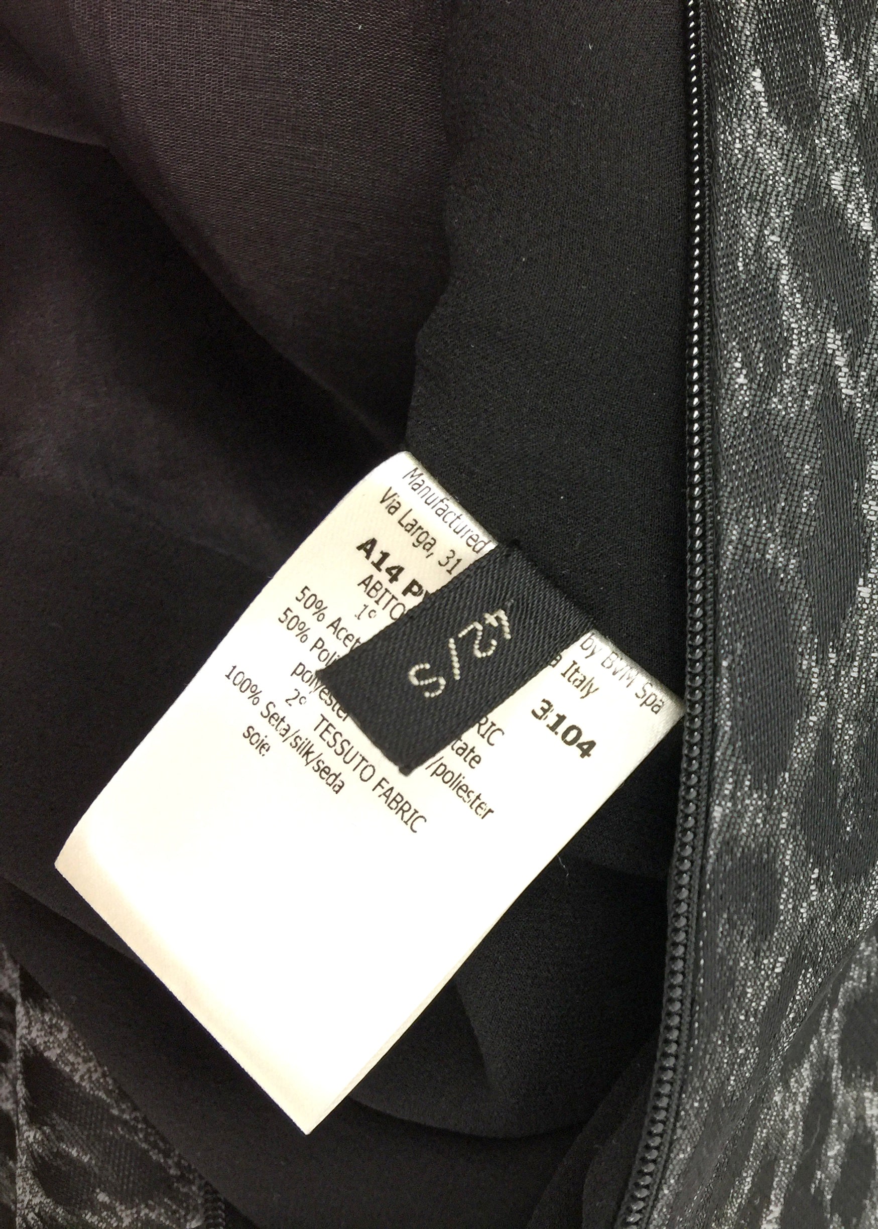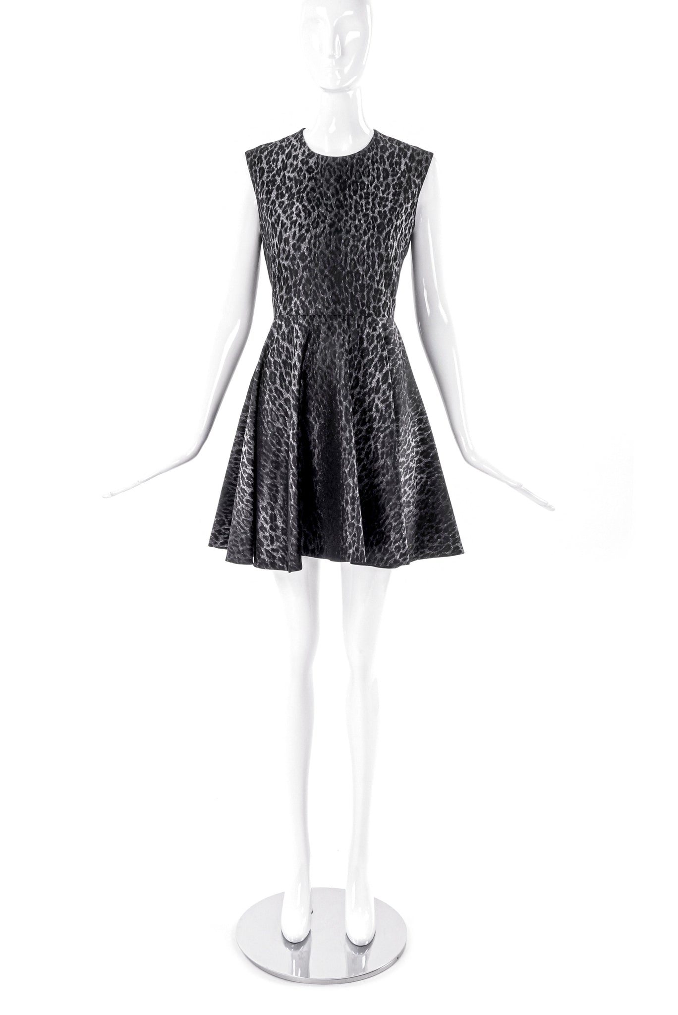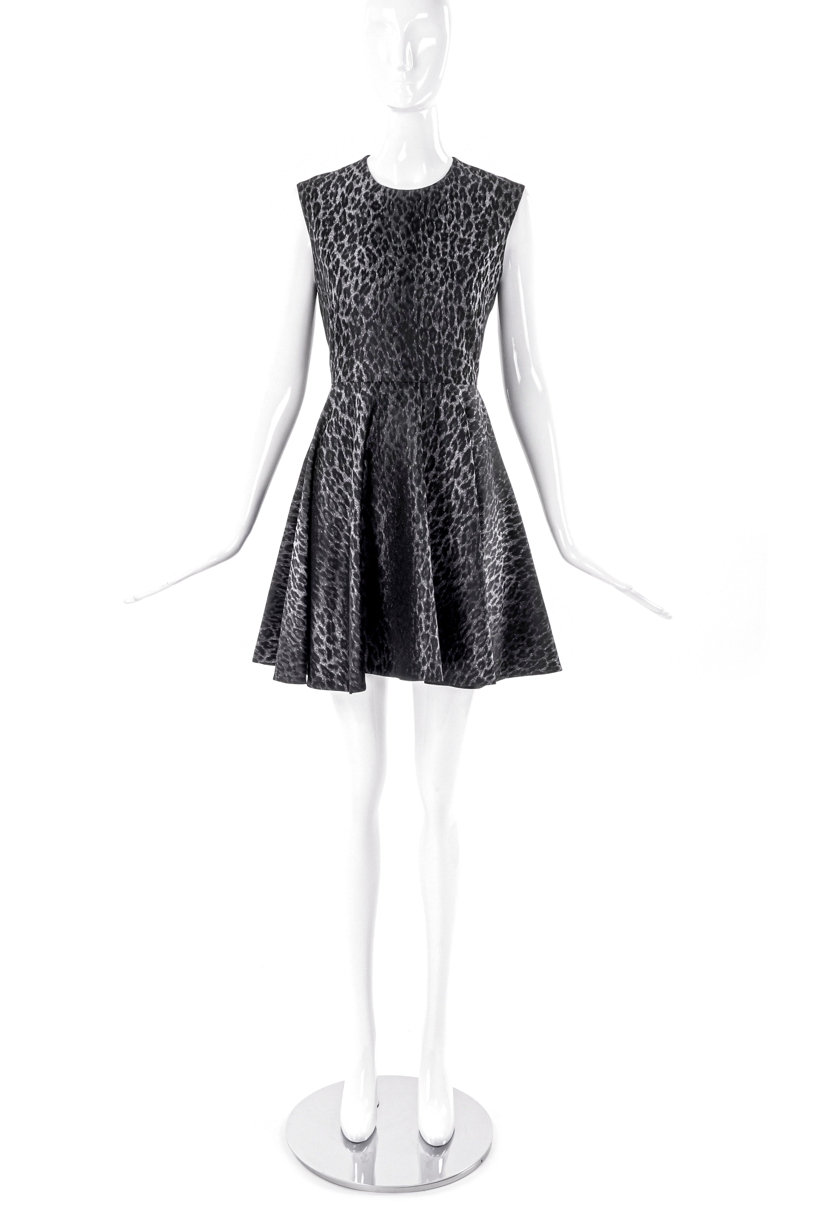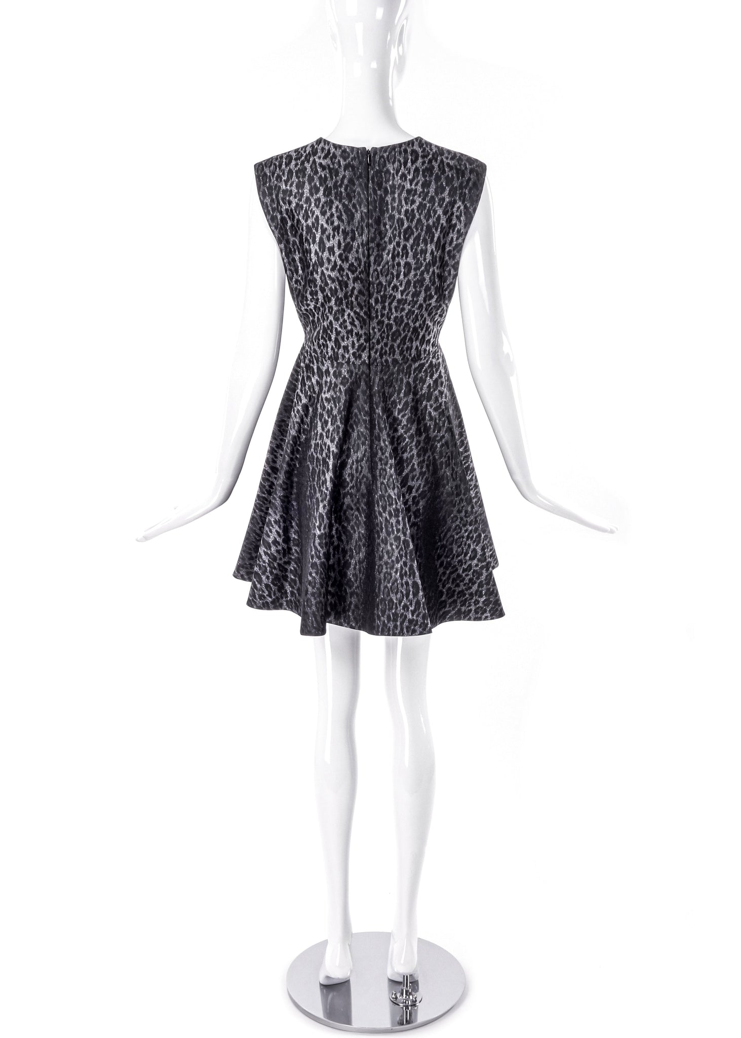 A Giambattista Valli sleeveless fit and flare dress with pleating detailing along the waist line to give the skirt a slight "New Look" volume. The dress has a greyscale and black leopard print pattern. The dress has an invisible zipper along the back of the dress from the neckline to the waist.
