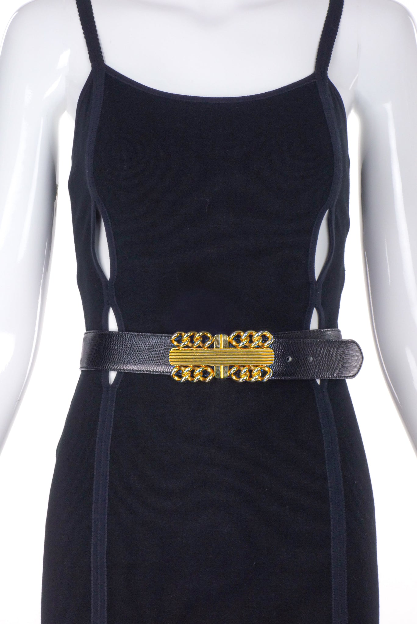 A vintage Gianni Versace black lizard skin belt with an ornate rectangular gold buckle with curb chain details. The belt has multiple puncture holes for fit and snaps into the holes over the top. The belt is marked a 70cm and is stamped in gold Gianni Versace Made in Italy.