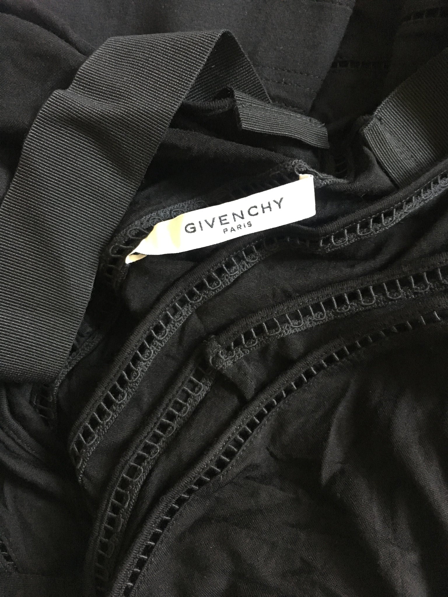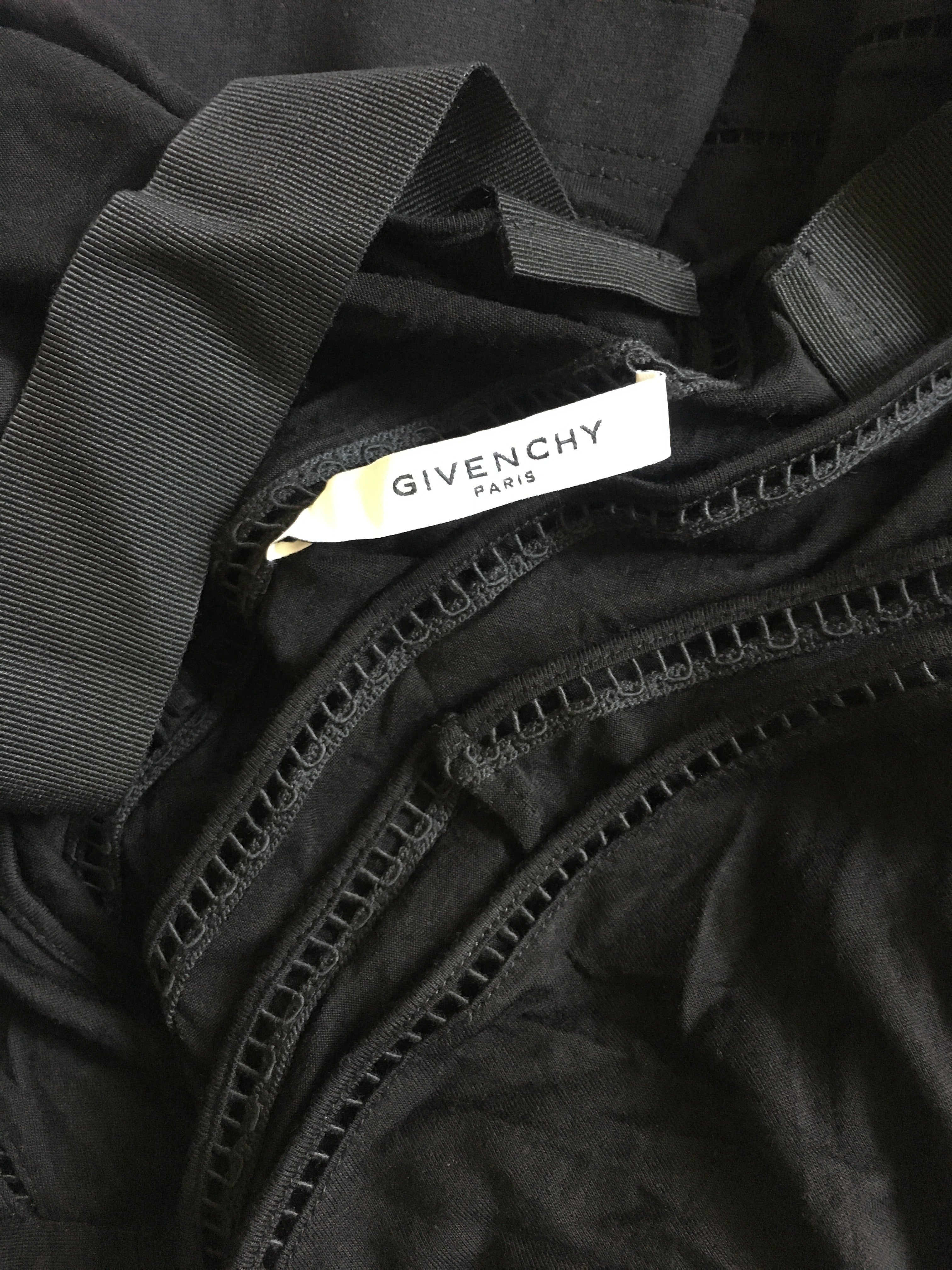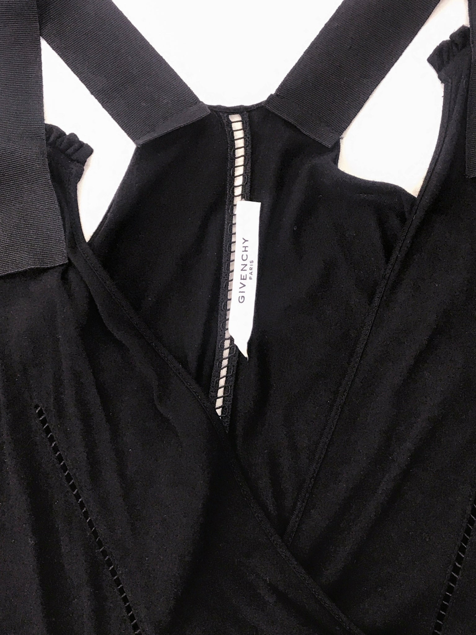 Givenchy black cotton shoulder cut out dress - wide ribbon shoulder straps. Swiss dot hole pattern throughout the dress.