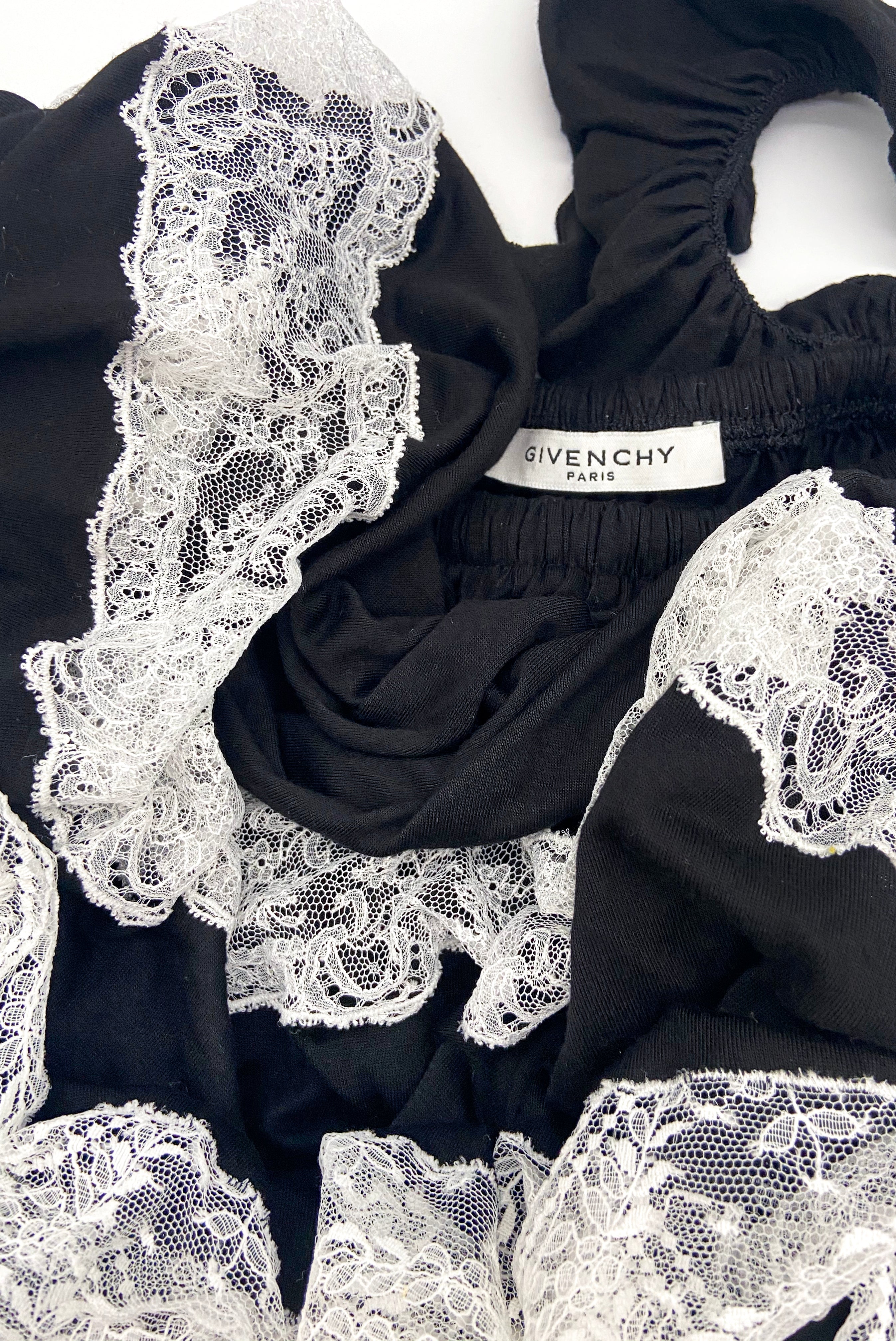 A Givenchy by Ricardo Tisci black cotton skirt with two tiers of delicate lace ruffles. The dress has a drawstring detail at the front of the skirt which creates an angled draped black cotton ruffle tier at the hips. The lace tiers of the skirt are semi sheer to give a sexy feel to the knee length skirt. The skirt is adjustable with drawstring and has an elastic waistline.