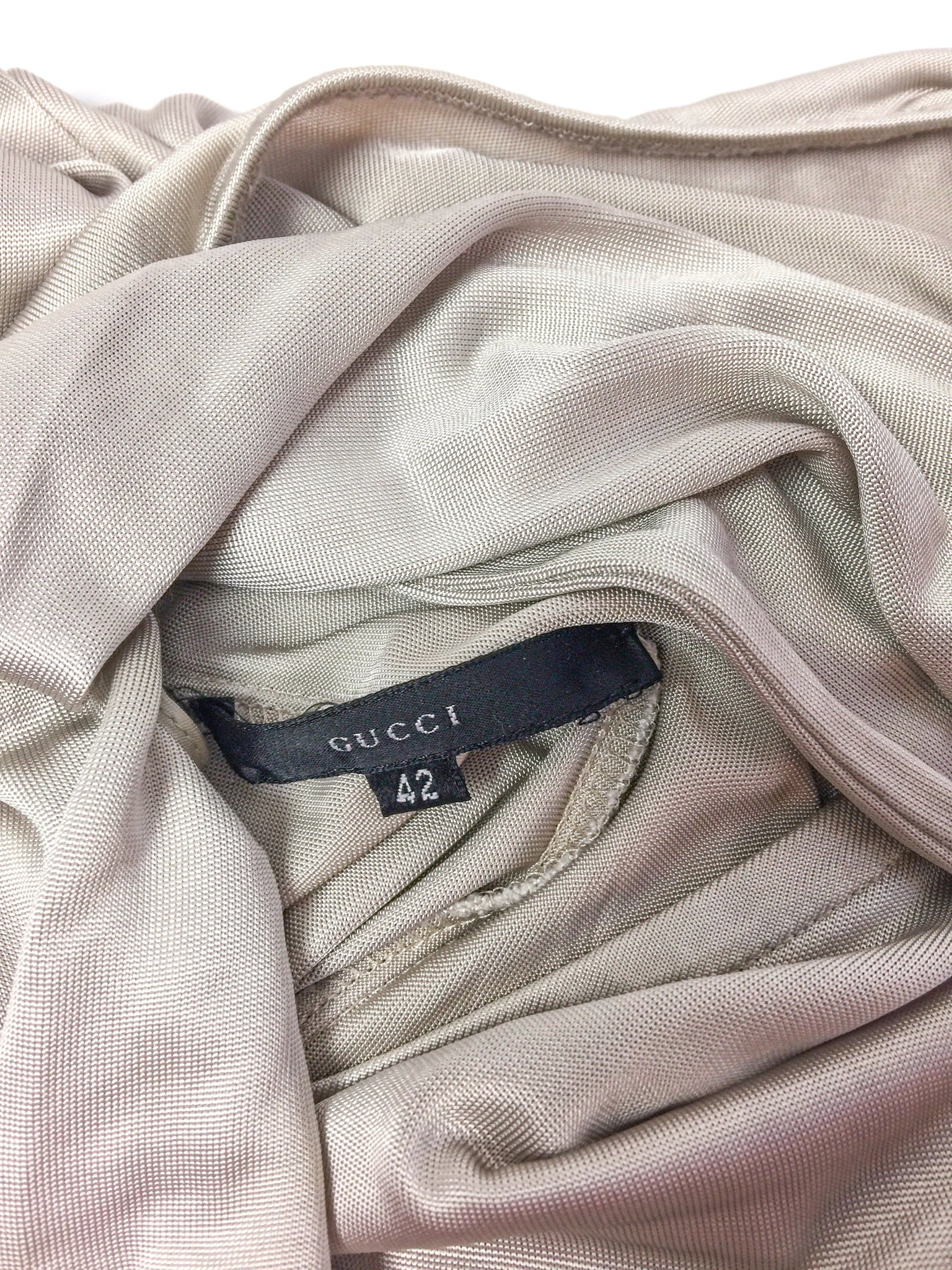 A Gucci by Tom Ford minimal nude illusion silk jersey dress in a golden beige with a one shoulder long sleeve. Circa 1990s.