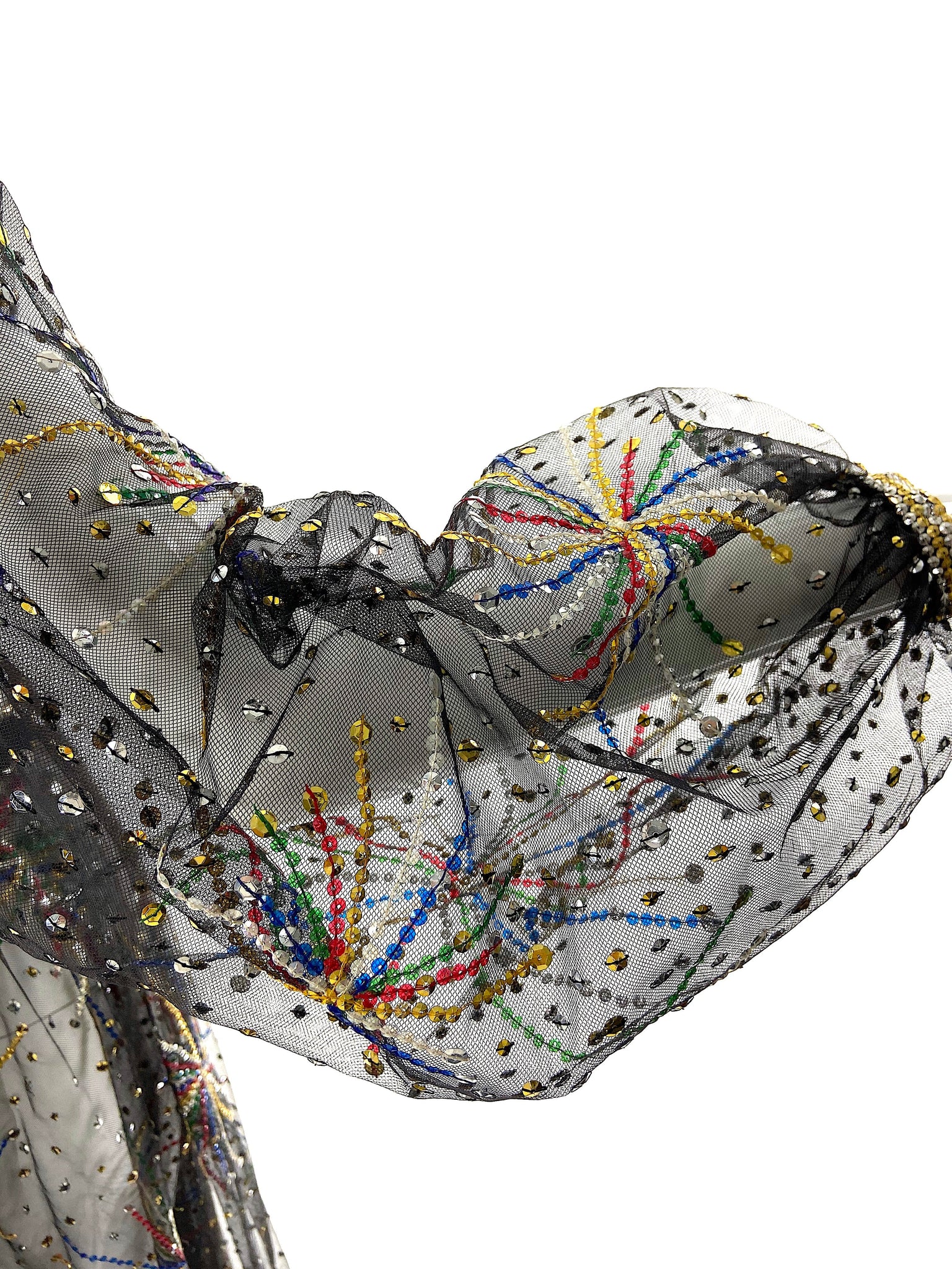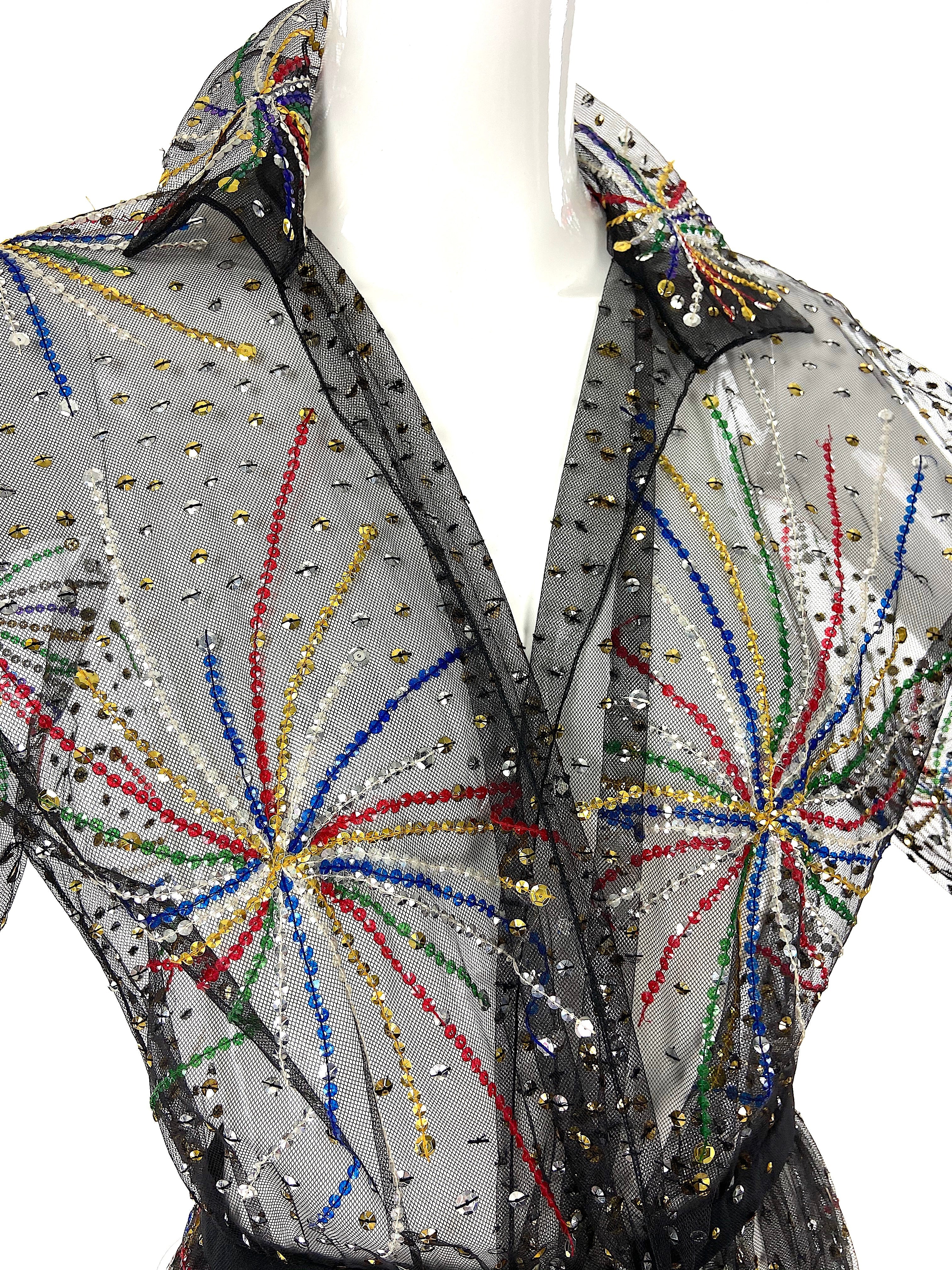 The iconic Halston beaded "Fireworks" dress made from ethereal black chiffon. The dress was only produced five times from the Fall / Winter 1980 runway presentation. This gown has elegant balloon sleeves and a tailored collar at the neckline. The dress has a snap closure to be closed as a wrap dress.