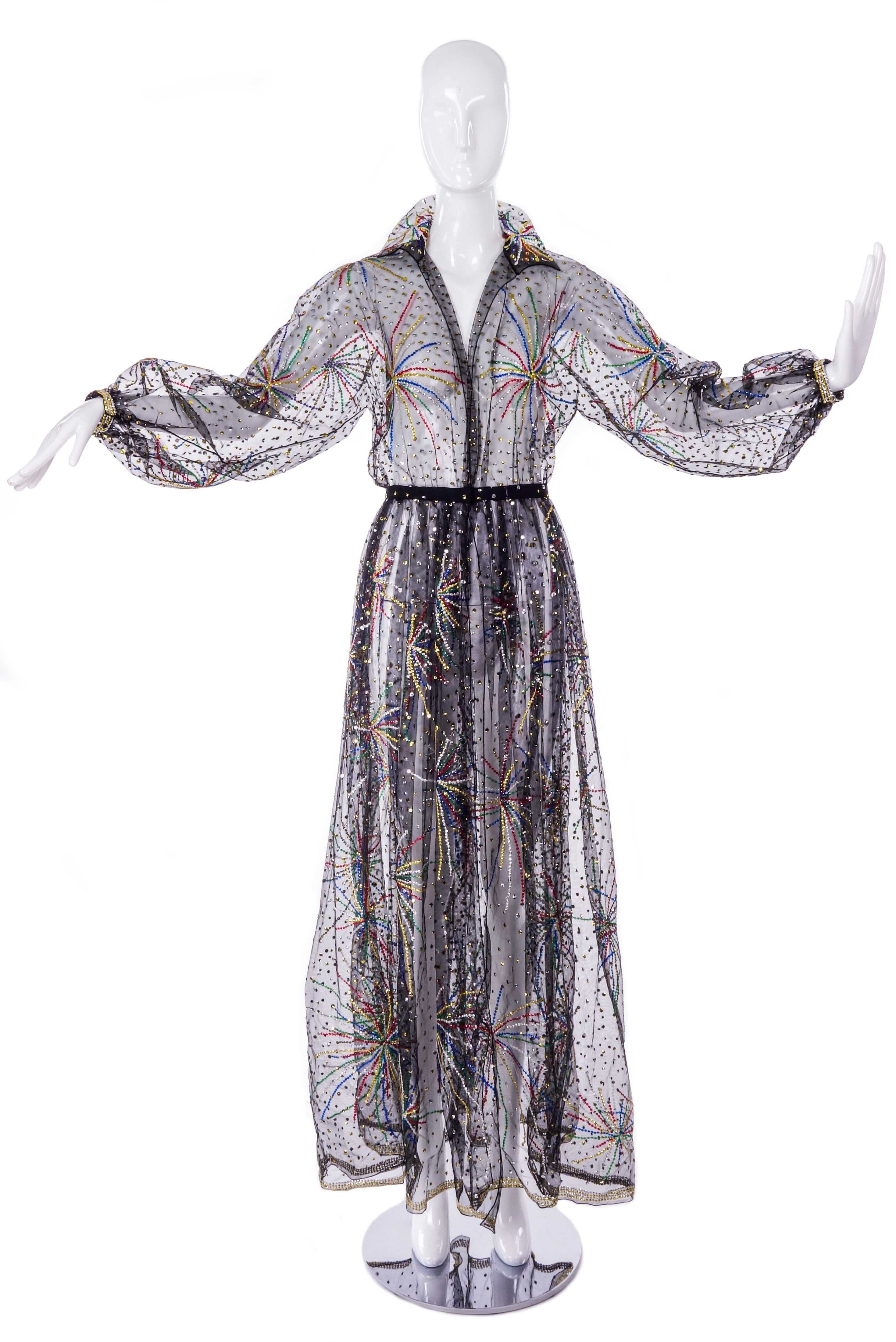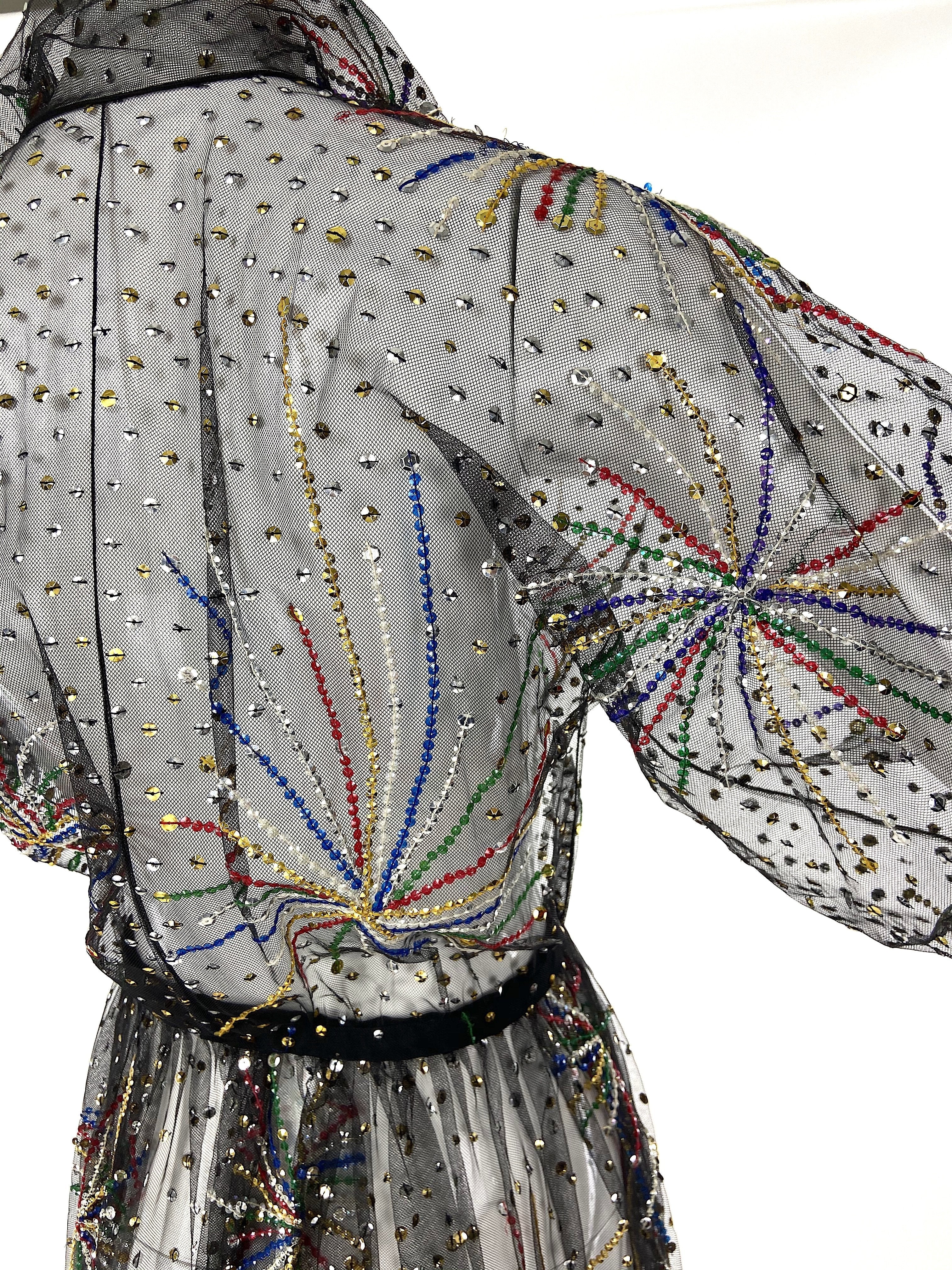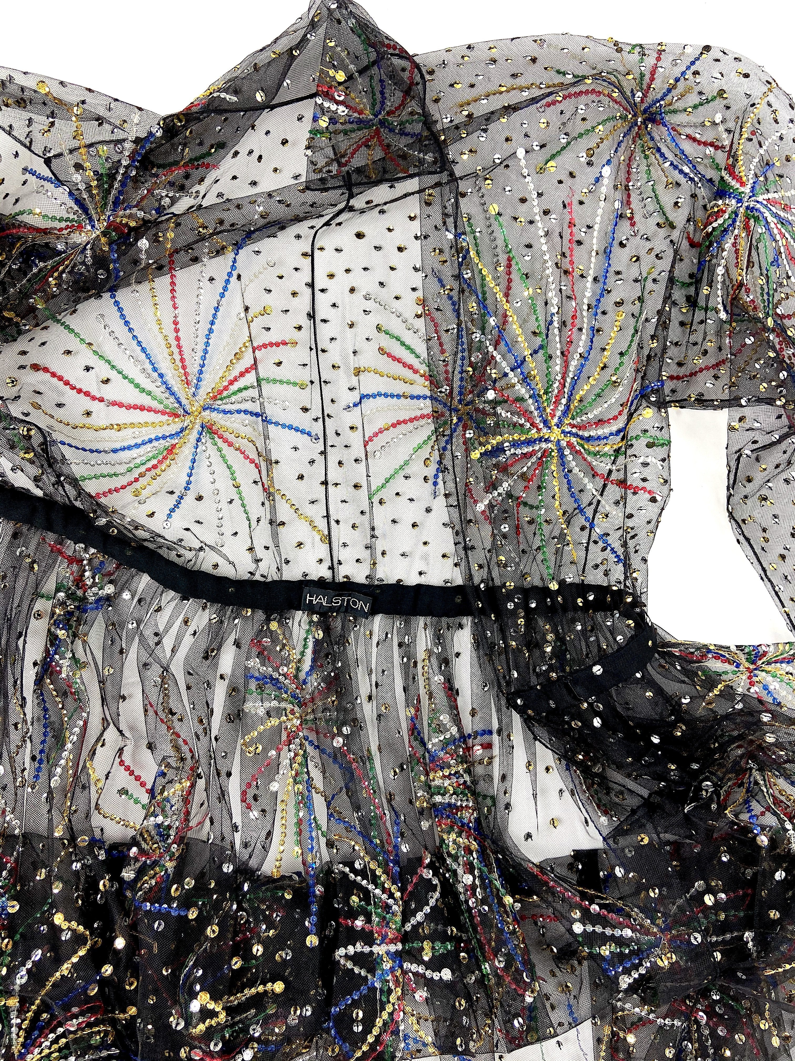 The iconic Halston beaded "Fireworks" dress made from ethereal black chiffon. The dress was only produced five times from the Fall / Winter 1980 runway presentation. This gown has elegant balloon sleeves and a tailored collar at the neckline. The dress has a snap closure to be closed as a wrap dress.