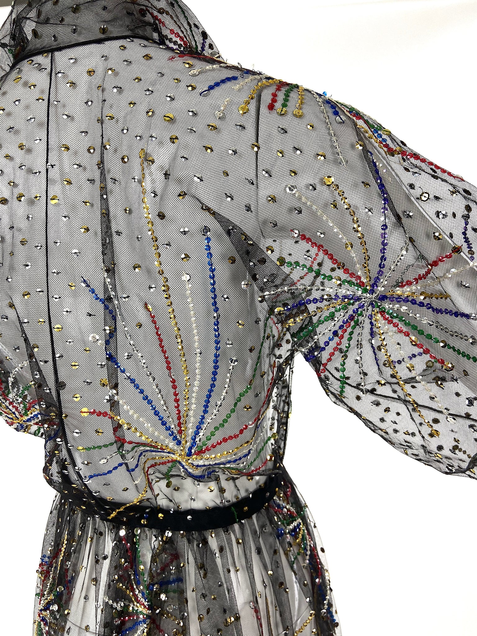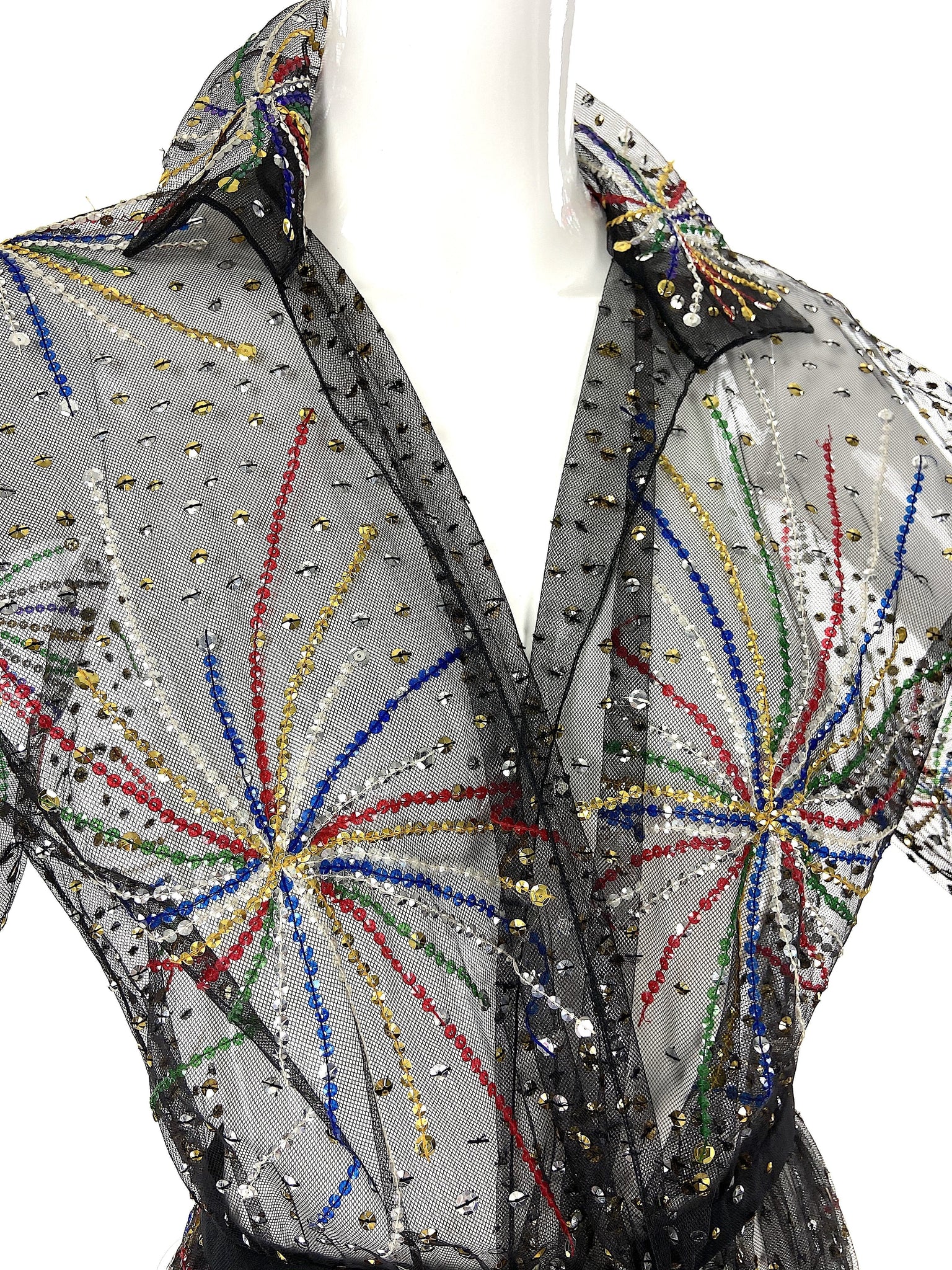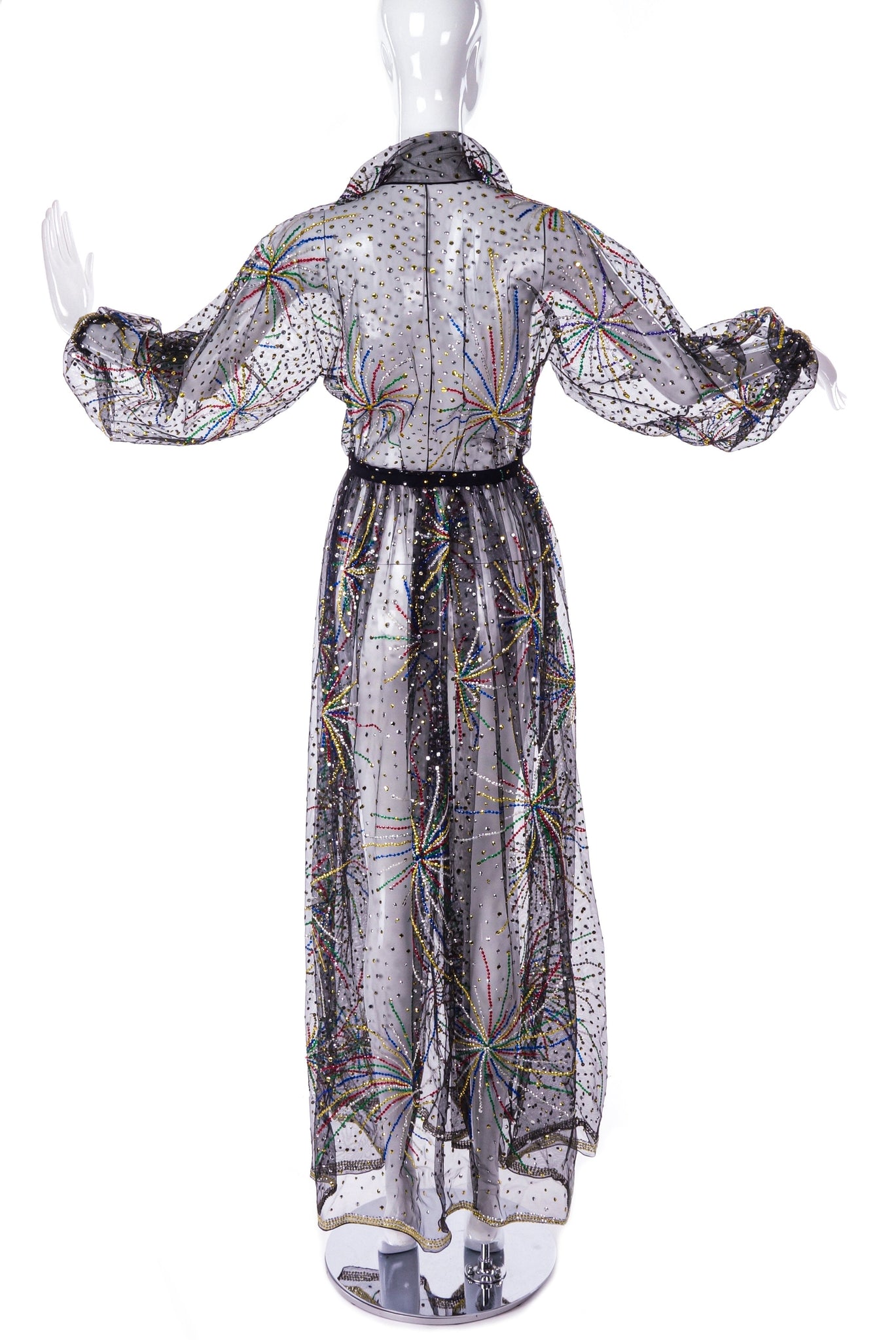 The iconic Halston beaded "Fireworks" dress made from ethereal black chiffon. The dress was only produced five times from the Fall / Winter 1980 runway presentation. This gown has elegant balloon sleeves and a tailored collar at the neckline. The dress has a snap closure to be closed as a wrap dress.