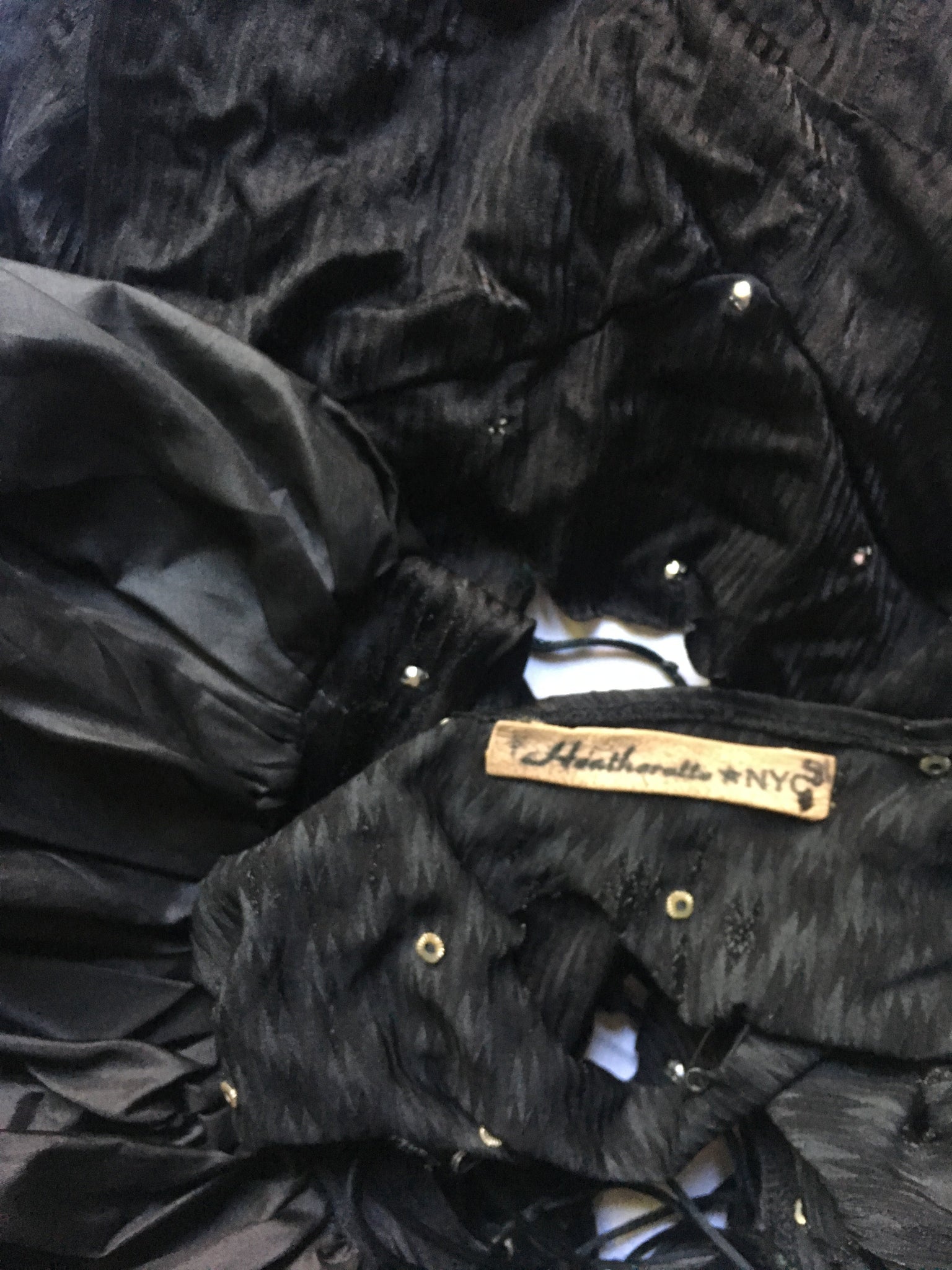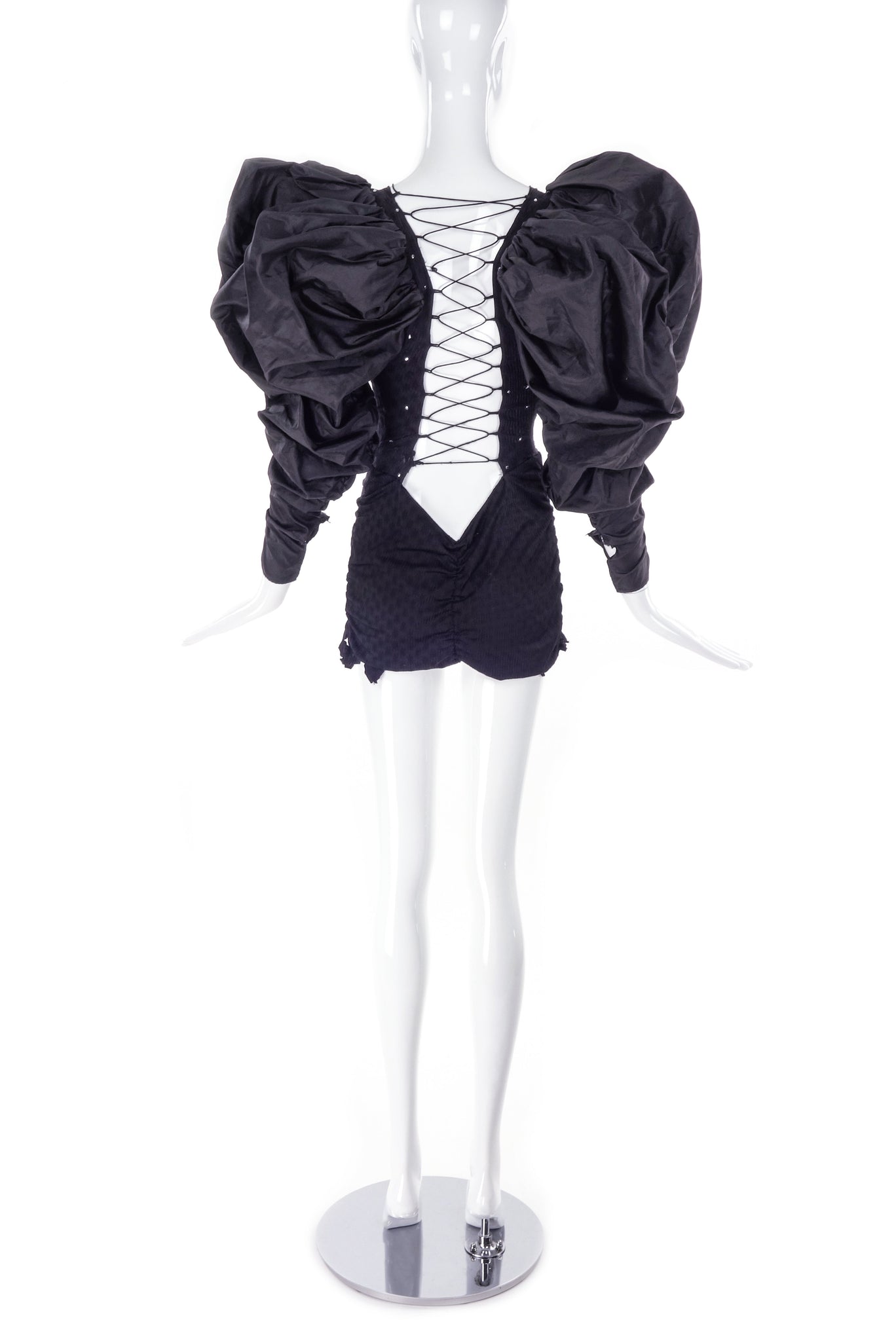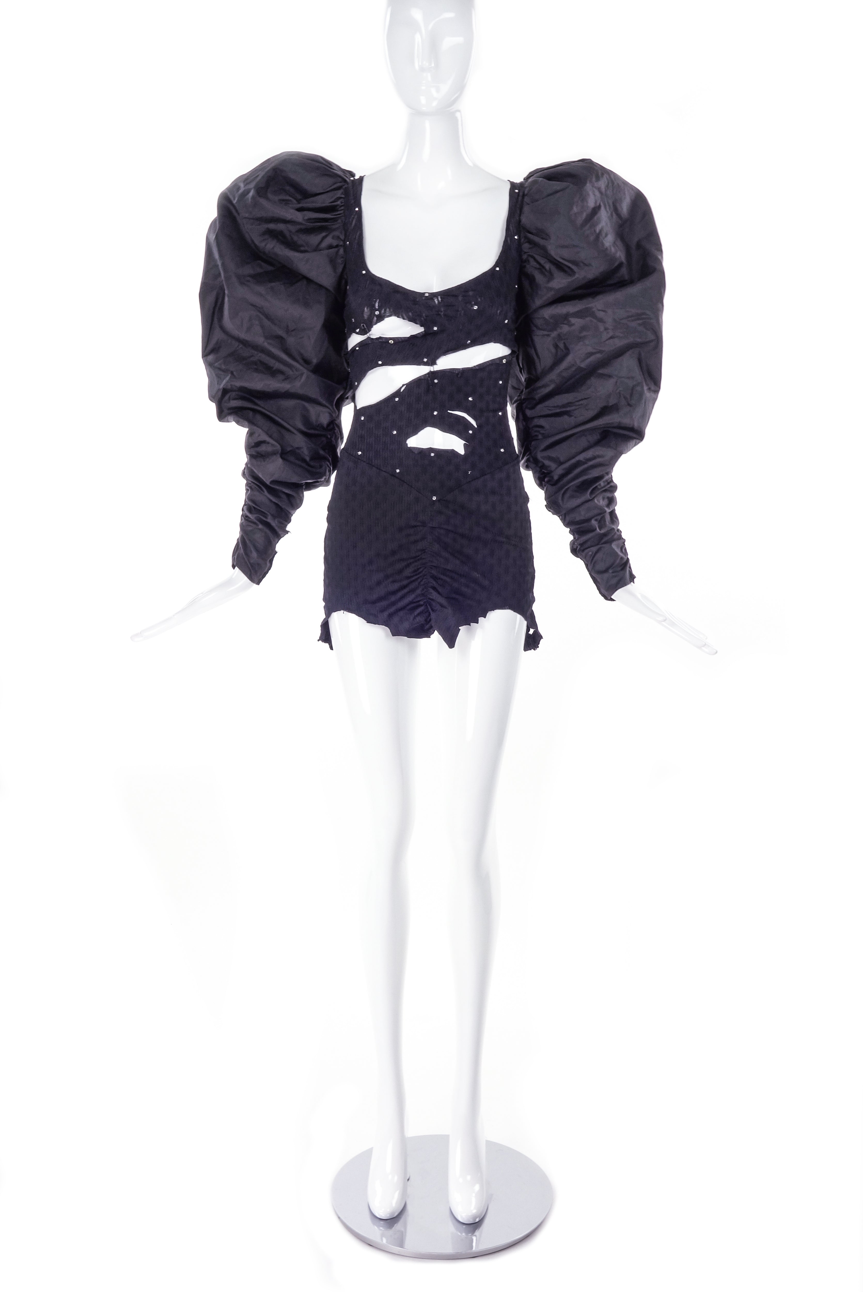 From the 2001 Heatherette Debut collection - a black puff sleeve stretch dress with rhinestone embellishments. The dress has slashes all over the front, a plunging back with lacing all the way up.