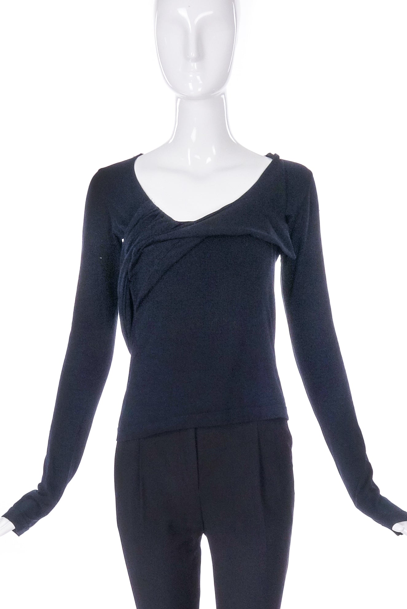 A Helmut Lang long sleeved black t-shirt with a drape wrap that begins at the neckline and wraps around the torso.