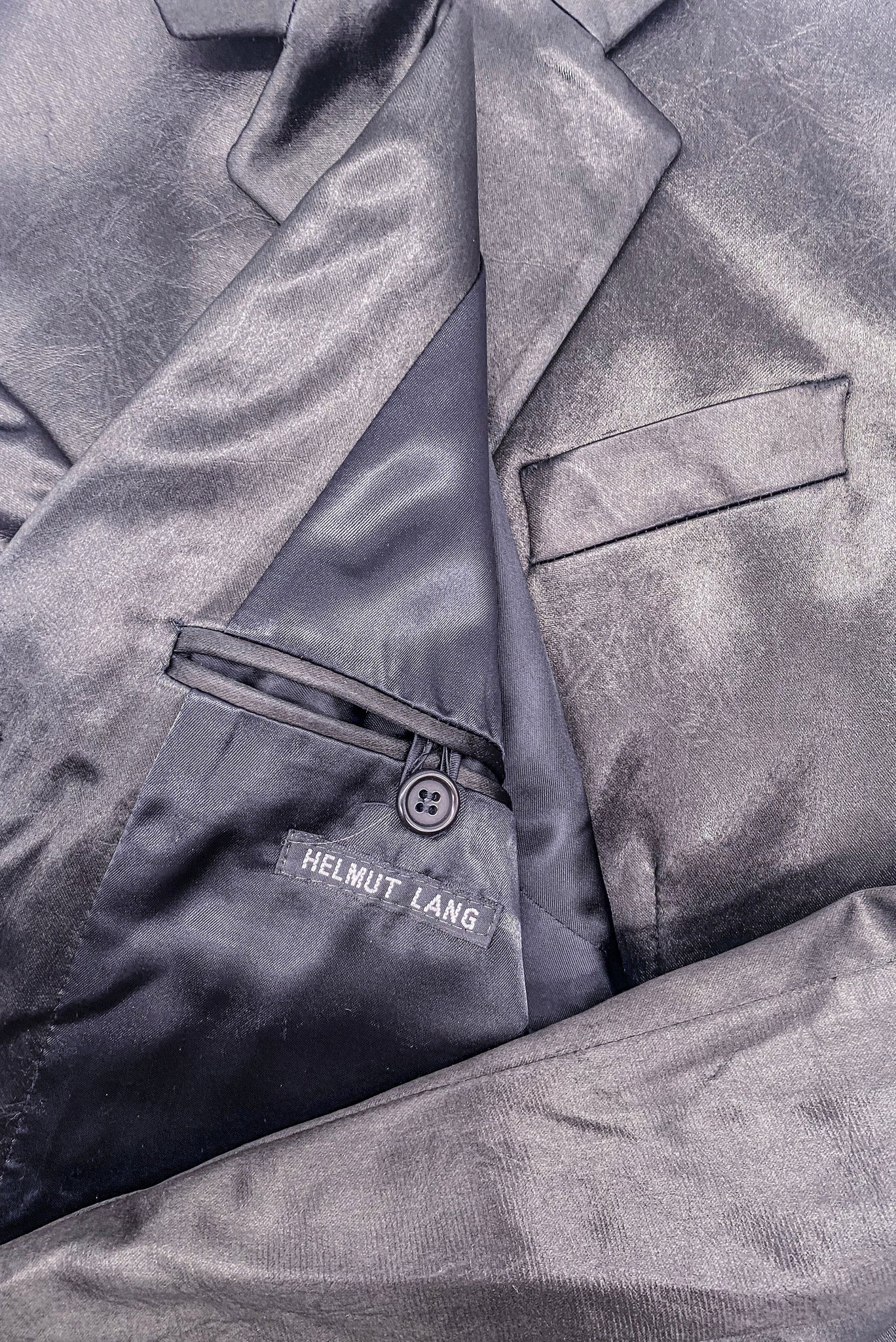 A Vintage Helmut Lang black "leather" textured satin, single breasted blazer with a notched lapel. The blazer has three button closures down the front with two flap pockets on each side of the front of the jacket. The black satin has a leather-leather like texture and is a thick satin created in the 1990s.