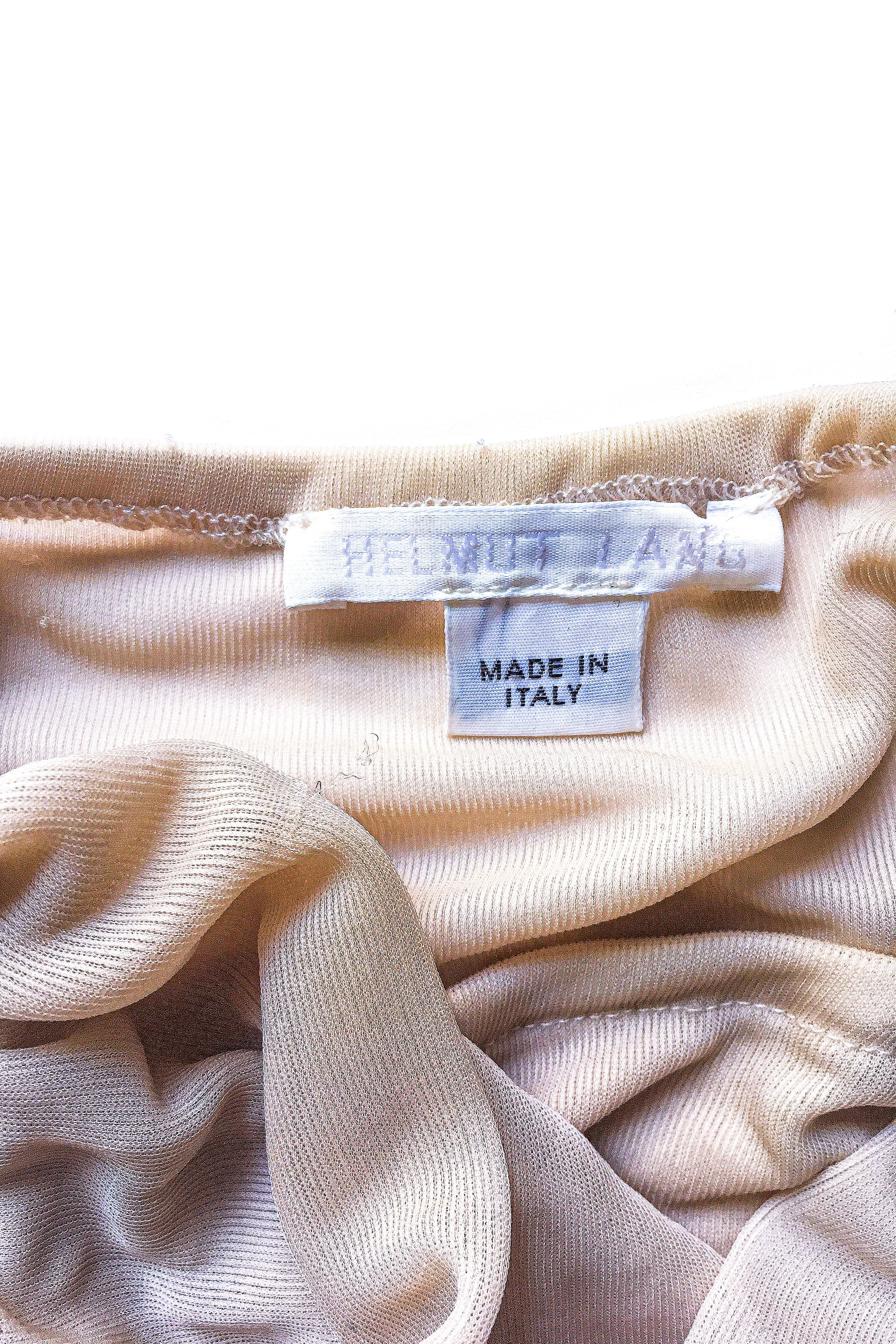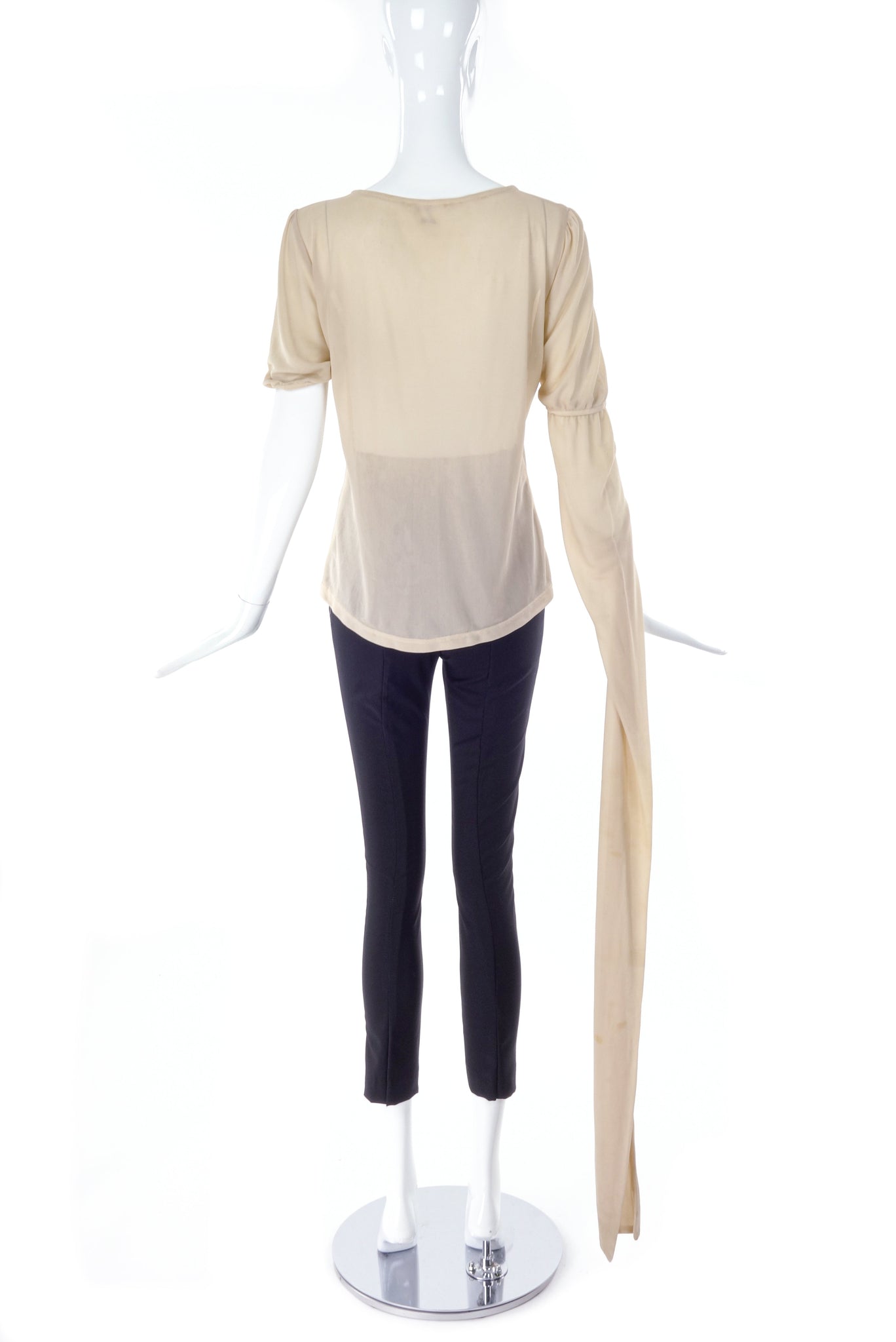 A Helmut Lang golden beige knit top with one elongated "elephant" sleeve. The fabric of the shirt has a slight sheerness to the fabric. From the Helmut Lang Fall / Winter 1998 runway collection.