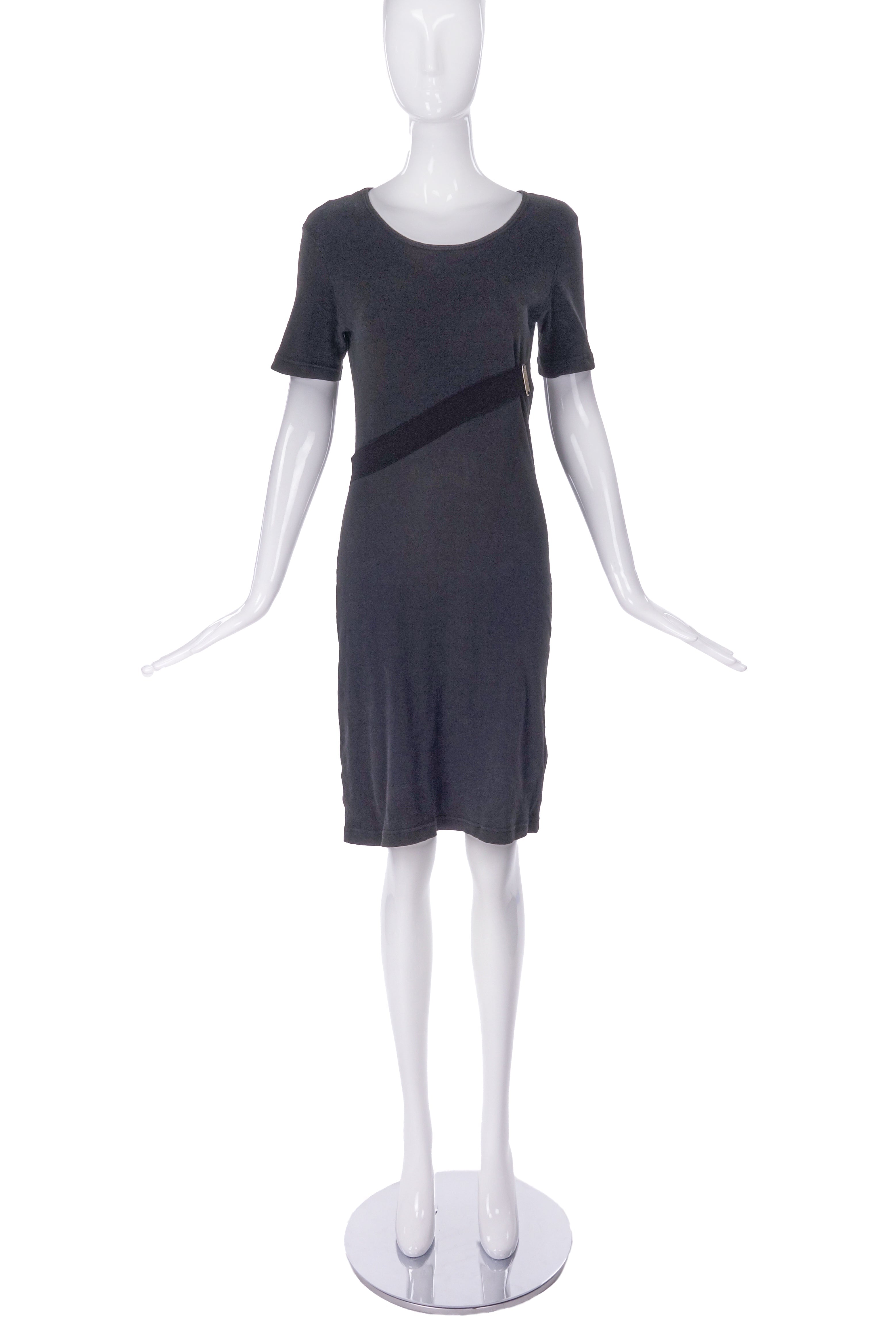 A Helmut Lang grey cotton t-shirt dress with a webbed harness under the bust. The harness has a weathered metal plate under the right arm and it is stamped Helmut Lang. The webbed belt wraps around the body to create an asymmetrical loose empire waist. Circa 1997 - 1998.