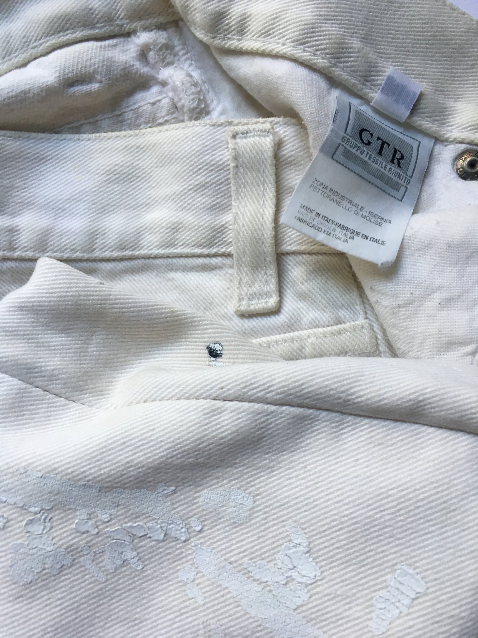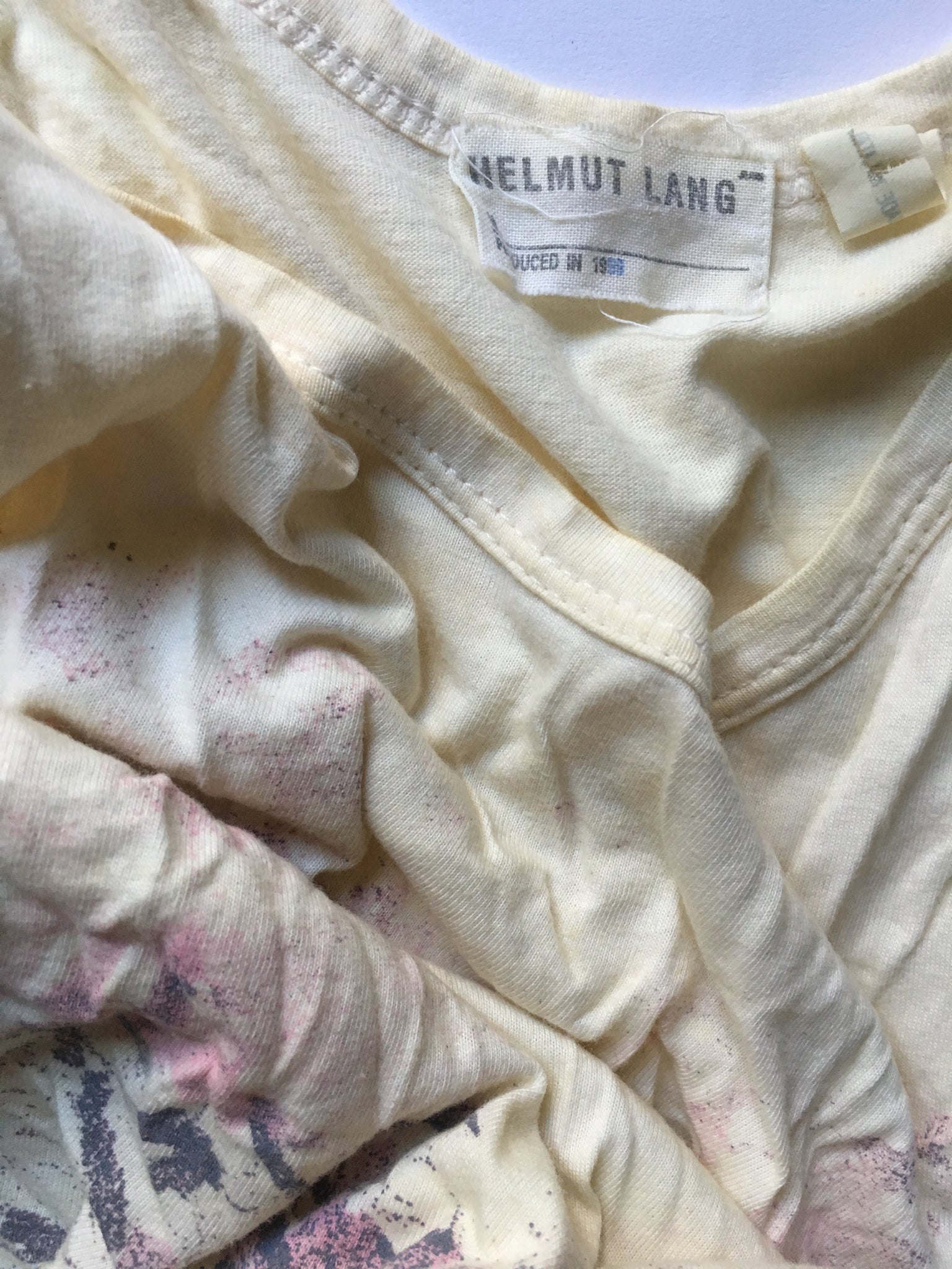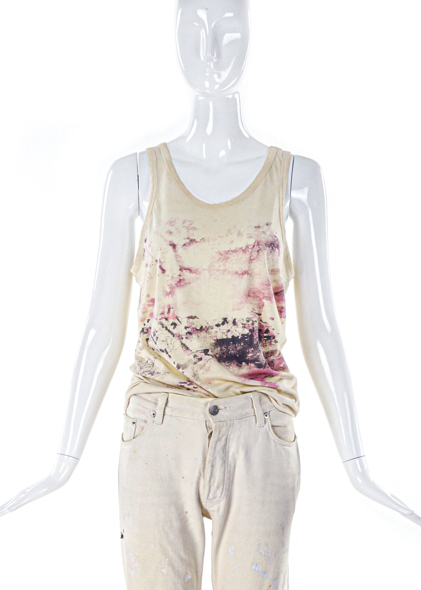 A set of Helmut Lang pieces from the Spring / Summer 1998 Collection. The ivory tank top and trouser have the iconic paint splatter associated with the famous collection.