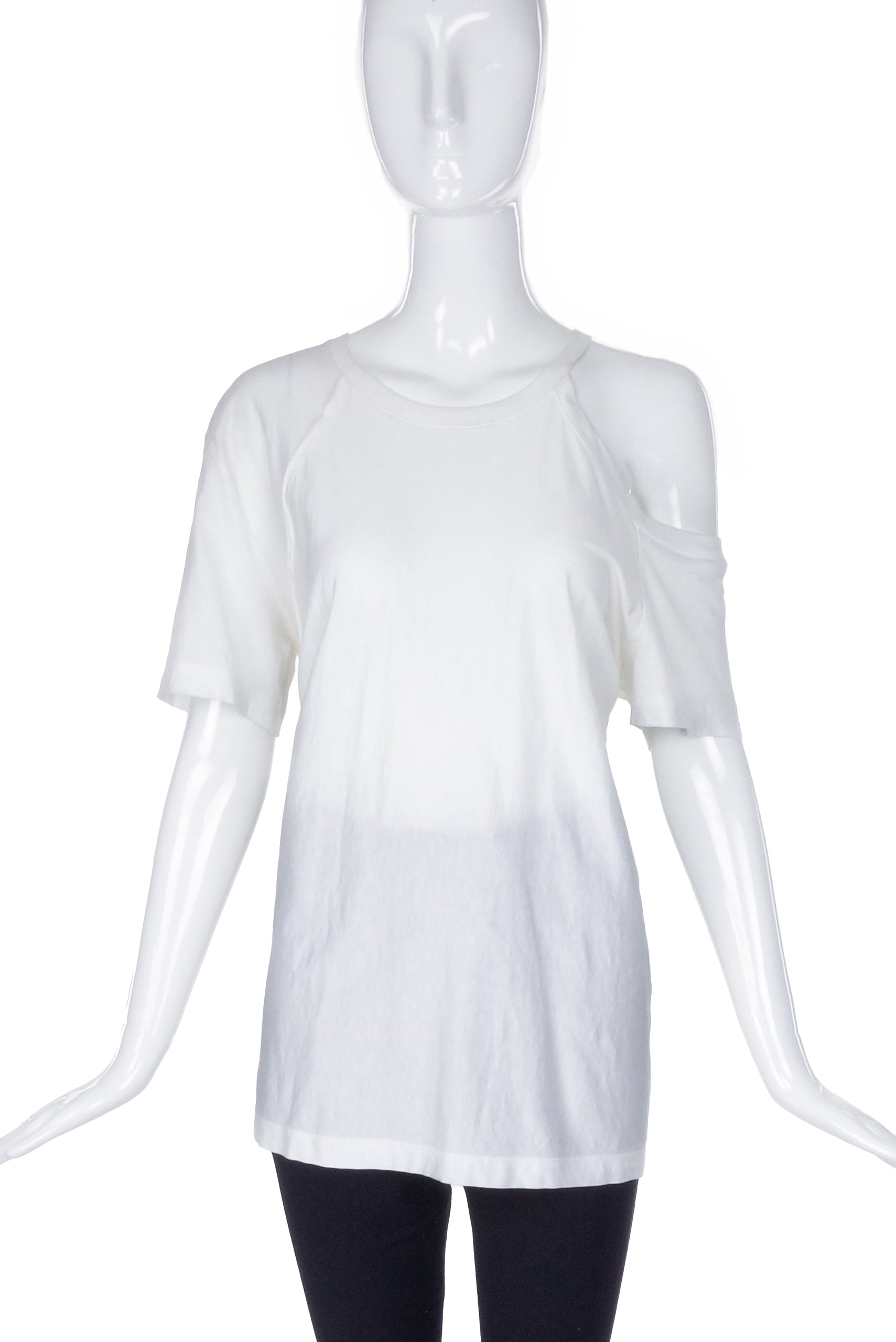 A Helmut Lang white cotton crew neck t-shirt. The t-shirt has a "cold shoulder" cut-out detail on the left shoulder that exposes the shoulder.