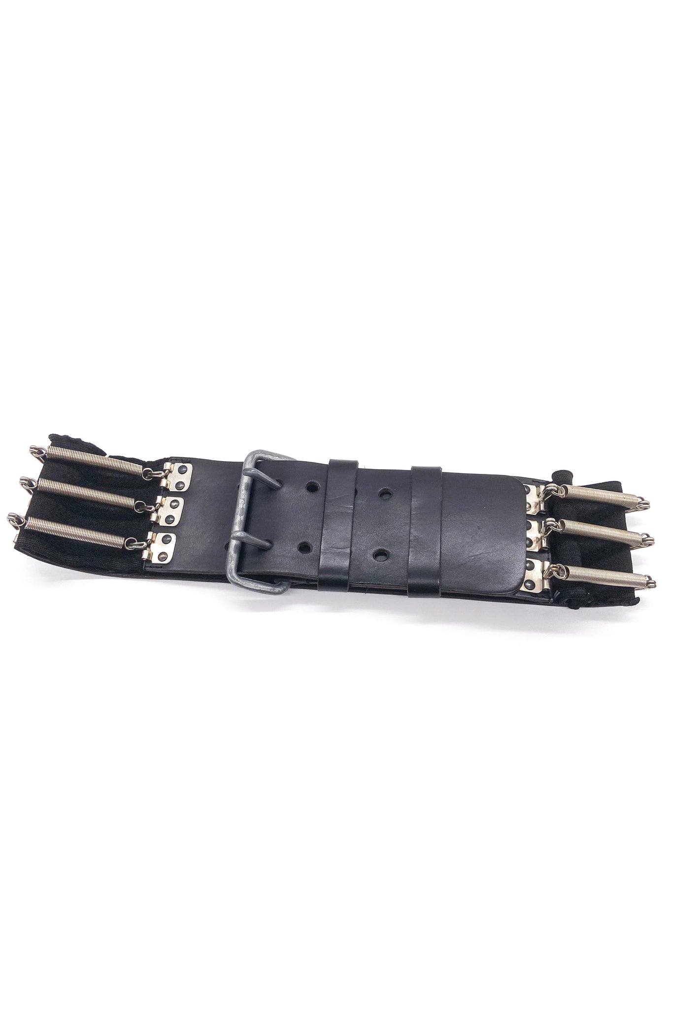 A Jean Paul Gaultier black leather and elastic hip belt with a burnished silver toned square buckle with a double set of three different punch hole options for fit. The belt has three sets of horizontal silver hardware with connected silver-toned springs. The belt has a dystopian steam-punk feel similar to the designers work on the film Fifth Element.