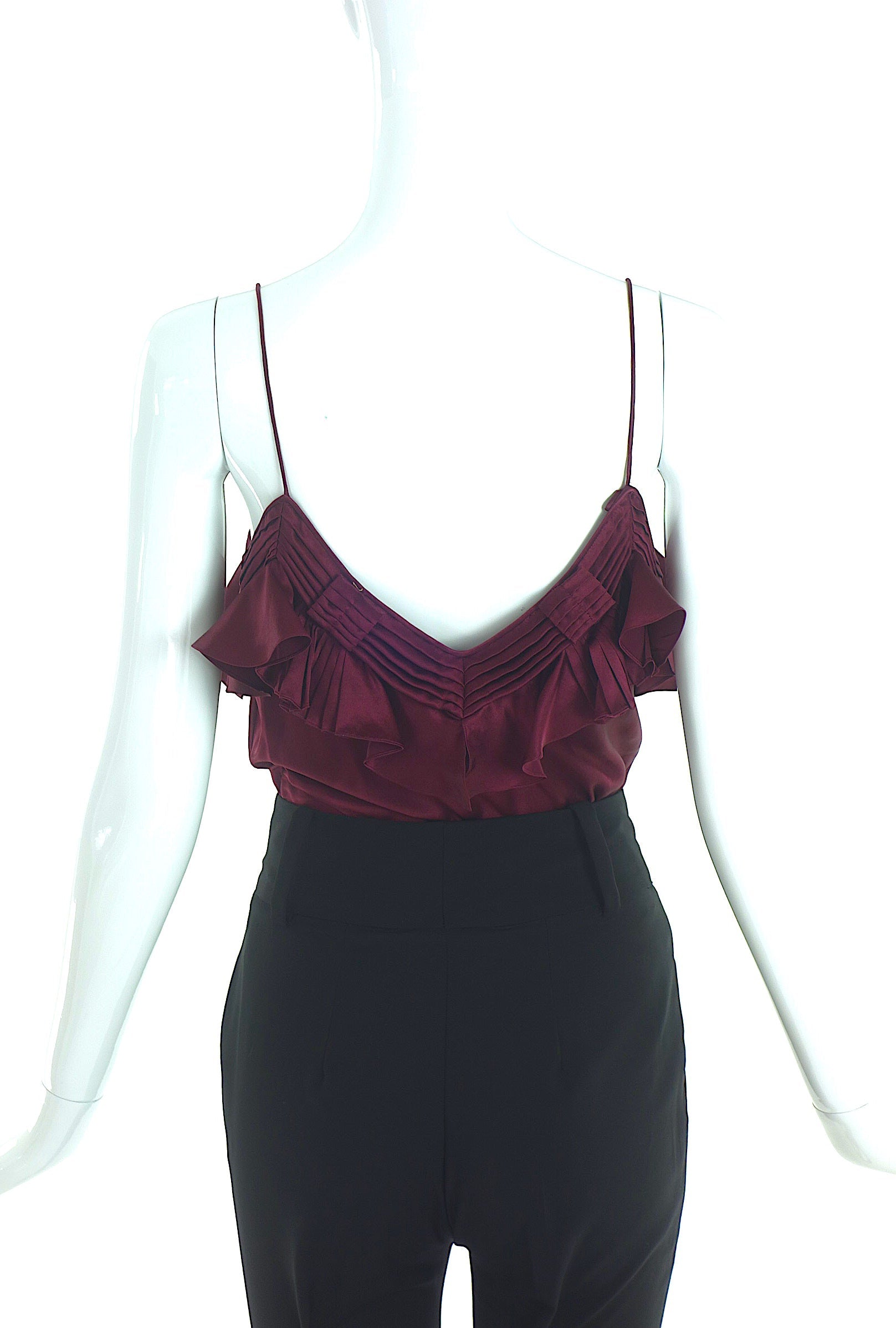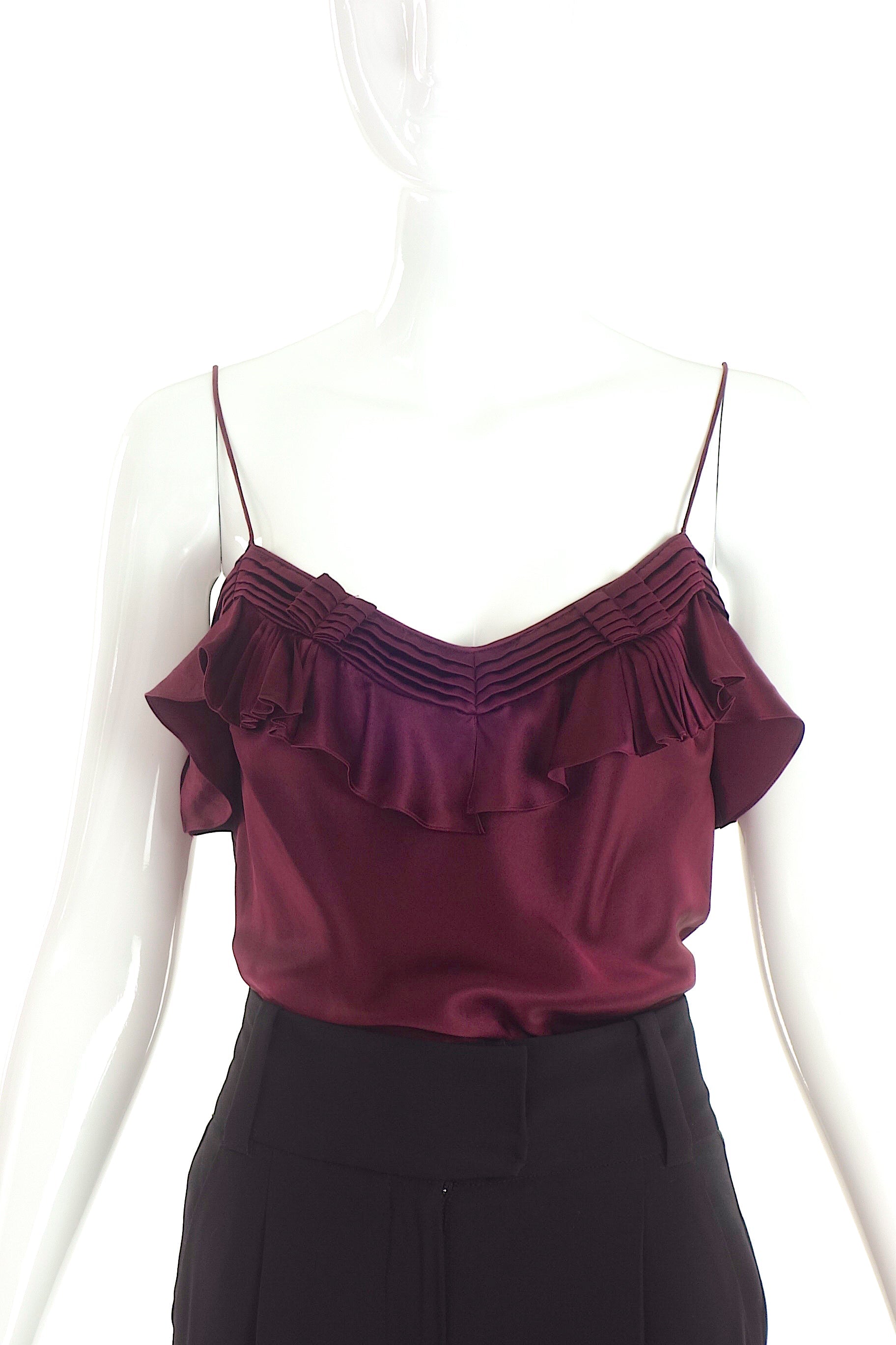 John Galliano burgundy camisole top with a pleat detail and ruffle in a zig zag shape along the top.
