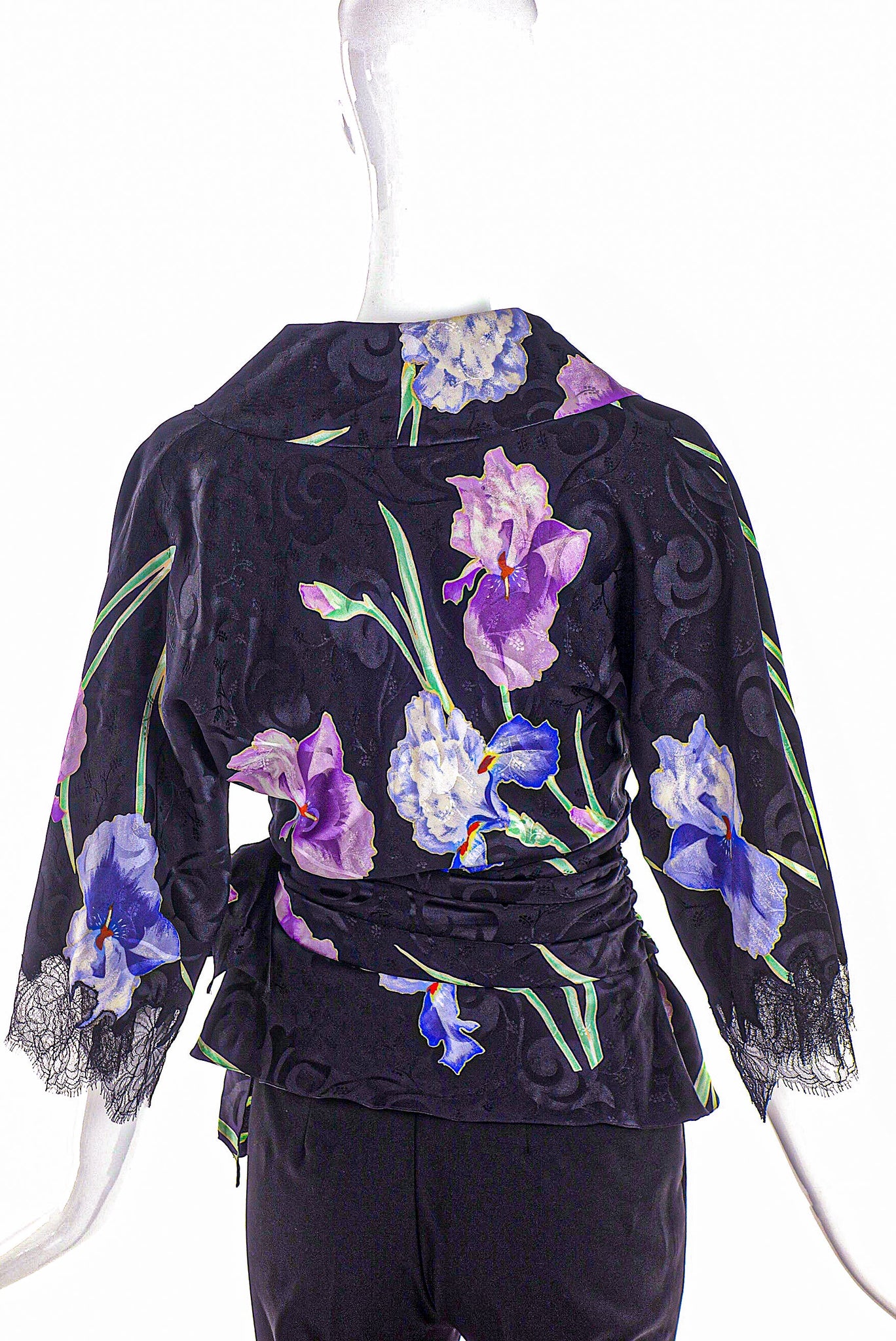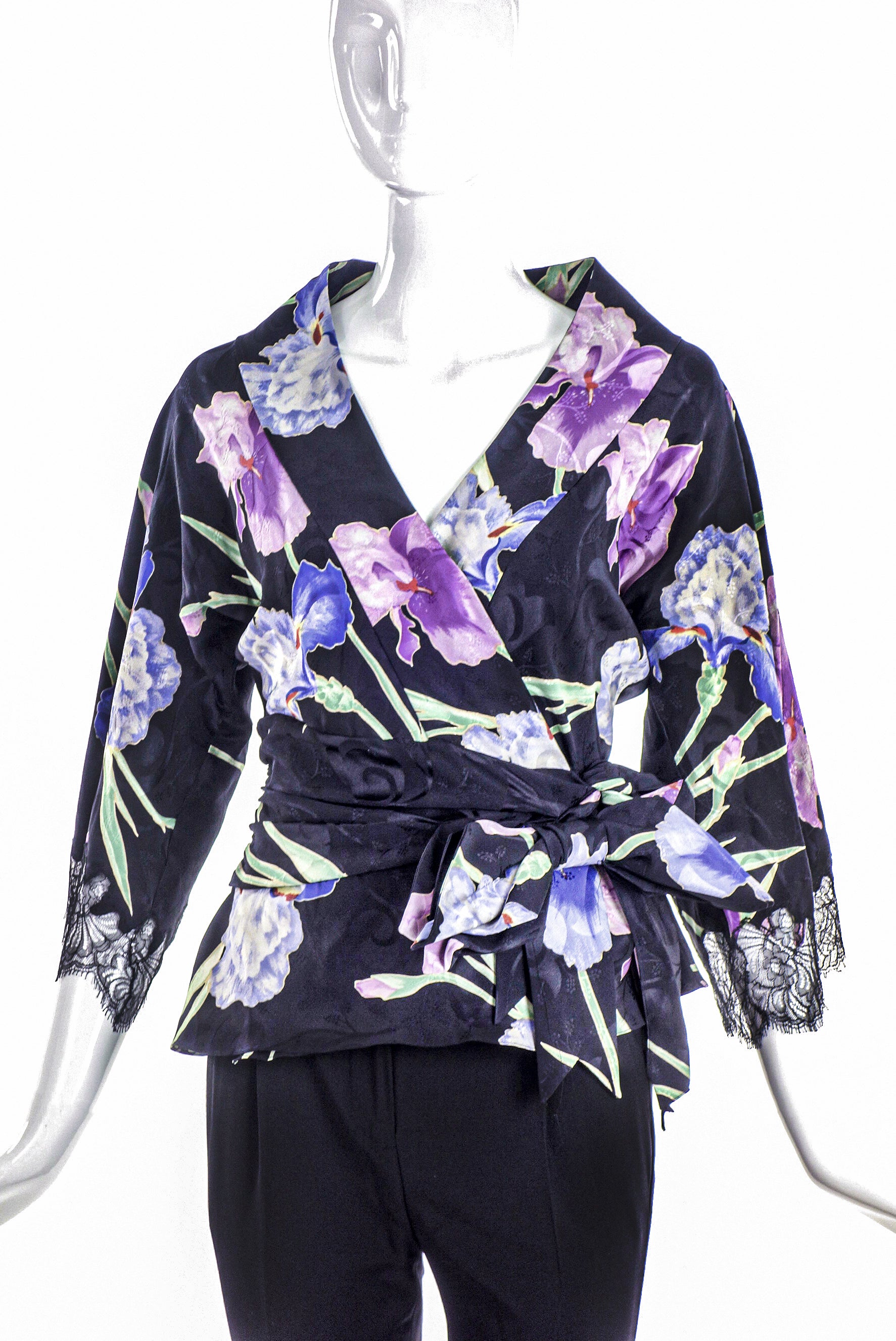 John Galliano purple and violet floral print kimono style wrap silk blouse with lace detail on the hem of the sleeve.