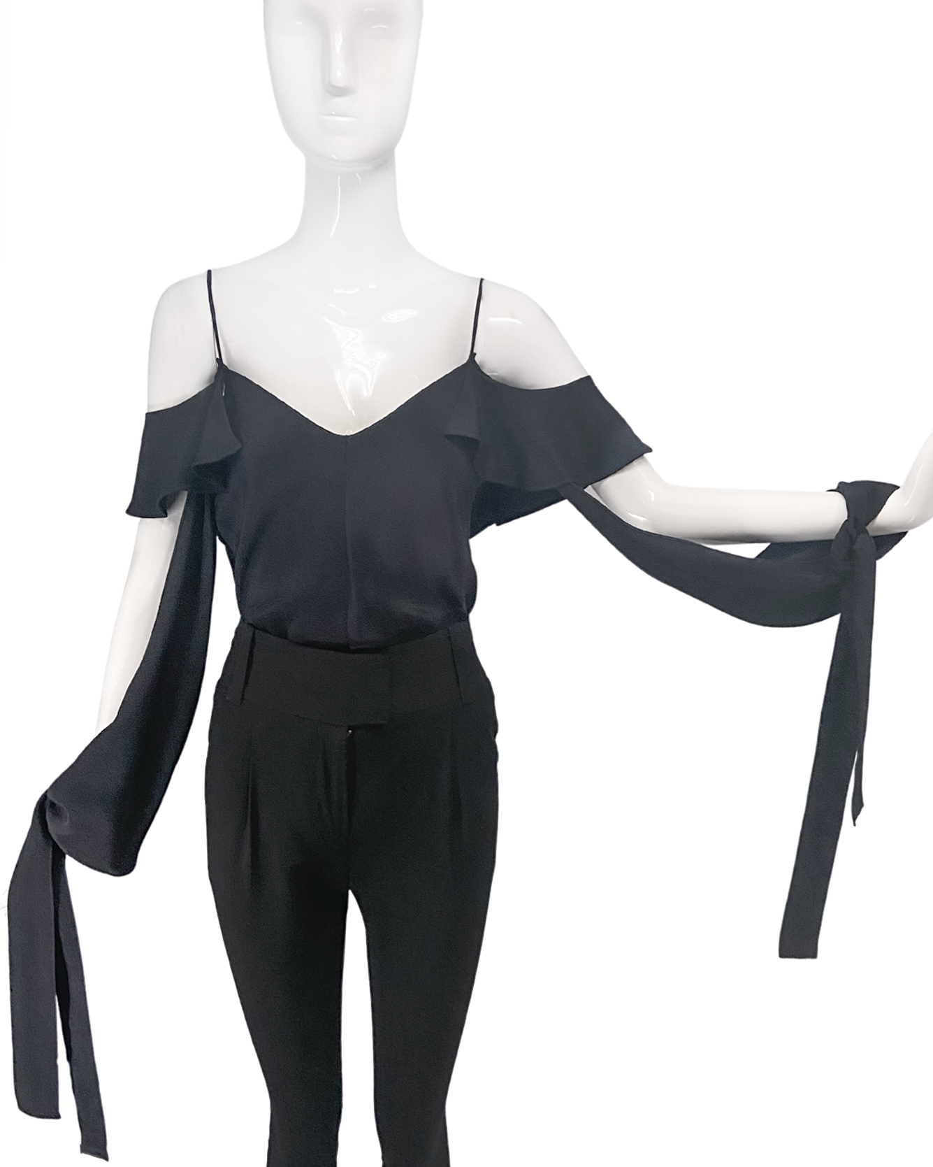 Juan Carlos Obando Black Silk Cold Shoulder Cut Out Ruffle Wrist Tie Amalfi Top