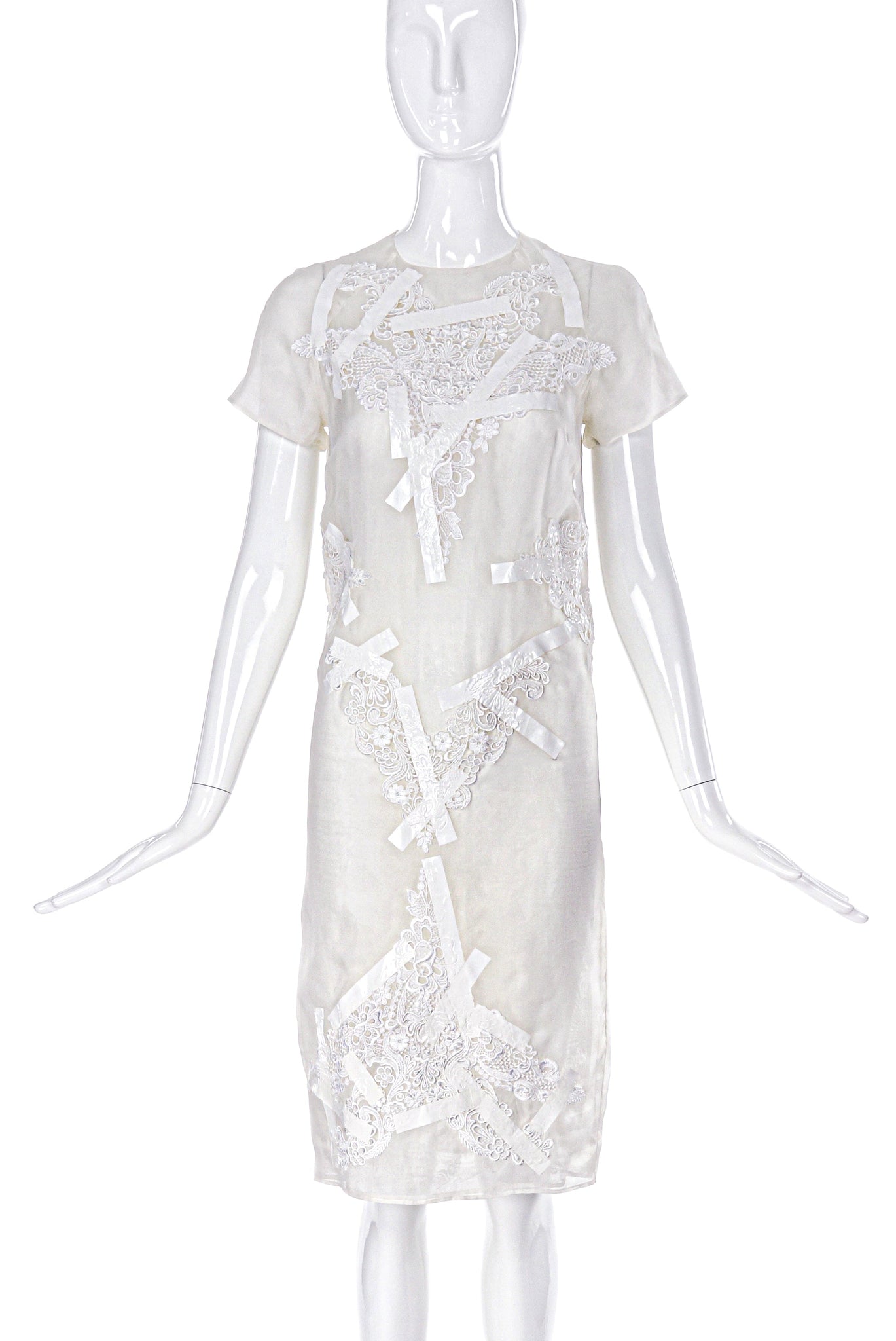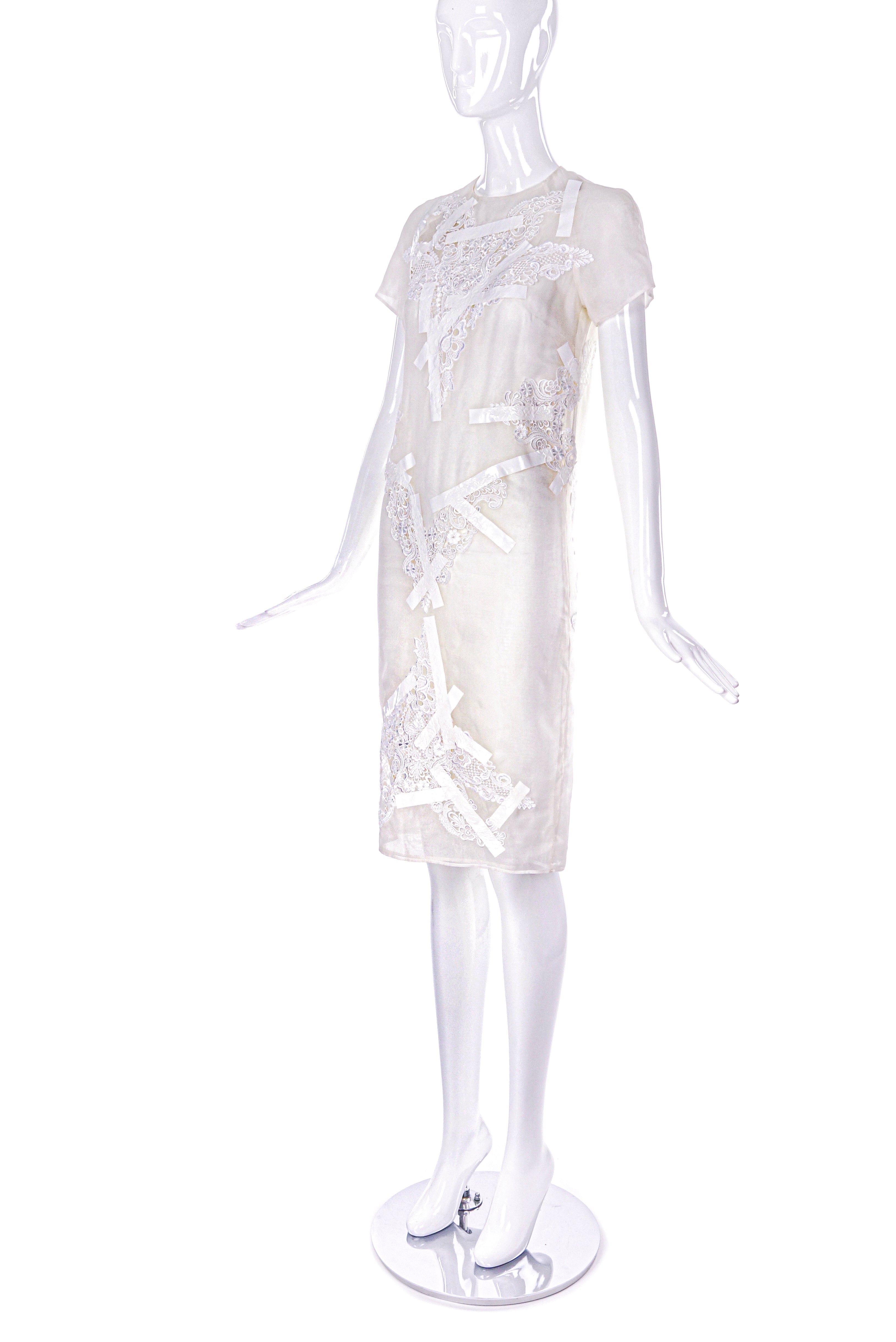 Christopher Kane White Organza Dress with Lace Appliqués and Latex Tape Strips